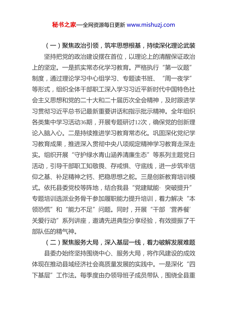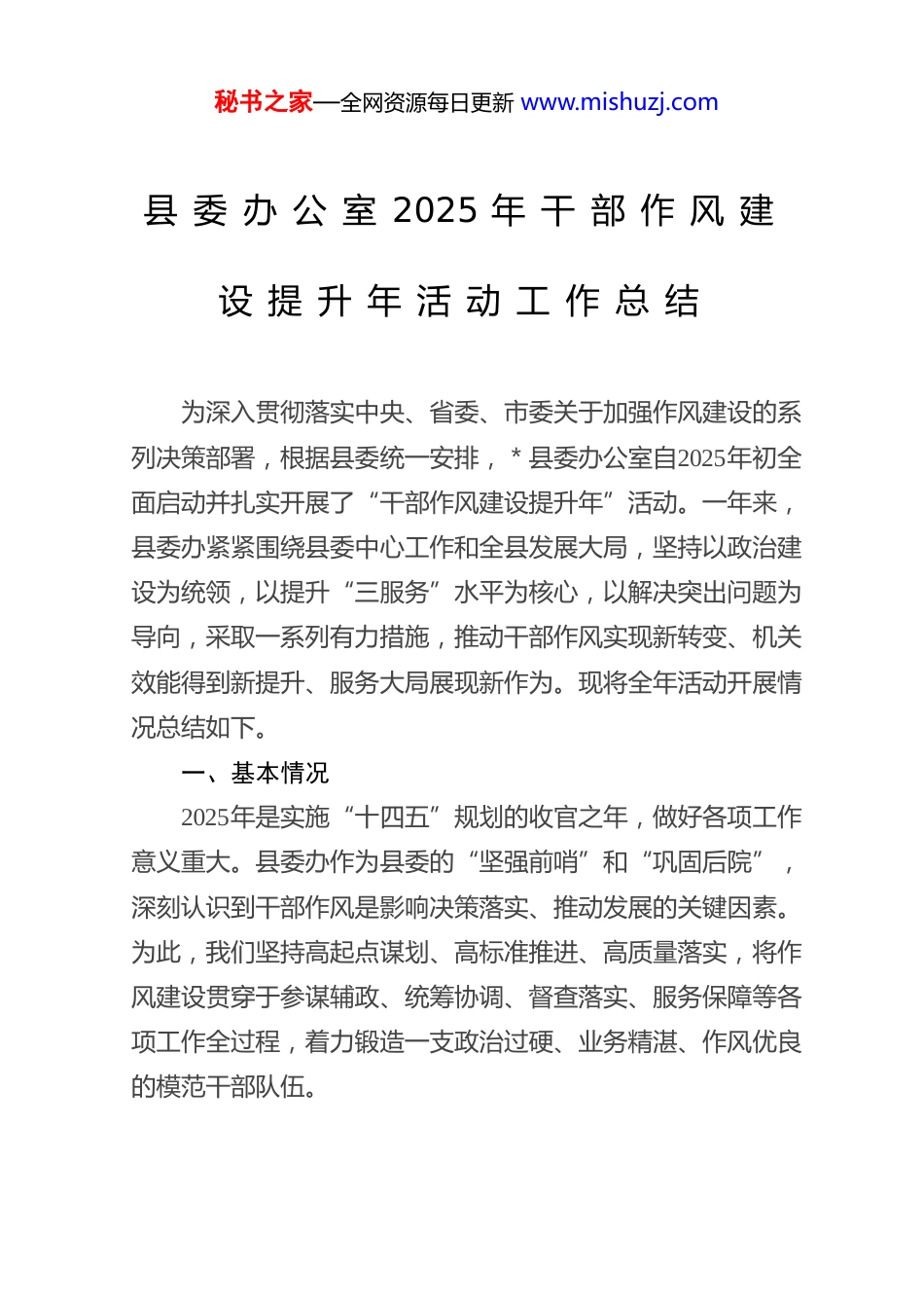 秘书之家—全网资源每日更新 www.mishuzj.com县 委 办 公 室 2025 年 干 部 作 风 建设 提 升 年 活 动 工 作 总 结为深入贯彻落实中央、省委、市委关于加强作风建设的系列决策部署,根据县委统一安排,*县委办公室自2025年初全面启动并扎实开展了“干部作风建设提升年”活动。一年来,县委办紧紧围绕县委中心工作和全县发展大局,坚持以政治建设为统领,以提升“三服务”水平为核心,以解决突出问题为导向,采取一系列有力措施,推动干部作风实现新转变、机关效能得到新提升、服务大局展现新作为。现将全年活动开展情况总结如下。一、基本情况2025年是实施“十四五”规划的收官之年,做好各项工作意义重大。县委办作为县委的“坚强前哨”和“巩固后院”,深刻认识到干部作风是影响决策落实、推动发展的关键因素。为此,我们坚持高起点谋划、高标准推进、高质量落实,将作风建设贯穿于参谋辅政、统筹协调、督查落实、服务保障等各项工作全过程,着力锻造一支政治过硬、业务精湛、作风优良的模范干部队伍。秘书之家—全网资源每日更新 www.mishuzj.com(一)聚焦政治引领,筑牢思想根基,持续深化理论武装坚持把党的政治建设摆在首位,以理论上的清醒保证政治上的坚定。一是抓实常态化学习教育。严格执行“第一议题”制度,通过理论学习中心组学习、专题读书班、“周一夜学”等形式,组织全体干部职工深入学习习近平新时代中国特色社会主义思想和党的二十大和二十届历次全会精神,及时跟进学习贯彻习近平总书记最新重要讲话和指示批示精神。全年组织各类集中学习活动36期,开展专题研讨12次,确保党的创新理论入脑入心。二是持续推进学习教育常态化。巩固深化党纪学习教育成果,推进深入贯彻中央八项规定精神学习教育走深走实。组织开展“守护绿水青山涵养清廉生态”等系列主题党日活动,引导干部职工知敬畏、存戒惧、守底线,进一步筑牢信仰之基、补足精神之钙、把稳思想之舵。三是创新教育培训模式。依托县委党校等阵地,结合我县“党建赋能· 突破提升”专题培训选派业务骨干参加履职能力提升培训,着力解决“本领恐慌”和“能力不足”问题。同时,开展“干部‘营养餐’关爱行动”系列讲座,邀请先进典型分享经验,有效提振了干部队伍的精气神。(二)聚焦服务大局,深入基层一线,着力破解发展难题县委办始终坚持围绕中心、服务大局,将作风建设的成效体现在推动县域经济社会高质量发展的实践中。一是深化“四下基层”工作法。每季度由办领导班子成员带队,围绕全县重秘书之家—全网资源每日更新 www.mishuzj.com点项目推进、乡村振兴、基层治理等核心任务,深入乡镇(街道)、村(社区)和企业开展“政策宣传下基层、听取意见下基层、调查研究下基层、工作谋划下基层”活动。全年累计开展“四下基层”活动4 期,实地走访调研点120 余个,形成高质量专题调研报告15篇,收集并推动解决基层和群众反映的急难愁盼问题185 条,用心用情用力回应了基层呼声。二是推动改革攻坚“破难”。紧盯制约我县发展的短板弱项,鼓励干部职工在优化营商环境、深化“放管服”改革等领域大胆探索、勇于创新。在县委办的牵头协调下,全年推动了7 项县级重点改革任务取得阶段性突破,相关经验做法获得市级肯定。三是提升文稿服务质效。聚焦县委重大决策部署,坚持“文经我手无差错、事交我办请放心”的标准,不断提升以文辅政水平。全年完成县委全会、经济工作会议等重大会议材料46篇,起草各类重要文稿700 余份,为县委科学决策、精准施策提供了坚实支撑。(三)聚焦效能提升,严格监督管理,锻造勤廉双优模范机关坚持向管理要效能、向纪律要战力,不断完善内部管理机制,推动机关运行提速增效。一是强化制度刚性执行。修订完善了考勤管理、会议管理、公文办理、保密工作等12项内部管理制度,并将其执行情况纳入干部日常考核。通过“线上+线下”相结合的方式,利用信息化手段加强对干部在岗履职情况秘书之家—全网资源每日更新 www.mishuzj.com的监督,有效杜绝了“庸懒散慢浮混”等现象。二是常态化开展效能督查。办机关纪委牵头,定期不定期对干部上下班纪律、值...