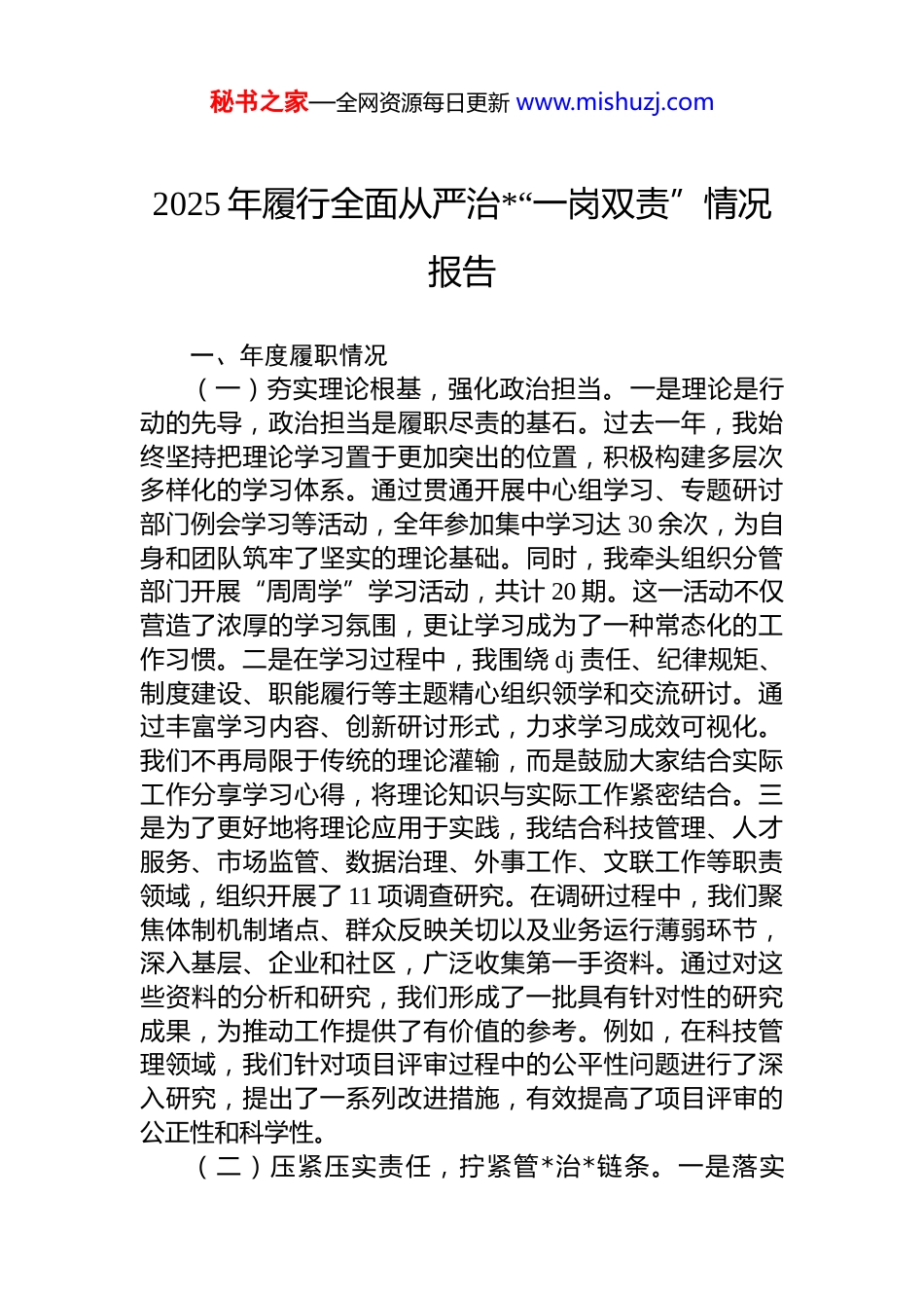 秘书之家—全网资源每日更新 www.mishuzj.com2025 年履行全面从严治*“一岗双责”情况报告一、年度履职情况(一)夯实理论根基,强化政治担当。一是理论是行动的先导,政治担当是履职尽责的基石。过去一年,我始终坚持把理论学习置于更加突出的位置,积极构建多层次多样化的学习体系。通过贯通开展中心组学习、专题研讨部门例会学习等活动,全年参加集中学习达 30 余次,为自身和团队筑牢了坚实的理论基础。同时,我牵头组织分管部门开展“周周学”学习活动,共计 20 期。这一活动不仅营造了浓厚的学习氛围,更让学习成为了一种常态化的工作习惯。二是在学习过程中,我围绕 dj 责任、纪律规矩、制度建设、职能履行等主题精心组织领学和交流研讨。通过丰富学习内容、创新研讨形式,力求学习成效可视化。我们不再局限于传统的理论灌输,而是鼓励大家结合实际工作分享学习心得,将理论知识与实际工作紧密结合。三是为了更好地将理论应用于实践,我结合科技管理、人才服务、市场监管、数据治理、外事工作、文联工作等职责领域,组织开展了 11 项调查研究。在调研过程中,我们聚焦体制机制堵点、群众反映关切以及业务运行薄弱环节,深入基层、企业和社区,广泛收集第一手资料。通过对这些资料的分析和研究,我们形成了一批具有针对性的研究成果,为推动工作提供了有价值的参考。例如,在科技管理领域,我们针对项目评审过程中的公平性问题进行了深入研究,提出了一系列改进措施,有效提高了项目评审的公正性和科学性。(二)压紧压实责任,拧紧管*治*链条。一是落实秘书之家—全网资源每日更新 www.mishuzj.com“一岗双责”是全面从严治*的重要要求,也是我履职的首要任务。年初,我与分管部门逐一签订责任书,明确了责任事项、工作目标和考核要求,将管*治*责任层层分解,确保责任落实到每个部门、每个岗位。二是在工作中,我坚持把 dj 工作与业务工作同步谋划、同步部署、同步推进在业务推进会、专题调度会中,我都会同步安排*风廉政建设内容,做到两手抓、两促进。通过这种方式,让 dj 工作与业务工作相互融合、相互促进,避免出现“两张皮”现象。三是为了加强对干部的教育和监督,全年我开展廉政谈话 60 余人次。谈话对象涵盖了班子成员、重点岗位人员等,谈话方式既有提醒式、关怀式,也有预防式。通过廉政谈话,及时发现干部存在的问题和不足,做到抓早抓小防微杜渐。同时,我常态化听取部门主体责任落实情况汇报,对发现的苗头性问题和倾向性风险及时指出,并督促整改。通过这种方式,推动责任层层传导、环环压实。此外,我主动支持驻部门纪检监察机构开展监督检查,定期与他们沟通情况、共同分析研判风险。通过加强协作配合形成了监督合力,有效提高了监督执纪的效率和效果。(三)持续改进作风,推动营商环境加速优化。一是作风建设是*的建设的重要内容,也是推动各项工作顺利开展的重要保障。我坚持把作风建设融入分管业务全过程,积极倡导“一线工作法”。全年深入基层、企业、社区调研 40 余次,与基层干部、企业负责人和群众面对面交流,了解他们的需求和困难,推动解决政策兑现、科技服务、人才落户、市场监管等方面的突出问题。二是针对企业反映较多的多头检查、重复抽查等问题,我推动市场监管部门整合执法力量,建立“综合查一次”机制。这一机制的建立,有效减少了对企业正常经营的干扰,提高了执法效率,得到了上级部门的肯定。同时,我牵头建立分管领域12345 工单及群众诉求“周研判、月通报”机制,及时掌握群众反映的问题和诉求,并协调相关部门进行解决。今年秘书之家—全网资源每日更新 www.mishuzj.com以来,共协调解决群众反映较为强烈的问题 20 余件,有效提升了市场主体和群众的满意度。(四)强化监督管理,扎紧制度防线。一是为了有效防范廉政风险,我聚焦科技项目管理、人才评价、人社业务办理、市场监管执法、数据安全管理、外事经费使用等关键业务链条,组织开展了分管领域廉政风险全覆盖排查通过深入分析业务流程,查找制度薄弱点、流程风险点和岗位敏感点,推动形成了风险清单及防控措施。二是在排查过程中,我督促科技管理...