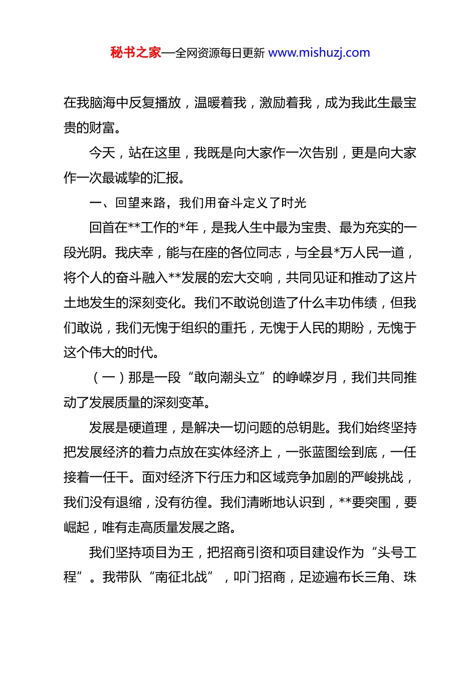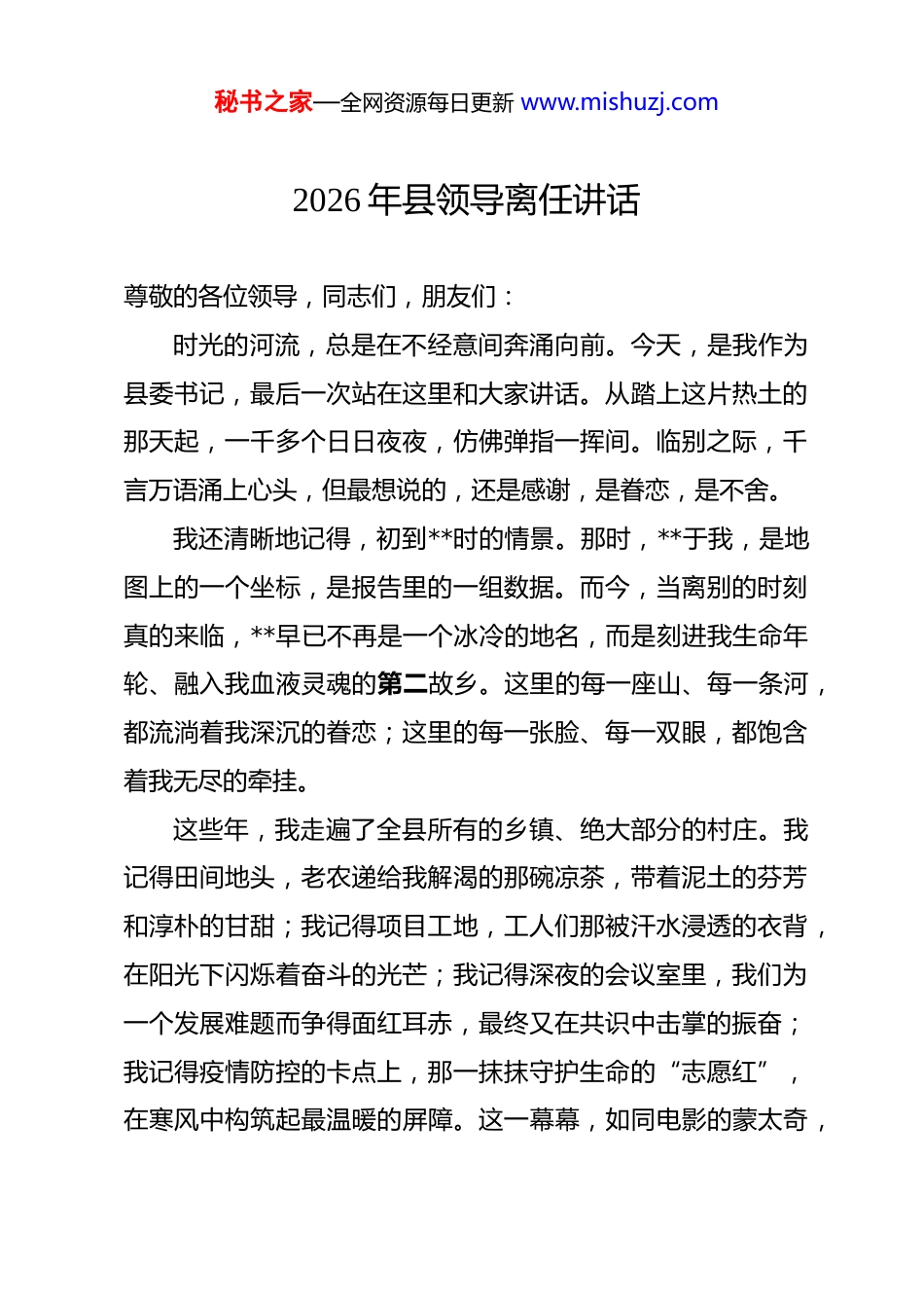 秘书之家—全网资源每日更新 www.mishuzj.com2026 年县领导离任讲话 尊敬的各位领导,同志们,朋友们:时光的河流,总是在不经意间奔涌向前。今天,是我作为县委书记,最后一次站在这里和大家讲话。从踏上这片热土的那天起,一千多个日日夜夜,仿佛弹指一挥间。临别之际,千言万语涌上心头,但最想说的,还是感谢,是眷恋,是不舍。我还清晰地记得,初到**时的情景。那时,**于我,是地图上的一个坐标,是报告里的一组数据。而今,当离别的时刻真的来临,**早已不再是一个冰冷的地名,而是刻进我生命年轮、融入我血液灵魂的第二故乡。这里的每一座山、每一条河,都流淌着我深沉的眷恋;这里的每一张脸、每一双眼,都饱含着我无尽的牵挂。这些年,我走遍了全县所有的乡镇、绝大部分的村庄。我记得田间地头,老农递给我解渴的那碗凉茶,带着泥土的芬芳和淳朴的甘甜;我记得项目工地,工人们那被汗水浸透的衣背,在阳光下闪烁着奋斗的光芒;我记得深夜的会议室里,我们为一个发展难题而争得面红耳赤,最终又在共识中击掌的振奋;我记得疫情防控的卡点上,那一抹抹守护生命的“志愿红”,在寒风中构筑起最温暖的屏障。这一幕幕,如同电影的蒙太奇,秘书之家—全网资源每日更新 www.mishuzj.com在我脑海中反复播放,温暖着我,激励着我,成为我此生最宝贵的财富。今天,站在这里,我既是向大家作一次告别,更是向大家作一次最诚挚的汇报。一、回望来路,我们用奋斗定义了时光回首在**工作的*年,是我人生中最为宝贵、最为充实的一段光阴。我庆幸,能与在座的各位同志,与全县*万人民一道,将个人的奋斗融入**发展的宏大交响,共同见证和推动了这片土地发生的深刻变化。我们不敢说创造了什么丰功伟绩,但我们敢说,我们无愧于组织的重托,无愧于人民的期盼,无愧于这个伟大的时代。(一)那是一段“敢向潮头立”的峥嵘岁月,我们共同推动了发展质量的深刻变革。发展是硬道理,是解决一切问题的总钥匙。我们始终坚持把发展经济的着力点放在实体经济上,一张蓝图绘到底,一任接着一任干。面对经济下行压力和区域竞争加剧的严峻挑战,我们没有退缩,没有彷徨。我们清晰地认识到,**要突围,要崛起,唯有走高质量发展之路。我们坚持项目为王,把招商引资和项目建设作为“头号工程”。我带队“南征北战”,叩门招商,足迹遍布长三角、珠秘书之家—全网资源每日更新 www.mishuzj.com三角。我至今记得,为了争取**新能源项目,我们*天内*次登门拜访,用我们的诚意和专业的规划打动了客商。如今,看着项目园区里林立的厂房和穿梭的车辆,我知道,所有的付出都是值得的。这几年,我们累计引进亿元以上项目*个,总投资超*亿元。工业园区从一片荒芜到厂房林立,高新技术产业从无到有、从有到优,全县规上工业增加值年均增长*%,税收收入连续*年实现两位数增长。这背后,是无数个“灯火通明”的夜晚,是无数干部“跑断腿、磨破嘴”的艰辛。我们坚持创新驱动,为传统产业插上“数字翅膀”。我们成立了*亿元的产业创新发展基金,引导*家传统企业实施智能化改造和数字化转型,看到老企业焕发新生机,看到“**制造”迈向“**智造”,我们由衷地感到自豪。我们培育的**新材料产业集群,成功入选省级重点产业集群,成为**经济一张闪亮的新名片。(二)那是一幅“绘就山乡美”的深情画卷,我们共同见证了城乡面貌的深刻变迁。我始终认为,一个地方的发展,不仅要有“高楼大厦”,更要有“绿水青山”;不仅要“口袋鼓”,更要“风景美”。我们深入践行“绿水青山就是金山银山”的理念,学习运用“千万工程”经验,一体推进乡村发展、乡村建设、乡村治理。秘书之家—全网资源每日更新 www.mishuzj.com我们以前所未有的力度推进人居环境整治。从“垃圾不落地”到“污水不入河”,从“厕所革命”到“庭院革命”,我们像绣花一样治理着我们的家园。我曾多次不打招呼,随机到村里暗访,看到过去“脏乱差”的村庄变成了“洁净美”的公园,看到乡亲们脸上洋溢的笑容,我内心无比欣慰。这几年,我们成功创建省级美丽乡村示范村*个,“四好农村路”总里程达到*公里,实现了“出门水泥路,抬脚上公交”的梦想。我...