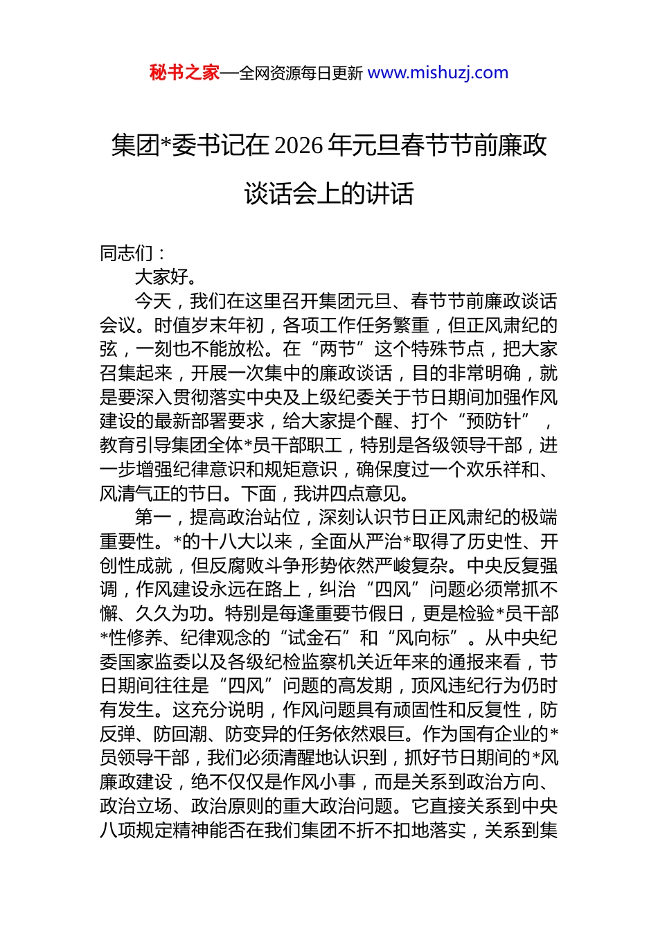 秘书之家—全网资源每日更新 www.mishuzj.com集团*委书记在 2026 年元旦春节节前廉政谈话会上的讲话同志们:大家好。今天,我们在这里召开集团元旦、春节节前廉政谈话会议。时值岁末年初,各项工作任务繁重,但正风肃纪的弦,一刻也不能放松。在“两节”这个特殊节点,把大家召集起来,开展一次集中的廉政谈话,目的非常明确,就是要深入贯彻落实中央及上级纪委关于节日期间加强作风建设的最新部署要求,给大家提个醒、打个“预防针”,教育引导集团全体*员干部职工,特别是各级领导干部,进一步增强纪律意识和规矩意识,确保度过一个欢乐祥和、风清气正的节日。下面,我讲四点意见。第一,提高政治站位,深刻认识节日正风肃纪的极端重要性。*的十八大以来,全面从严治*取得了历史性、开创性成就,但反腐败斗争形势依然严峻复杂。中央反复强调,作风建设永远在路上,纠治“四风”问题必须常抓不懈、久久为功。特别是每逢重要节假日,更是检验*员干部*性修养、纪律观念的“试金石”和“风向标”。从中央纪委国家监委以及各级纪检监察机关近年来的通报来看,节日期间往往是“四风”问题的高发期,顶风违纪行为仍时有发生。这充分说明,作风问题具有顽固性和反复性,防反弹、防回潮、防变异的任务依然艰巨。作为国有企业的*员领导干部,我们必须清醒地认识到,抓好节日期间的*风廉政建设,绝不仅仅是作风小事,而是关系到政治方向、政治立场、政治原则的重大政治问题。它直接关系到中央八项规定精神能否在我们集团不折不扣地落实,关系到集秘书之家—全网资源每日更新 www.mishuzj.com团*委全面从严治*的责任能否层层压实,更关系到集团在高质量发展道路上能否行稳致远。2025 年是集团“十四五”规划的收官之年,我们各项重点工作,如关键核心技术攻关、重大工程项目建设等,都处在攻坚克难的关键阶段。在这样的背景下,任何作风上的松懈、纪律上的“跑偏”,都可能成为侵蚀集团健康肌体的“蚁穴”,甚至引发“廉洁风险”这个最大的经营风险。因此,全体同志,尤其是各部室、各单位的负责同志,必须站在捍卫“两个确立”、做到“两个维护”的政治高度,深刻认识到,过一个廉洁的节日,就是守护集团的发展成果,就是对*和人民事业的绝对忠诚。第二,保持清醒头脑,精准把握节日期间的纪律红线。纪律是带电的“高压线”,规矩是不可逾越的“警戒线”节日期间,人情往来增多,各种诱惑和考验也随之而来。越是在这个时候,越要头脑清醒、立场坚定,做到心有所畏、言有所戒、行有所止。根据上级纪委相关文件精神和近年来通报的典型案例,这里重点强调几条必须坚守的纪律红线:一是严禁违规收送礼品礼金。这是节日期间最易发多发的问题。要坚决杜绝收送各种名义的现金、购物卡有价证券、支付凭证和电子红包等。尤其要警惕“四风”问题隐形变异的新动向,比如通过快递物流收送礼品、以“提货券”代替实物、借助电商平台“隔空”送礼等。这些看似隐蔽的手段,在精准的监督检查面前都将无所遁形二是严禁违规吃喝和接受宴请。坚决抵制“不吃公款吃老板”、出入私人会所、在单位内部食堂和培训中心搞奢侈浪费等违规吃喝行为。对于管理和服务对象、项目合作方等安排的可能影响公正执行公务的宴请,必须旗帜鲜明地拒绝。近期,中央纪委国家监委就通报了某国有企业下属公司领导班子,在项目竣工后接受施工单位安排的高档宴请及娱乐活动,最终多人受到 dj 政务处分的案例,教训极为深刻。三是严禁公车私用和私车公养。节日期间,集团秘书之家—全网资源每日更新 www.mishuzj.com的公务用车除值班和特殊工作需要外,一律按规定封存停放。严禁私自驾驶公车探亲访友、外出旅游、接送子女等同时,也要杜绝利用职务之便,将个人车辆的燃油、维修保险等费用在单位报销或转嫁给下属单位、服务对象的“私车公养”行为。四是严禁公款旅游及违规组织节庆活动。严禁借节日之机,以学习培训、考察调研、职工疗养等名义变相公款旅游。同样,也不得违规使用公款组织举办年会、团拜、联欢等活动,或者滥发津贴、补贴、奖金和实物。这些红线,每一位同志都必须内化于心、外化于行。决不能抱有“就这一次,下不...