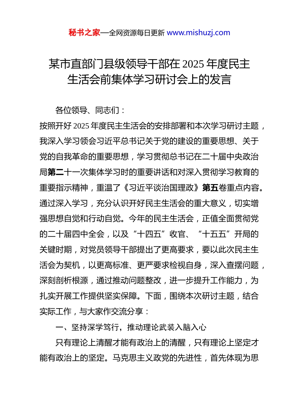 秘书之家—全网资源每日更新 www.mishuzj.com某市直部门县级领导干部在 2025 年度民主生活会前集体学习研讨会上的发言 各位领导、同志们: 按照开好 2025 年度民主生活会的安排部署和本次学习研讨主题,我深入学习领会习近平总书记关于党的建设的重要思想、关于党的自我革命的重要思想,学习贯彻总书记在二十届中央政治局第二十一次集体学习时的重要讲话和对深入贯彻学习教育的重要指示精神,重温了《习近平谈治国理政》第五卷重点内容。通过深入学习,充分认识开好民主生活会的重大意义,切实增强思想自觉和行动自觉。今年的民主生活会,正值全面贯彻党的二十届四中全会,以及“十四五”收官、“十五五”开局的关键时期,对党员领导干部提出了更高要求,要以此次民主生活会为契机,以更高标准、更严要求检视自身,深入查摆问题,深刻剖析根源,通过推动问题整改,进一步提升工作能力,为扎实开展工作提供坚实保障。下面,围绕本次研讨主题,结合实际工作,与大家作交流分享:一、坚持深学笃行,推动理论武装入脑入心只有理论上清醒才能有政治上的清醒,只有理论上坚定才能有政治上的坚定。马克思主义政党的先进性,首先体现为思秘书之家—全网资源每日更新 www.mishuzj.com想理论上的先进性。只有坚持思想建党、理论强党,不忘初心才能更加自觉,担当使命才能更加坚定。把学习贯彻党的创新理论作为思想武装重中之重,就要在真学真懂真信真用上下更大气力。如果身子进了新时代,思想还停留在过去,看问题、作决策、推工作还是老观念、老套路、老办法,不仅会跟不上时代、做不好工作,而且会贻误时机、耽误工作。作为党员领导干部,必须必须紧跟时代步伐,不断更新知识体系,提升理论素养,切实把党的创新理论转化为推动工作的强大动力。(一)持续深入学习,强化政治自觉。习近平总书记关于作风建设的重要讲话更是为我们加强党性修养、提升政治能力指明了方向。我们要深刻体悟习近平总书记“我将无我、不负人民”“得罪千百人、不负十四亿”的境界情怀,把学习领悟习近平总书记关于党的自我革命的重要思想作为政治追求、工作方式、生活习惯,进一步增强对这一重要思想的政治认同、思想认同、理论认同、情感认同。深刻体悟牢记全面从严治党永远在路上、党的自我革命永远在路上的深远意蕴,时刻保持解决大党独有难题的清醒和坚定,进一步增强以党的自我革命引领伟大社会革命的责任感使命感。要坚持把学习理论武装和纪律锤炼作为终身课题,时刻以党规党纪为标尺从严从实检身正己,使铁的纪律真正内化为日用而不觉的言行准则,筑牢拒秘书之家—全网资源每日更新 www.mishuzj.com腐防变的思想防线。以正视问题的勇气和刀刃向内的自觉,强化自我监督、自我管理、自我约束、自我净化,保持高度政治敏锐性和鉴别力,让各项工作体现政治导向、符合政治要求,持以问题为导向,深入查摆思想根源,不断提振善谋善干善成的精气神。(二)持续深学细悟,强化思想自觉。思想改造,是党员进行思想净化与政治锻造的过程,不仅关乎个人修养,更关乎党的性质宗旨、事业兴衰成败。作为党员干部,一旦放松思想改造,各种拜金主义、享乐主义、特权思想等错误思想就会趁虚而入,必将导致理想信念动摇、宗旨意识淡薄、脱离人民群众,最终危及党的执政根基。要通过思想改造剔除错误思想,筑牢信仰之基、补足精神之钙、把稳思想之舵,保持无产阶级政党的政治本色。要洞察时代变迁、回应现实挑战、解决发展难题,在解放思想、引领时代中推动社会主义现代化建设向前发展。始终站稳人民立场,从思想源头上剔除腐朽思想,抵制不正之风,不断检视自身在理想信念、思想作风、纪律意识等方面的差距,从而赢得人民的信任和拥护,不断筑牢党的执政根基。善于从党的创新理论中寻找方法路径,熟练掌握蕴含其中的领导方法、思想方法和工作方法,边学边干、学用相长,不断增强工作的科学性、预见性、主动性、创造性。自觉从党秘书之家—全网资源每日更新 www.mishuzj.com的创新理论中激发担当精神,用好用活党的创新理论这一强大思想武器,用以观察新形势、研究新情况、解决新问题,以敢于斗争、善于斗争的勇气和...