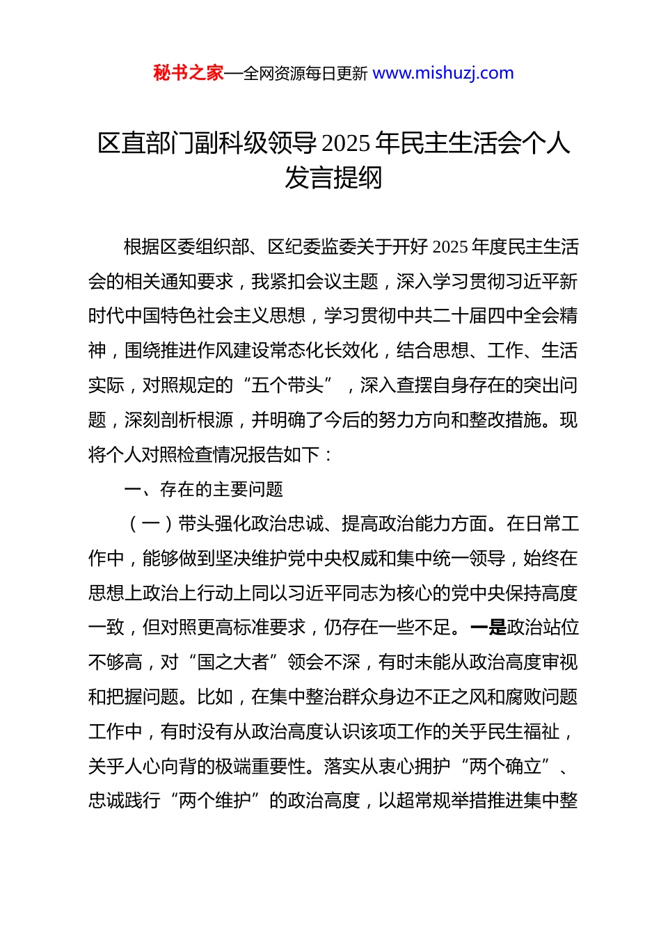 秘书之家—全网资源每日更新 www.mishuzj.com区直部门副科级领导 2025 年民主生活会个人发言提纲 根据区委组织部、区纪委监委关于开好 2025 年度民主生活会的相关通知要求,我紧扣会议主题,深入学习贯彻习近平新时代中国特色社会主义思想,学习贯彻中共二十届四中全会精神,围绕推进作风建设常态化长效化,结合思想、工作、生活实际,对照规定的“五个带头”,深入查摆自身存在的突出问题,深刻剖析根源,并明确了今后的努力方向和整改措施。现将个人对照检查情况报告如下:一、存在的主要问题(一)带头强化政治忠诚、提高政治能力方面。在日常工作中,能够做到坚决维护党中央权威和集中统一领导,始终在思想上政治上行动上同以习近平同志为核心的党中央保持高度一致,但对照更高标准要求,仍存在一些不足。一是政治站位不够高,对“国之大者”领会不深,有时未能从政治高度审视和把握问题。比如,在集中整治群众身边不正之风和腐败问题工作中,有时没有从政治高度认识该项工作的关乎民生福祉,关乎人心向背的极端重要性。落实从衷心拥护“两个确立”、忠诚践行“两个维护”的政治高度,以超常规举措推进集中整秘书之家—全网资源每日更新 www.mishuzj.com治工作还有差距。在实际工作中,有个别指标完成不理想,实际成效不明显,存在重部署、轻督导的现象,导致个别问题整改未能及时闭环。二是政治执行力还有不到位的地方,推动工作落实缺乏一抓到底的韧劲,未能真正做到一以贯之、久久为功。比如,分管的党建工作,在推进党建工作过程中,存在时松时紧的情况,有时业务工作忙了,就对党建工作投入精力不足,存在放一放、缓一缓的现象,导致有些工足推动滞后,未能始终保持连贯性和系统性,缺乏“钉钉子”精神的持续发力,影响整体工作进度。尤其是在抓党员理论学习方面,没有严格按照学习计划执行,存在以业务学习代替政治理论学习的情况,有时学习流于形式,学习内容针对性不强,学习效果不够扎实,未能真正做到入脑入心、知行合一。(二)带头固本培元、增强党性方面。平时注重加强党性修养,坚持用党章党规来规范自己的行为,做到心有所戒,行有所止,防微杜渐。经过认真对照反思,该方面仍存在一些不足。一是党性修养的持续性不够,缺乏一以贯之的自觉性,在思想深处仍存有“歇一歇”“松口气”的惰性心理。比如,党组理论学习、党支部党建活动是增强党性的重要途径,但有时参加学习存在应付心态,没有真正沉下心来深入思考,学用结合不够紧密,用党的创新理论解决实际问题的能力有待提升。秘书之家—全网资源每日更新 www.mishuzj.com尤其是党组理论中心组学习研讨,有时业务工作忙了,没有围绕主题深入思考,发言准备不充分,存在照本宣科现象,研讨交流缺乏思想碰撞和深度剖析,未能真正触及灵魂、推动工作。二是面对一些新问题、新情况存在浮躁心理,缺乏沉下心来深入研究的耐心,有些工作落实不到位,存在虎头蛇尾现象。比如,近年来,分管领域有上到下深入推动营商环境、法治建设等方面的改革,对于改进工作方式方法,增进工作质效起到了积极作用。但是,由于自身存在惯性思维,对新理念新方法的接受和运用不够及时,没有真正沉下心研究改革措施的具体举措、要求,导致政策落实存在温差、落差,实际工作效果不理想。尤其是服务企业方面,向企业宣传政策不及时、不到位,政策解读不够深入,导致企业对惠企政策知晓率不高、享受政策红利存在滞后。(三)带头敬畏人民、敬畏组织、敬畏法纪方面。始终牢记权力来自人民,坚持把人民群众满意作为工作出发点和落脚点,自觉做到敬畏组织、服从安排,严守党的政治纪律和政治规矩。但在实际工作中,仍存在一些不足之处。一是正确政绩观树的不牢,深入基层与服务对象、群众沟通交流的次数不多,对基层实情掌握不全面。比如,分管领域出台了一些惠民惠企的政策,一方面,深入基层宣传、解读政策的次数不多,在实秘书之家—全网资源每日更新 www.mishuzj.com际走方过程中,也没有与群众、企业负责人深入交流政策落实中的堵点难点,有些政策的执行存在不到位的情况;另一方面,对政策实施效果的跟踪问效不够,尤其是对于一...