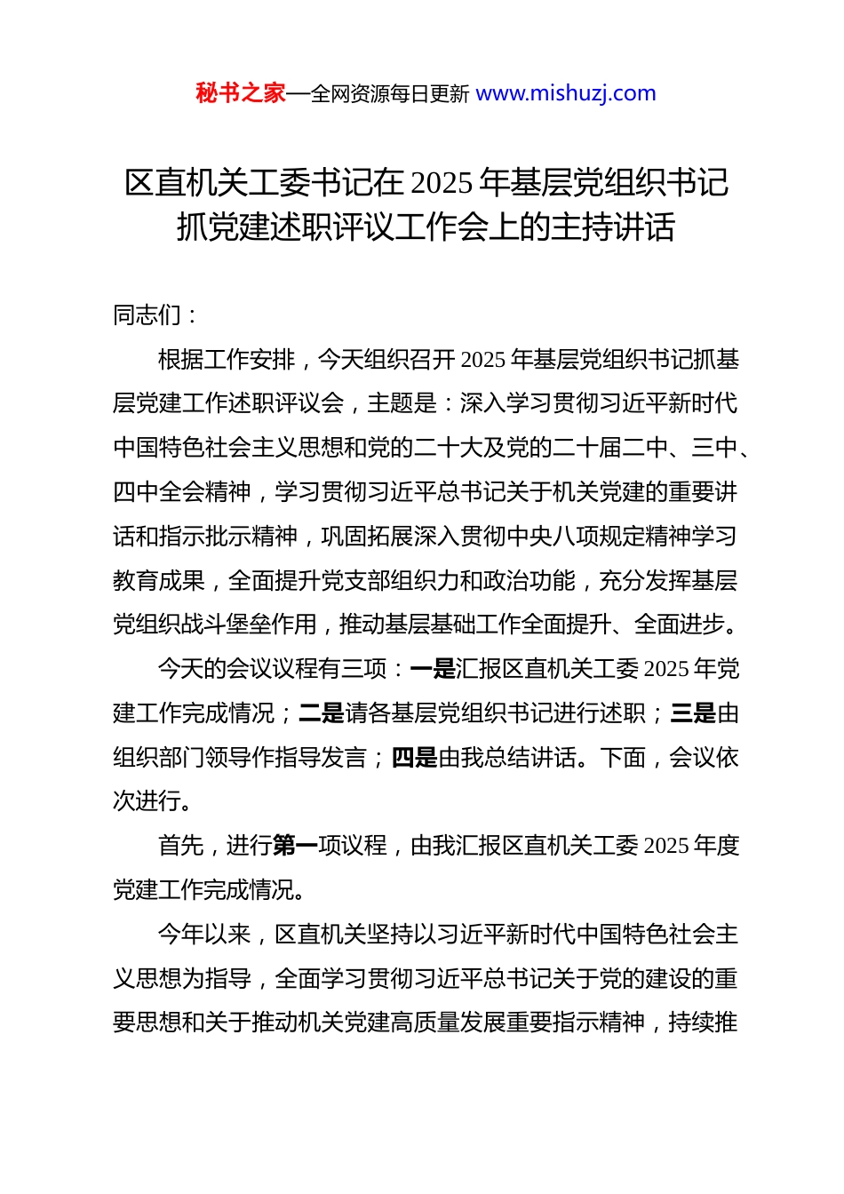 秘书之家—全网资源每日更新 www.mishuzj.com区直机关工委书记在 2025 年基层党组织书记抓党建述职评议工作会上的主持讲话 同志们:根据工作安排,今天组织召开 2025 年基层党组织书记抓基层党建工作述职评议会,主题是:深入学习贯彻习近平新时代中国特色社会主义思想和党的二十大及党的二十届二中、三中、四中全会精神,学习贯彻习近平总书记关于机关党建的重要讲话和指示批示精神,巩固拓展深入贯彻中央八项规定精神学习教育成果,全面提升党支部组织力和政治功能,充分发挥基层党组织战斗堡垒作用,推动基层基础工作全面提升、全面进步。今天的会议议程有三项:一是汇报区直机关工委 2025 年党建工作完成情况;二是请各基层党组织书记进行述职;三是由组织部门领导作指导发言;四是由我总结讲话。下面,会议依次进行。首先,进行第一项议程,由我汇报区直机关工委 2025 年度党建工作完成情况。今年以来,区直机关坚持以习近平新时代中国特色社会主义思想为指导,全面学习贯彻习近平总书记关于党的建设的重要思想和关于推动机关党建高质量发展重要指示精神,持续推秘书之家—全网资源每日更新 www.mishuzj.com动政治机关和模范机关建设,以高质量机关党建推动经济社会高质量发展。重点抓好以下三个方面工作:一是突出政治引领,深化立根铸魂。坚持以政治建设为统领,把坚定拥护“两个确立”、坚决做到“两个维护”作为根本政治要求,走好“第一方阵”的步伐更加坚定有力。持续深化理想信念教育、对党忠诚教育、政治机关意识教育,推动党员干部强化政治素养、政治担当、政治能力,组织开展全国两会宣讲进机关*场。严格落实“第一议题”制度,深入学习贯彻习近平总书记“7·9”重要讲话精神、“7·29”重要指示精神,各党委(党组)开展理论学习中心组学习*余场次,各党支部集中学习*余场次。开展深入贯彻中央八项规定精神学习教育,坚持抓在日常、融入经常,聚焦学查改一体推进,*个区直机关党组织全覆盖开展学习研讨,党组织书记讲授专题党课*场次,开展警示教育*场,完善制度*项。二是突出强基固本,夯实组织基础。坚持深化基层党建质量提升行动,加强党支部标准化规范化建设,在推进模范机关和“四强”党支部建设上持续用力、久久为功,机关党组织政治功能和组织功能不断增强。组织召开*次机关工委委员会议,研究谋划机关党建工作,通过调研指导、研判督促、工作提醒等方式,推动机关党建重点任务落实落细。常态化落实基层党秘书之家—全网资源每日更新 www.mishuzj.com组织按期换届提醒督促机制,指导*个党组织完成换届选举。严格落实“三会一课”、主题党日等基本制度,持续实施党务干部能力素质提升工程,培训党务干部*人。结合庆祝中国共产党成立 104 周年,组织开展重温入党誓词、颁发“光荣在党 50年”纪念章等系列活动,引导机关党员干部不忘初心、凝心聚力、不懈奋斗。三是突出互融共促,推动服务大局。坚持围绕中心抓党建、抓好党建促发展,开拓机关党建与业务工作融合发展的新局面。坚持围绕中心、服务大局,做到党建和业务工作同谋划、同部署、同落实、同考评。健全落实党员作用发挥机制,通过设立党员责任区、党员示范岗、党员示范窗口等方式,开展承诺践诺。深化党建品牌创建活动,打造有形有质有感的机关党建品牌*个,挖掘机关党建典型经验,讲好机关党建故事。坚持党建带工建、带团建、带妇建,健全完善机关基层工会、共青团、妇联组织,一体推进群团组织队伍建设。充分发挥工人阶级主人翁、青年团员生力军、妇女半边天等桥梁纽带作用,凝聚各方力量,服务和推动高质量发展。以上是区直机关 2025 年完成的重点工作,2026 年是“十五五”规划的开局之年,区直机关将坚持以习近平新时代中国特色社会主义思想为指导,紧扣高质量发展主题,持续深化党的秘书之家—全网资源每日更新 www.mishuzj.com创新理论武装,提升机关党建引领力,认真履行职责,践行使命担当,持续提高机关党建质量,为推动高质量发展、加快现代化建设贡献力量。下面进行会议第二项议程,请*、**、***等基层党组织书记作现场述职,其他党组织书记进行书面述职。这里,我特...