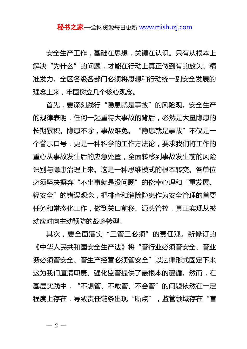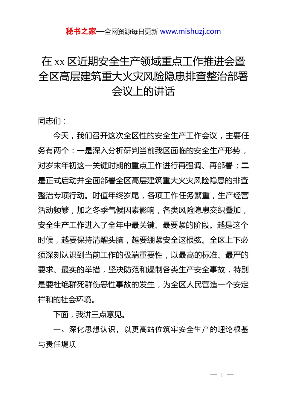 秘书之家—全网资源每日更新 www.mishuzj.com在 xx 区近期安全生产领域重点工作推进会暨全区高层建筑重大火灾风险隐患排查整治部署会议上的讲话同志们:今天,我们召开这次全区性的安全生产工作会议,主要任务有两个:一是深入分析研判当前我区面临的安全生产形势,对岁末年初这一关键时期的重点工作进行再强调、再部署;二是正式启动并全面部署全区高层建筑重大火灾风险隐患的排查整治专项行动。时值年终岁尾,各项工作任务繁重,生产经营活动频繁,加之冬季气候因素影响,各类风险隐患交织叠加,安全生产工作进入了全年中最关键、最要紧的阶段。越是这个时候,越要保持清醒头脑,越要绷紧安全这根弦。全区上下必须深刻认识到当前工作的极端重要性,以最高的标准、最严的要求、最实的举措,坚决防范和遏制各类生产安全事故,特别是要杜绝群死群伤恶性事故的发生,为全区人民营造一个安定祥和的社会环境。下面,我讲三点意见。一、深化思想认识,以更高站位筑牢安全生产的理论根基与责任堤坝— 1 —秘书之家—全网资源每日更新 www.mishuzj.com安全生产工作,基础在思想,关键在认识。只有从根本上解决“为什么”的问题,才能在行动上真正做到有的放矢、精准发力。全区各级各部门必须将思想和行动统一到安全发展的理念上来,牢固树立几个核心观念。首先,要深刻践行“隐患就是事故”的风险观。安全生产的规律表明,任何一起重特大事故的背后,必然是大量隐患的长期累积。隐患不除,事故难免。“隐患就是事故”不仅是一个警示口号,更是一种科学的工作方法论,要求我们将工作的重心从事故发生后的应急处置,全面转移到事故发生前的风险识别与隐患治理上来。这是一种思维模式的根本转变。各单位必须坚决摒弃“不出事就是没问题”的侥幸心理和“重发展、轻安全”的错误观念,把排查和消除隐患作为安全管理的首要任务和常态化工作,做到关口前移、源头管控,真正实现从被动应对向主动预防的战略转型。其次,要全面落实“三管三必须”的责任观。新修订的《中华人民共和国安全生产法》将“管行业必须管安全、管业务必须管安全、管生产经营必须管安全”以法律形式固定下来这为我们厘清职责、强化监管提供了最根本的遵循。然而,在基层实践中,“不想管、不敢管、不会管”的问题依然在一定程度上存在,导致责任链条出现“断点”,监管领域存在“盲— 2 —秘书之家—全网资源每日更新 www.mishuzj.com区”。解决这一问题的核心,在于构建一个权责清晰、分工明确、运行高效的责任体系。区安委会要牵头,各行业主管部门要主动作为,尽快研究制定并完善本行业、本领域的安全生产权力和责任清单将安全责任具体化、条目化,明确到具体机构、具体岗位、具体人员,彻底杜绝责任悬空、推诿扯皮的现象。各镇街、开发区要参照普阳街道等单位探索建立的履职报告和年度述职制度将安全生产责任履行情况作为干部考核评价的重要内容,用制度的刚性约束倒逼责任落实。最后,要系统推进“一件事”全链条的治理观。“一件事”全链条安全治理,是借鉴“高效办成一件事”的政务服务理念,应用于公共安全领域的一种系统性治理模式。其本质是打破部门壁垒,整合监管力量,针对一个具体的安全风险,从风险产生的源头到最终可能导致事故的末端,实施全过程、多主体、跨领域的协同监管。这种治理模式强调的是系统性思维和整体性作战,能够有效解决因职责交叉、监管分割而产生的“九龙治水”困境。推动“一件事”治理,关键在于用好“四张清单”,即风险清单、责任清单、措施清单和应急清单。以备受关注的电动自行车安全问题为例,从生产销售、停放充电到日常使用,涉及市场监管、工信、公安、消防、住建、城管以及街道、社区、物业等多个环节,任何一个环节的缺失都可— 3 —秘书之家—全网资源每日更新 www.mishuzj.com能导致风险链条的形成。因此,必须按照“谁主管谁牵头、谁靠近谁牵头”的原则明确一个主责部门,协调各方力量,共同对“这一件事”负责到底,形成闭环管理,从而真正斩断风险链条。二、聚焦突出问题,以更实举措抓好岁末年初的专项整治与日常防范当前及今后一个时期,全区安全生产工作...