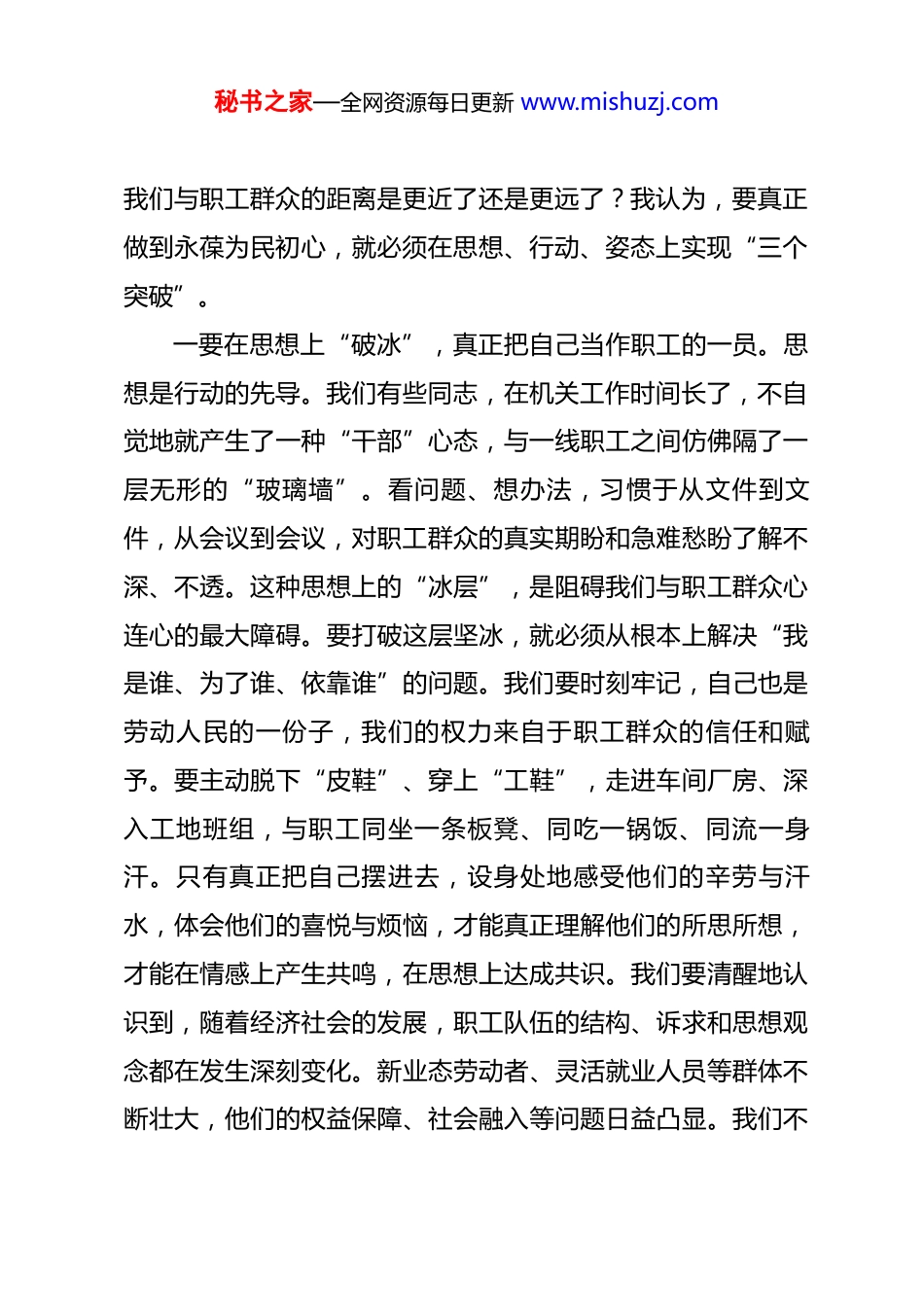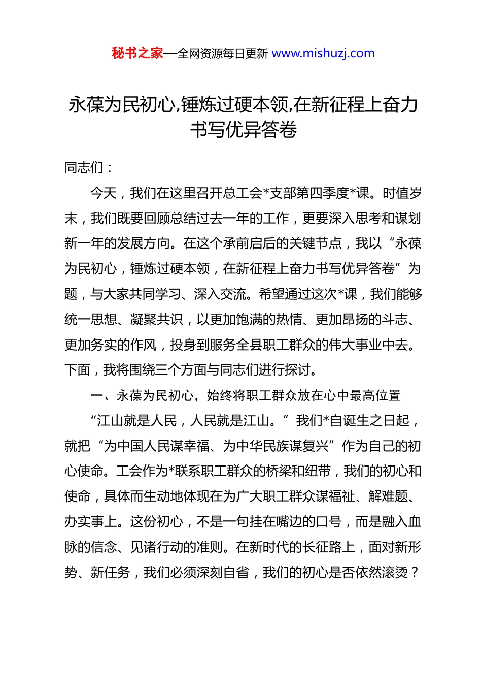 秘书之家—全网资源每日更新 www.mishuzj.com永葆为民初心,锤炼过硬本领,在新征程上奋力书写优异答卷同志们:今天,我们在这里召开总工会*支部第四季度*课。时值岁末,我们既要回顾总结过去一年的工作,更要深入思考和谋划新一年的发展方向。在这个承前启后的关键节点,我以“永葆为民初心,锤炼过硬本领,在新征程上奋力书写优异答卷”为题,与大家共同学习、深入交流。希望通过这次*课,我们能够统一思想、凝聚共识,以更加饱满的热情、更加昂扬的斗志、更加务实的作风,投身到服务全县职工群众的伟大事业中去。下面,我将围绕三个方面与同志们进行探讨。一、永葆为民初心,始终将职工群众放在心中最高位置“江山就是人民,人民就是江山。”我们*自诞生之日起,就把“为中国人民谋幸福、为中华民族谋复兴”作为自己的初心使命。工会作为*联系职工群众的桥梁和纽带,我们的初心和使命,具体而生动地体现在为广大职工群众谋福祉、解难题、办实事上。这份初心,不是一句挂在嘴边的口号,而是融入血脉的信念、见诸行动的准则。在新时代的长征路上,面对新形势、新任务,我们必须深刻自省,我们的初心是否依然滚烫?秘书之家—全网资源每日更新 www.mishuzj.com我们与职工群众的距离是更近了还是更远了?我认为,要真正做到永葆为民初心,就必须在思想、行动、姿态上实现“三个突破”。一要在思想上“破冰”,真正把自己当作职工的一员。思想是行动的先导。我们有些同志,在机关工作时间长了,不自觉地就产生了一种“干部”心态,与一线职工之间仿佛隔了一层无形的“玻璃墙”。看问题、想办法,习惯于从文件到文件,从会议到会议,对职工群众的真实期盼和急难愁盼了解不深、不透。这种思想上的“冰层”,是阻碍我们与职工群众心连心的最大障碍。要打破这层坚冰,就必须从根本上解决“我是谁、为了谁、依靠谁”的问题。我们要时刻牢记,自己也是劳动人民的一份子,我们的权力来自于职工群众的信任和赋予。要主动脱下“皮鞋”、穿上“工鞋”,走进车间厂房、深入工地班组,与职工同坐一条板凳、同吃一锅饭、同流一身汗。只有真正把自己摆进去,设身处地感受他们的辛劳与汗水,体会他们的喜悦与烦恼,才能真正理解他们的所思所想,才能在情感上产生共鸣,在思想上达成共识。我们要清醒地认识到,随着经济社会的发展,职工队伍的结构、诉求和思想观念都在发生深刻变化。新业态劳动者、灵活就业人员等群体不断壮大,他们的权益保障、社会融入等问题日益凸显。我们不秘书之家—全网资源每日更新 www.mishuzj.com能再用老眼光看待新问题,必须以归零的心态,重新学习、重新认识、重新链接我们的服务对象,真正做到思想上与职工群众同频共振。二要在行动上“破题”,真心把职工的事当作自己的事。初心最终要靠行动来诠释,靠实绩来检验。服务职工不能停留在口头上的嘘寒问暖,更要体现在具体的排忧解难上。职工群众的烦心事、揪心事,就是我们工作的“考题”。解好这些题,考验的是我们的责任心和执行力。要把职工的每一件“小事”都当作我们自己的“大事”来办。今年以来,我们聚焦职工最关心、最直接、最现实的利益问题,持续发力。截至2025 年第四季度,我们**县总工会会员总数已达到 15.8 万人,这背后是 15.8 万份沉甸甸的信任与责任。在维权方面,我们积极构建和谐劳动关系,全年共受理并调处各类劳动争议案件 216 起,涉及金额超过 1800 万元,案件调解成功率达到了98.6%,为 200 多名职工挽回了经济损失。在服务方面,“送温暖”工程持续深化,全年共筹集并发放慰问款物 560 余万元,惠及困难职工家庭 1500 余户;“金秋助学”活动帮助了320 名困难职工子女圆了大学梦。这些数字背后,是一个个鲜活的个体和家庭。我们多一份担当,他们的生活就可能多一份阳光。行动上“破题”,要求我们必须建立起快速响应、高效秘书之家—全网资源每日更新 www.mishuzj.com办理的工作机制。对于职工的诉求,要第一时间回应;对于职工的困难,要第一时间援助;对于侵犯职工权益的行为,要第一时间亮剑。要变被动等待为主动出击,将服务窗口前移,将工作触角延伸到最基层,打通服务...