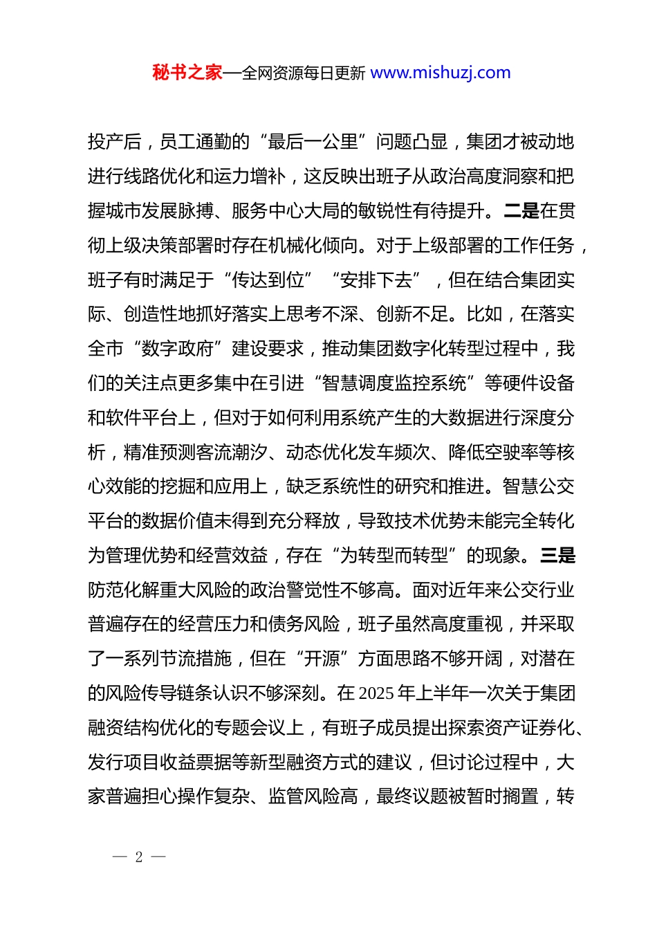 秘书之家—全网资源每日更新 www.mishuzj.com公司领导班子 2025 年度民主生活会对照检查材料(五个带头)根据市委关于召开 2025 年度民主生活会的统一部署,**市公共交通集团有限公司领导班子紧扣会议主题,深入学习贯彻**************思想和*的二十届三中、四中全会精神。会前,班子成员通过集体学习与个人自学相结合的方式,深化了对中央八项规定精神及其重要性的认识,并广泛征求了意见建议。在此基础上,班子成员深入查摆问题、剖析根源、明确整改方向,现将对照检查情况报告如下。一、存在的主要问题(一)在带头强化政治忠诚、提高政治能力方面。一是政治判断力在应对复杂局面时存在反应差。在市委、市政府大力推进“湘南湘西承接产业转移示范区”建设的战略背景下,领导班子虽然能够迅速组织学习相关文件精神,但在将宏观政策转化为集团具体行动方案时,显得前瞻性不足。例如,对于示范区内几大重点产业园区规划初期,班子未能主动、提前介入,与规划部门就公共交通配套进行深度对接,导致部分园区建成— 1 —秘书之家—全网资源每日更新 www.mishuzj.com投产后,员工通勤的“最后一公里”问题凸显,集团才被动地进行线路优化和运力增补,这反映出班子从政治高度洞察和把握城市发展脉搏、服务中心大局的敏锐性有待提升。二是在贯彻上级决策部署时存在机械化倾向。对于上级部署的工作任务,班子有时满足于“传达到位”“安排下去”,但在结合集团实际、创造性地抓好落实上思考不深、创新不足。比如,在落实全市“数字政府”建设要求,推动集团数字化转型过程中,我们的关注点更多集中在引进“智慧调度监控系统”等硬件设备和软件平台上,但对于如何利用系统产生的大数据进行深度分析,精准预测客流潮汐、动态优化发车频次、降低空驶率等核心效能的挖掘和应用上,缺乏系统性的研究和推进。智慧公交平台的数据价值未得到充分释放,导致技术优势未能完全转化为管理优势和经营效益,存在“为转型而转型”的现象。三是防范化解重大风险的政治警觉性不够高。面对近年来公交行业普遍存在的经营压力和债务风险,班子虽然高度重视,并采取了一系列节流措施,但在“开源”方面思路不够开阔,对潜在的风险传导链条认识不够深刻。在 2025 年上半年一次关于集团融资结构优化的专题会议上,有班子成员提出探索资产证券化、发行项目收益票据等新型融资方式的建议,但讨论过程中,大家普遍担心操作复杂、监管风险高,最终议题被暂时搁置,转— 2 —秘书之家—全网资源每日更新 www.mishuzj.com而继续争取财政补贴和传统银行贷款。这种“求稳怕乱”的心态,实质上是面对复杂金融环境和改革深水区时,缺乏敢于斗争、善于斗争的政治担当和专业能力,未能从维护国有资产安全和城市公共服务可持续性的政治高度,去谋划更具韧性的风险应对策略。(二)在带头固本培元、增强*性方面。一是理论学习与实践结合不够紧密。班子能够坚持*委理论学习中心组学习制度,但有时学习存在“为学习而学习”的现象,把学习成果转化为推动工作的实际成效不足。在学习******关于发展新质生产力的重要论述后,班子成员在研讨中都能谈出一些认识,但如何将新质生产力理念应用于传统公交行业,例如通过技术创新和服务升级,培育公交广告、场站商业开发、定制客运等新的增长点,却缺乏深入、具体的行动方案和项目抓手。学习和实践“两张皮”的问题依然存在,未能真正做到学思用贯通、知信行统一。二是*性锤炼在日常工作中有所弱化。在顺境和常规工作中,班子成员的*性观念和宗旨意识是坚定的。但在面对急难险重任务和复杂矛盾时,有时会不自觉地暴露出思想上的松懈。例如,在处理 2025 年夏季因城市内涝导致部分公交线路长时间停运的突发事件中,尽管我们启动了应急预案,但个别班子成— 3 —秘书之家—全网资源每日更新 www.mishuzj.com员在指挥调度时,更多是坐在办公室通过电话了解情况,深入一线、靠前指挥不够,对滞留乘客的安抚和转运工作细节考虑不周。这反映出在关键时刻,将坚定的*性原则转化为“时时放心不下”的责任感和行动自觉方面,仍有差距。三是批评与自我批评的武器运用不够充分。在...