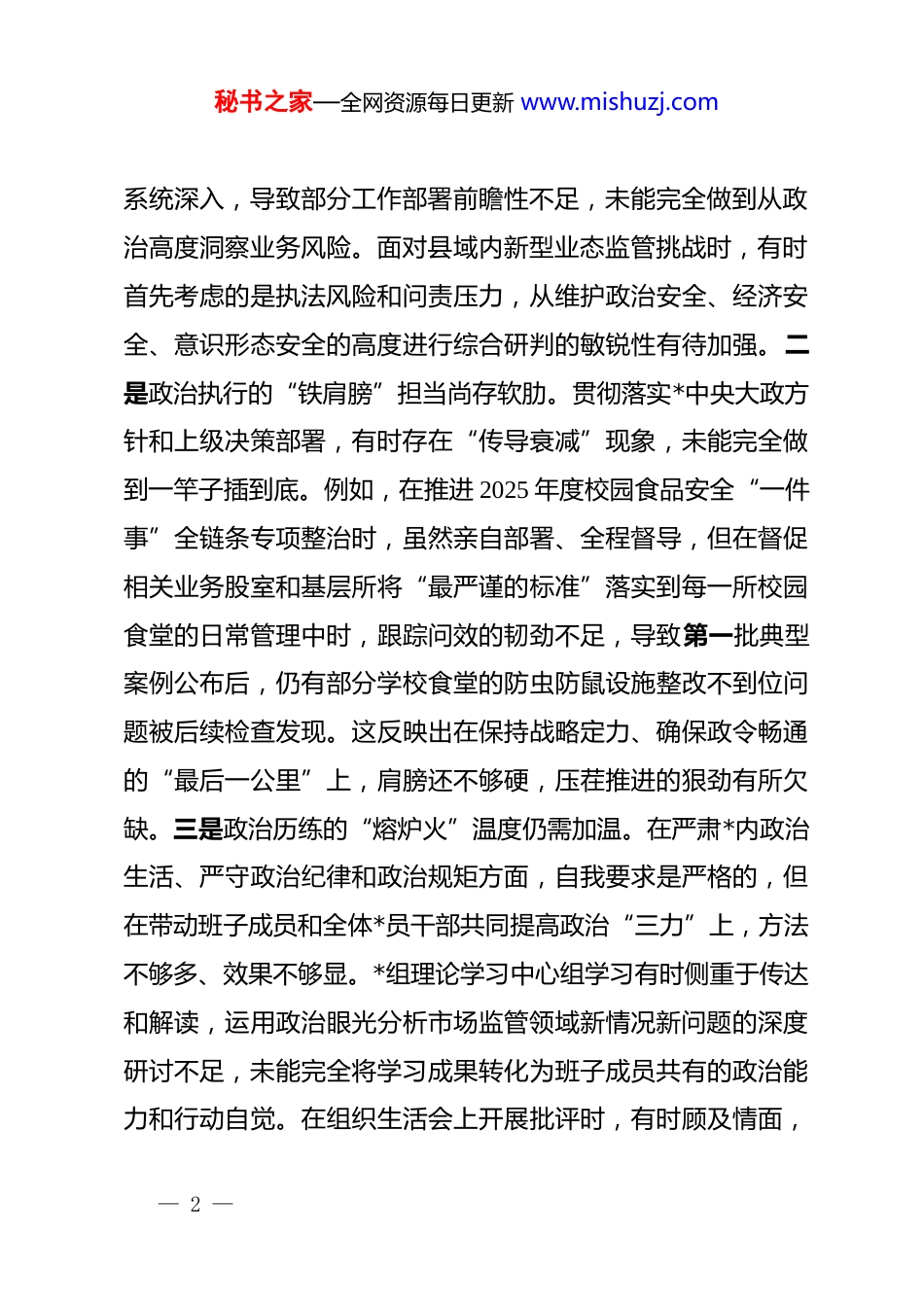 秘书之家—全网资源每日更新 www.mishuzj.com局*组书记 2025 年度民主生活会个人对照检查材料(五个带头)根据本次民主生活会主题要求,本人紧扣深入学习贯彻**************思想,全面贯彻落实*的二十届三中、四中全会精神,锲而不舍落实中央八项规定精神,推进作风建设常态化长效化等核心要求,在深入开展学习研讨、广泛征求意见建议、坦诚进行谈心谈话的基础上,严格对照五个方面重点内容,紧密结合个人思想、学习和工作实际,深入查摆问题,深刻剖析根源,明确整改方向。现将个人对照检查情况报告如下。一、存在的主要问题(一)在带头强化政治忠诚、提高政治能力方面。一是政治判断的“望远镜”焦距有时模糊。对“两个确立”决定性意义的领悟,在将其蕴含的立场观点方法转化为应对复杂监管形势的具体策略上,存在时差和温差。例如,在谋划 2025 年全县市场监管工作要点时,虽然强调了服务高质量发展大局,但对如何将*的二十届四中全会关于“全面推进国家各方面工作法治化”的战略部署,更精准地嵌入到基层执法实践中,思考不够— 1 —秘书之家—全网资源每日更新 www.mishuzj.com系统深入,导致部分工作部署前瞻性不足,未能完全做到从政治高度洞察业务风险。面对县域内新型业态监管挑战时,有时首先考虑的是执法风险和问责压力,从维护政治安全、经济安全、意识形态安全的高度进行综合研判的敏锐性有待加强。二是政治执行的“铁肩膀”担当尚存软肋。贯彻落实*中央大政方针和上级决策部署,有时存在“传导衰减”现象,未能完全做到一竿子插到底。例如,在推进 2025 年度校园食品安全“一件事”全链条专项整治时,虽然亲自部署、全程督导,但在督促相关业务股室和基层所将“最严谨的标准”落实到每一所校园食堂的日常管理中时,跟踪问效的韧劲不足,导致第一批典型案例公布后,仍有部分学校食堂的防虫防鼠设施整改不到位问题被后续检查发现。这反映出在保持战略定力、确保政令畅通的“最后一公里”上,肩膀还不够硬,压茬推进的狠劲有所欠缺。三是政治历练的“熔炉火”温度仍需加温。在严肃*内政治生活、严守政治纪律和政治规矩方面,自我要求是严格的,但在带动班子成员和全体*员干部共同提高政治“三力”上,方法不够多、效果不够显。*组理论学习中心组学习有时侧重于传达和解读,运用政治眼光分析市场监管领域新情况新问题的深度研讨不足,未能完全将学习成果转化为班子成员共有的政治能力和行动自觉。在组织生活会上开展批评时,有时顾及情面,— 2 —秘书之家—全网资源每日更新 www.mishuzj.com对个别同志存在的“宁可不干事、千万别出事”的保守心态,点破不够、辣味不足。(二)在带头固本培元、增强*性方面。一是理论武装的“压舱石”作用未完全发挥。虽然坚持把学习**************思想作为首要政治任务,但在“深化、内化、转化”上存在差距。学习计划执行中,存在“事务繁忙时让路”的现象,系统性、连贯性不足。对*的创新理论,特别是关于高质量发展、统筹发展与安全等重要论述,满足于通读和了解,结合市场监管职能进行“靶向式”钻研不够。例如,在理解“发展新质生产力”内涵时,更多是从宏观层面把握,对于如何通过标准引领、质量提升、知识产权保护等具体职能来培育和服务县域新质生产力,思路不够开阔,学用结合存在“两张皮”现象。二是*性锤炼的“净化器”功能偶有懈怠。对照*章*规 dj 进行自我检视的主动性、经常性不足,有时将工作忙碌作为*性锻炼可以“缓一缓”的理由。世界观、人生观、价值观这个“总开关”拧得不够紧,在抵制社会上一些错误思潮和不良风气时,虽然自身能做到立场坚定,但主动在*员干部中开展针对性警示教育、筑牢思想防线方面做得不够。例如,在组织观看廉政教育片后,多是要求撰写心得体会,未能及时组织深入讨论,将震撼转化— 3 —秘书之家—全网资源每日更新 www.mishuzj.com为日常修身律己的自觉行动,导致教育的穿透力和持久性打折扣。三是宗旨情怀的“连心桥”基石有待加固。虽然深知市场监管工作事关群众切身利益,但在践行“四下基层”、密切*群干群关系上,存在“身入”多于“心至”的情况。下基层调研有...