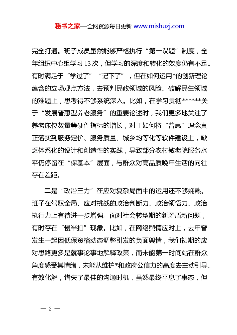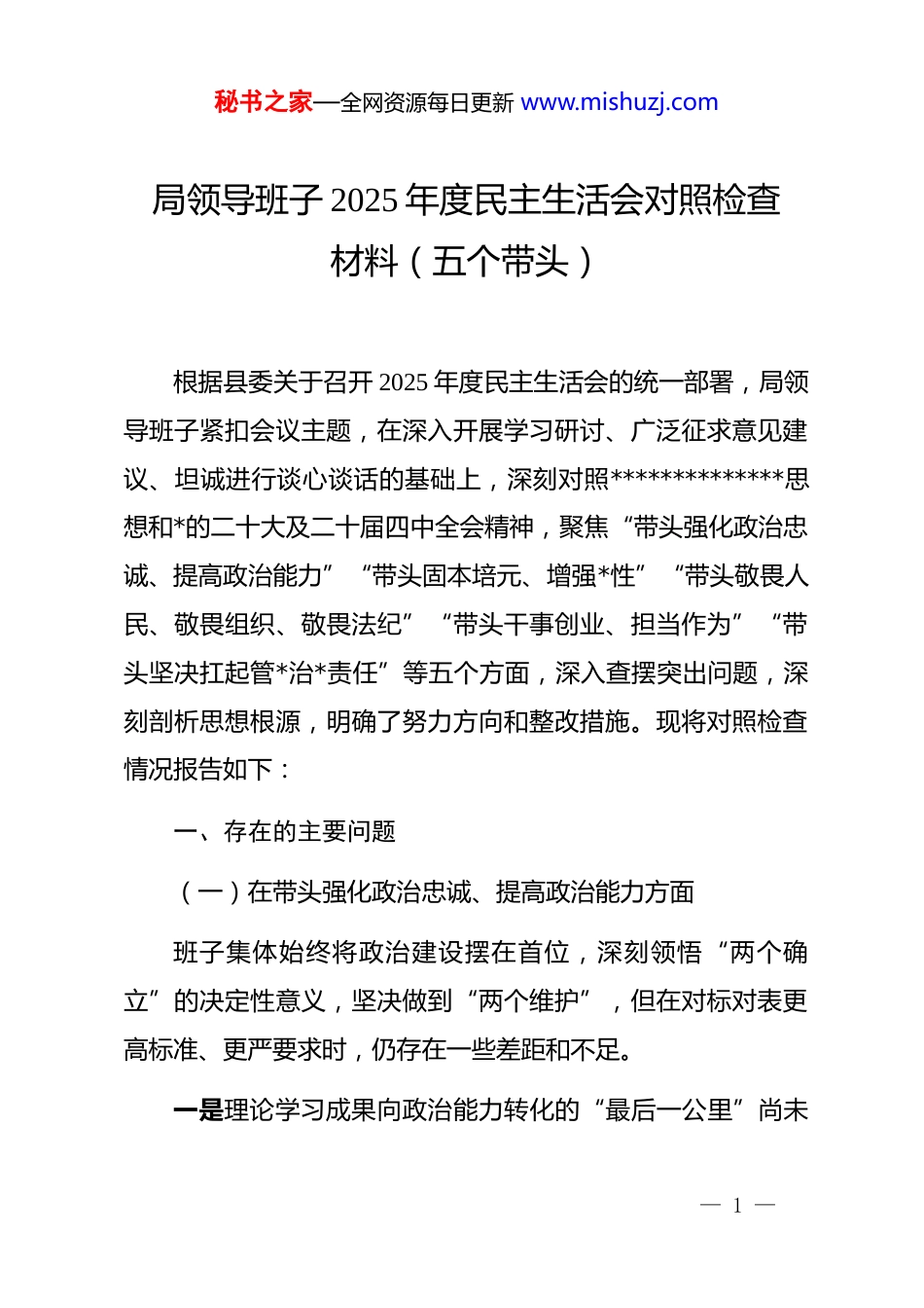 秘书之家—全网资源每日更新 www.mishuzj.com局领导班子 2025 年度民主生活会对照检查材料(五个带头)根据县委关于召开 2025 年度民主生活会的统一部署,局领导班子紧扣会议主题,在深入开展学习研讨、广泛征求意见建议、坦诚进行谈心谈话的基础上,深刻对照**************思想和*的二十大及二十届四中全会精神,聚焦“带头强化政治忠诚、提高政治能力”“带头固本培元、增强*性”“带头敬畏人民、敬畏组织、敬畏法纪”“带头干事创业、担当作为”“带头坚决扛起管*治*责任”等五个方面,深入查摆突出问题,深刻剖析思想根源,明确了努力方向和整改措施。现将对照检查情况报告如下:一、存在的主要问题(一)在带头强化政治忠诚、提高政治能力方面班子集体始终将政治建设摆在首位,深刻领悟“两个确立”的决定性意义,坚决做到“两个维护”,但在对标对表更高标准、更严要求时,仍存在一些差距和不足。一是理论学习成果向政治能力转化的“最后一公里”尚未— 1 —秘书之家—全网资源每日更新 www.mishuzj.com完全打通。班子成员虽然能够严格执行“第一议题”制度,全年组织中心组学习 13 次,但学习的深度和转化的效度仍有不足。有时满足于“学过了”“记下了”,但在如何运用*的创新理论蕴含的立场观点方法,去预判民政领域的风险、破解民生领域的难题上,思考得不够系统深入。比如,在学习贯彻******关于“发展普惠型养老服务”的重要论述时,我们更多地关注了养老床位数量等硬件指标的增长,对于如何将“普惠”理念真正落实到服务定价、服务质量、城乡均等化等软件建设上,缺乏体系化的设计和创造性的实践,导致部分农村敬老院服务水平仍停留在“保基本”层面,与群众对高品质晚年生活的向往存在差距。二是“政治三力”在应对复杂局面中的运用还不够娴熟。班子在驾驭全局、应对挑战的政治判断力、政治领悟力、政治执行力上有待进一步增强。面对社会转型期的新矛盾新问题,有时存在“慢半拍”现象。比如,在网络舆情应对上,去年曾发生一起因低保资格动态调整引发的负面舆情,我们初期的应对思路更多是就事论事地解释政策,而未能第一时间站在群众角度感受其情绪,未能从维护*和政府公信力的高度去主动引导、有效化解,错失了最佳的沟通时机,虽然最终平息了事态,但— 2 —秘书之家—全网资源每日更新 www.mishuzj.com反映出我们运用政治智慧化解社会矛盾的能力尚需锤炼。三是从“国之大者”高度谋划民政工作的战略视野还不够开阔。有时谋划工作习惯于从民政“一亩三分地”出发,未能时时将民政工作置于全县经济社会发展大局乃至国家治理体系和治理能力现代化的大背景下考量。比如,在推进社会组织培育发展工作中,我们关注的重点多为社会组织的数量增长和年检合规,但如何引导这些组织深度参与基层社会治理、承接政府转移职能、助力乡村振兴等战略性问题上,思考不深、联动不够,导致社会组织的“蓄水池”功能未能得到充分发挥,与新时代民政工作“三基”定位的要求尚有差距。(二)在带头固本培元、增强*性方面班子始终坚持以*性立身、以*性律己,但对照革命先辈的崇高风范和新时代*员干部的标准,*性锤炼的自觉性和革命性仍需加强。一是*内政治生活的“熔炉”淬炼作用发挥还不够充分。虽然能够严格执行民主集中制、“三会一课”、民主生活会等制度,但*内政治生活的“辣味”尚显不足。在开展批评与自我批评时,有时存在“爱惜羽毛”的思想,讲工作问题多、谈思想— 3 —秘书之家—全网资源每日更新 www.mishuzj.com根源少,提希望建议多、点要害问题少,以工作建议代替批评意见的现象依然存在。这种“和风细雨”式的批评,难以达到“红脸出汗、排毒治病”的预期效果,不利于班子成员思想上的真正交锋和*性上的共同提升。二是艰苦奋斗的斗争精神在新形势下有所弱化。随着工作条件的改善,班子成员中或多或少滋生了安于现状、求稳怕乱的心态,攻坚克难的锐气和“涉深水区”的勇气有所下降。对于一些历史遗留的“硬骨头”,比如部分乡镇存在的散埋乱葬问题,我们虽然每年都开展专项整治,但往往满足于“面上清”,缺乏“连根拔”的决心和智慧,担心触及传统风...
