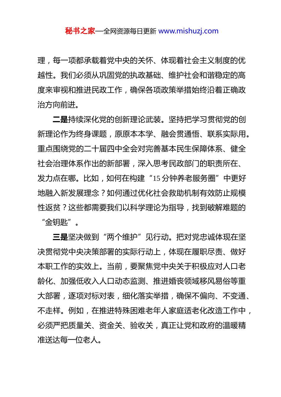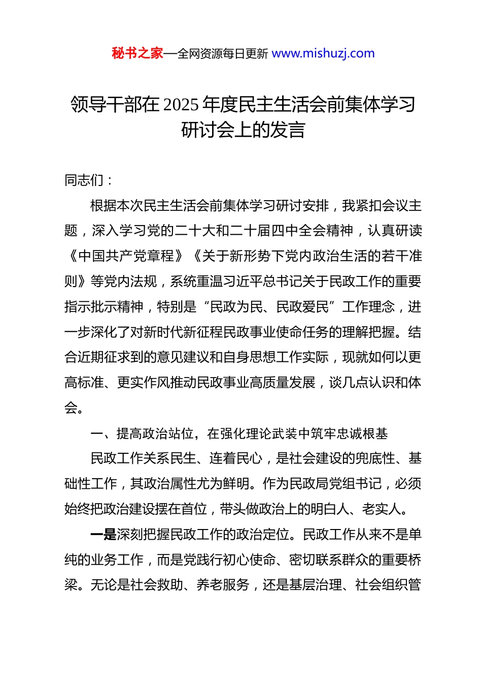 秘书之家—全网资源每日更新 www.mishuzj.com领导干部在 2025 年度民主生活会前集体学习研讨会上的发言 同志们:根据本次民主生活会前集体学习研讨安排,我紧扣会议主题,深入学习党的二十大和二十届四中全会精神,认真研读《中国共产党章程》《关于新形势下党内政治生活的若干准则》等党内法规,系统重温习近平总书记关于民政工作的重要指示批示精神,特别是“民政为民、民政爱民”工作理念,进一步深化了对新时代新征程民政事业使命任务的理解把握。结合近期征求到的意见建议和自身思想工作实际,现就如何以更高标准、更实作风推动民政事业高质量发展,谈几点认识和体会。一、提高政治站位,在强化理论武装中筑牢忠诚根基民政工作关系民生、连着民心,是社会建设的兜底性、基础性工作,其政治属性尤为鲜明。作为民政局党组书记,必须始终把政治建设摆在首位,带头做政治上的明白人、老实人。一是深刻把握民政工作的政治定位。民政工作从来不是单纯的业务工作,而是党践行初心使命、密切联系群众的重要桥梁。无论是社会救助、养老服务,还是基层治理、社会组织管秘书之家—全网资源每日更新 www.mishuzj.com理,每一项都承载着党中央的关怀、体现着社会主义制度的优越性。我们必须从巩固党的执政基础、维护社会和谐稳定的高度来审视和推进民政工作,确保各项政策举措始终沿着正确政治方向前进。二是持续深化党的创新理论武装。坚持把学习贯彻党的创新理论作为终身课题,原原本本学、融会贯通悟、联系实际用。重点围绕党的二十届四中全会对完善基本民生保障体系、健全社会治理体系作出的新部署,深入思考民政部门的职责所在、发力点在哪。比如,如何在构建“15 分钟养老服务圈”中更好地融入新发展理念?如何通过优化社会救助机制有效防止规模性返贫?这些都需要我们以科学理论为指导,找到破解难题的“金钥匙”。三是坚决做到“两个维护”见行动。把对党忠诚体现在坚决贯彻党中央决策部署的实际行动上,体现在履职尽责、做好本职工作的实效上。当前,要聚焦党中央关于积极应对人口老龄化、加强低收入人口动态监测、推进婚丧领域移风易俗等重大部署,逐项对标对表,细化落实举措,确保不偏向、不变通、不走样。例如,在推进特殊困难老年人家庭适老化改造工作中,必须严把质量关、资金关、验收关,真正让党和政府的温暖精准送达每一位老人。秘书之家—全网资源每日更新 www.mishuzj.com二、站稳人民立场,在增进民生福祉中践行初心使命“江山就是人民,人民就是江山。”民政工作直接面对群众,服务对象多为老年人、残疾人、孤儿、低保对象等困难群体,更需厚植为民情怀,用心用情用力解决好群众急难愁盼问题。一是树牢正确政绩观。坚决摒弃“重显绩、轻潜绩”的倾向,多做打基础、利长远、惠民生的实事。比如,社区养老服务设施建设投入大、见效慢,但却是应对人口老龄化的治本之策,必须持之以恒抓下去。截至 2024 年底,全县建成社区日间照料中心*个、农村互助幸福院*个,但覆盖率仍有提升空间,下一步要科学规划布局,推动资源向薄弱地区倾斜。二是提升服务精准度。坚持从群众需求出发,变“大水漫灌”为“精准滴灌”。在社会救助方面,依托低收入人口动态监测信息平台,对*万低保对象、*名特困人员实施常态化跟踪,对因病因灾导致基本生活出现严重困难的家庭,及时启动临时救助,做到“应救尽救、应助尽助”。在儿童福利方面,全面落实孤儿、事实无人抚养儿童基本生活保障标准自然增长机制,目前全县*名孤儿月均保障标准达*元,切实兜住兜准兜好民生底线。三是优化服务体验感。聚焦群众办事痛点堵点,深化“放管服”改革。全面推进婚姻登记“跨省通办”、残疾人“两项秘书之家—全网资源每日更新 www.mishuzj.com补贴”资格认定“全程网办”,让数据多跑路、群众少跑腿。同时,注重服务细节的人文关怀,如在婚姻登记处设置颁证厅、在殡仪馆推行“温情告别”服务,让民政服务既有速度更有温度。三、强化担当作为,在服务中心大局中展现民政作为新时代民政工作舞台广阔,必须主动融入全县发展大局,在服务高质量发展中找准坐标、彰显价值。一是助力乡村振兴战略。持续加...