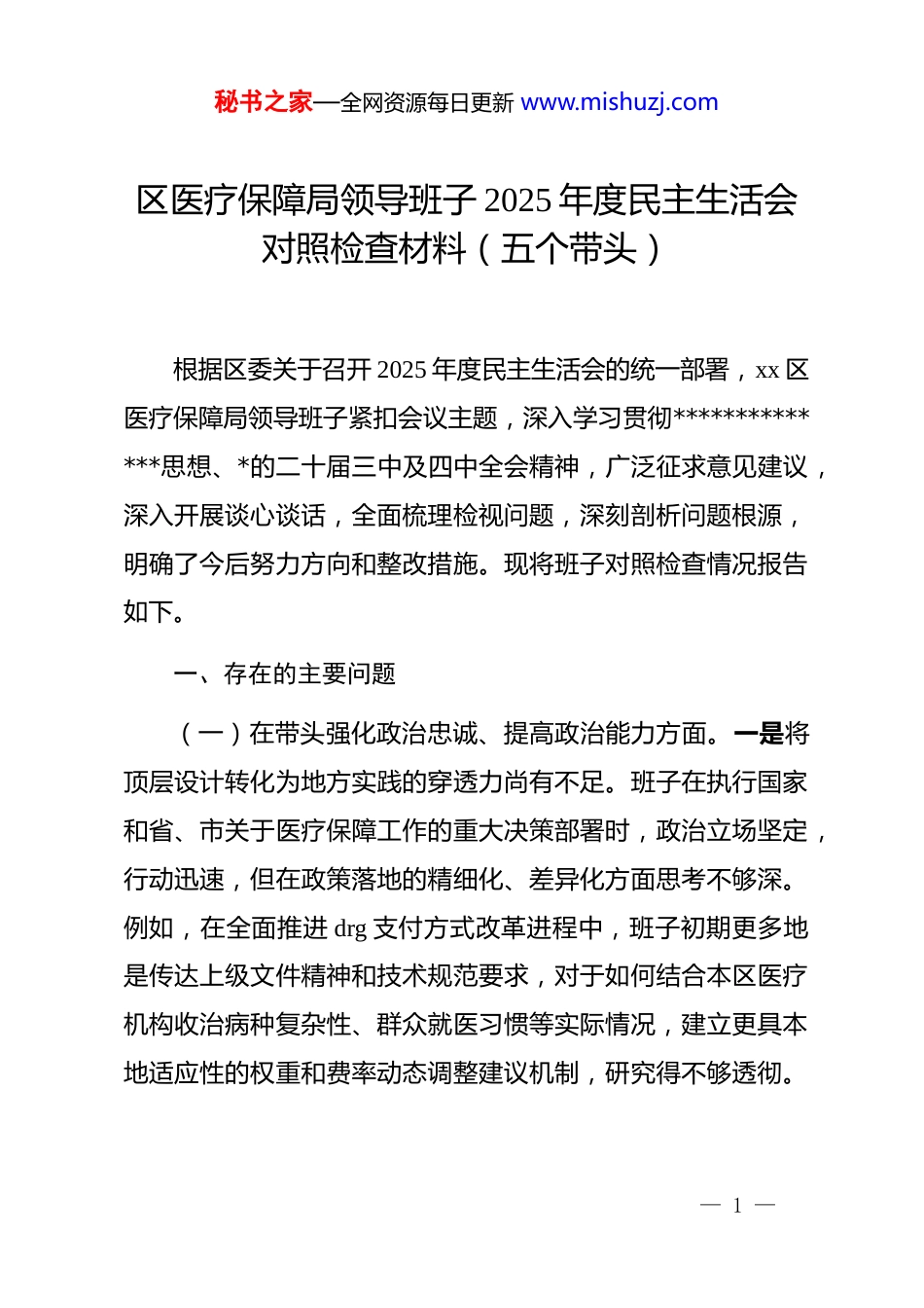 秘书之家—全网资源每日更新 www.mishuzj.com区医疗保障局领导班子 2025 年度民主生活会对照检查材料(五个带头)根据区委关于召开 2025 年度民主生活会的统一部署,xx 区医疗保障局领导班子紧扣会议主题,深入学习贯彻**************思想、*的二十届三中及四中全会精神,广泛征求意见建议,深入开展谈心谈话,全面梳理检视问题,深刻剖析问题根源,明确了今后努力方向和整改措施。现将班子对照检查情况报告如下。一、存在的主要问题(一)在带头强化政治忠诚、提高政治能力方面。一是将顶层设计转化为地方实践的穿透力尚有不足。班子在执行国家和省、市关于医疗保障工作的重大决策部署时,政治立场坚定,行动迅速,但在政策落地的精细化、差异化方面思考不够深。例如,在全面推进 drg 支付方式改革进程中,班子初期更多地是传达上级文件精神和技术规范要求,对于如何结合本区医疗机构收治病种复杂性、群众就医习惯等实际情况,建立更具本地适应性的权重和费率动态调整建议机制,研究得不够透彻。— 1 —秘书之家—全网资源每日更新 www.mishuzj.com这导致部分医疗机构在改革初期反映,个别病组的分值设定未能完全体现本地高发病种的资源消耗强度,影响了其参与改革的积极性。二是统筹推进复杂改革的系统性思维有待加强。班子在处理涉及多部门、多领域的医保改革任务时,虽然能够主动协调,但在构建高效协同机制、打通政策壁垒方面,前瞻性和力度仍显不够。在推动“医保、医疗、医药”协同发展和治理的过程中,班子虽多次与卫健、市场监管等部门召开联席会议,但在统一药品耗材编码、共享医疗服务数据等关键环节上,存在“头痛医头、脚痛医脚”的现象。比如,医保部门的药品招标采购编码与医疗机构临床使用编码未能实现完全同步映射,导致部分集采药品在医院端入库、使用时需要人工二次转换,无形中增加了医疗机构的工作负担,也为数据精准统计分析带来了障碍。三是防范化解新生风险的预见性能力需要提升。随着医保改革进入深水区,新业态、新模式不断涌现,班子对其中潜藏的风险洞察不够敏锐,有时存在“事后补救”的情况。在推广“十五分钟医保服务圈”建设,将服务终端下沉至社区、村居的过程中,班子主要精力集中在网点布局、设备配置和人员培训上,对于下沉终端接入核心医保网络后可能带来的数据安全风险、基层服务人员操作不当可能引发的隐私泄露等问题,未能做到充分预判和前置防范。直到区委网信办开展网络安全— 2 —秘书之家—全网资源每日更新 www.mishuzj.com巡查时指出相关薄弱环节,才紧急启动数据加密升级和基层人员权限分级管理等整改工作。(二)在带头固本培元、增强*性方面。一是理论学习与医保业务深度融合的转化效果不佳。班子坚持*组理论学习中心组学习制度,能够及时跟进学习*的二十届四中全会精神等最新理论成果,但在“学思用贯通、知信行统一”上还存在差距。例如,在学习领会“发展新质生产力”这一重大论述时,*组中心组的研讨多停留在理解概念、把握要求层面,对于如何运用其核心要义,推动医保基金监管方式从传统的人力核查向大数据、人工智能驱动的预测式、智能化监管转型升级,探索建立“ai稽核医生”等创新应用,缺乏系统性的思考和具体的行动方案,导致理论学习与推动医保事业高质量发展的实际结合不够紧密。二是*性修养内化为工作作风的自觉性有待提高。班子成员能够自觉遵守*章*规 dj,但在将坚定的*性原则时时处处体现到具体工作中,还存在薄弱环节。尽管在各种会议上反复强调要站稳人民立场,优化经办服务,但在审视内部工作流程时,有时仍不自觉地带有“管理本位”思想。比如,在制定异地就医直接结算备案流程时,为确保基金安全,设置的审核环节较为繁琐,要求参保群众上传多种证明材料。虽然符合规定,但未能充分— 3 —秘书之家—全网资源每日更新 www.mishuzj.com站在办事群众的角度,通过部门间信息共享等方式简化手续,导致部分有实际困难的群众感到“备案难”,这与共产*人为民服务的根本宗旨存在一定温差。三是开展批评与自我批评的“辣味”尚显不足。在民主生活会和组织生活会上,班子成员之间能够坦诚相见,但...