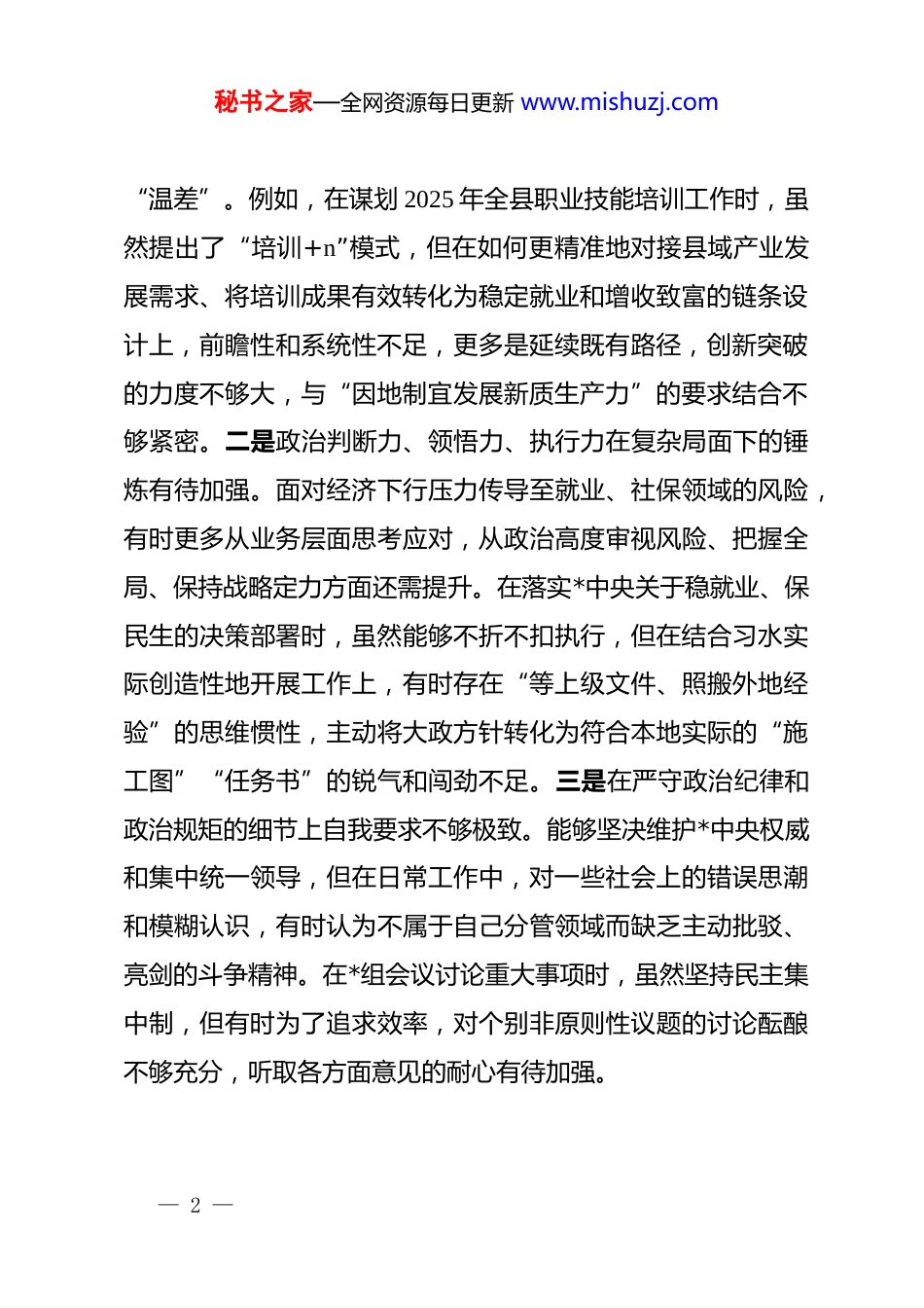 秘书之家—全网资源每日更新 www.mishuzj.com人力资源和社会保障局*组书记 2025 年度民主生活会个人对照检查材料(五个带头)根据本次民主生活会主题要求,本人紧扣深入学习贯彻**************思想,全面贯彻落实*的二十届三中、四中全会精神,深入贯彻落实******重要讲话和****批示精神,推进作风建设常态化长效化的核心要义,紧密联系个人思想、学习和工作实际,深入查摆突出问题,深刻剖析思想根源,明确整改方向与措施。现将对照检查情况报告如下。一、存在的主要问题对照本次民主生活会主题与五个方面的重点检视要求,本人坚持把自己摆进去、把职责摆进去、把工作摆进去,深入查摆出以下问题:(一)在带头强化政治忠诚、提高政治能力方面。一是理论武装“知行合一”的深度尚有欠缺。对**************思想,特别是关于保障和改善民生、健全社会保障体系、实施就业优先战略等重要论述的系统性、贯通性理解不够透彻,将其转化为谋划人社事业高质量发展的具体思路和有效举措有时存在— 1 —秘书之家—全网资源每日更新 www.mishuzj.com“温差”。例如,在谋划 2025 年全县职业技能培训工作时,虽然提出了“培训+n”模式,但在如何更精准地对接县域产业发展需求、将培训成果有效转化为稳定就业和增收致富的链条设计上,前瞻性和系统性不足,更多是延续既有路径,创新突破的力度不够大,与“因地制宜发展新质生产力”的要求结合不够紧密。二是政治判断力、领悟力、执行力在复杂局面下的锤炼有待加强。面对经济下行压力传导至就业、社保领域的风险,有时更多从业务层面思考应对,从政治高度审视风险、把握全局、保持战略定力方面还需提升。在落实*中央关于稳就业、保民生的决策部署时,虽然能够不折不扣执行,但在结合习水实际创造性地开展工作上,有时存在“等上级文件、照搬外地经验”的思维惯性,主动将大政方针转化为符合本地实际的“施工图”“任务书”的锐气和闯劲不足。三是在严守政治纪律和政治规矩的细节上自我要求不够极致。能够坚决维护*中央权威和集中统一领导,但在日常工作中,对一些社会上的错误思潮和模糊认识,有时认为不属于自己分管领域而缺乏主动批驳、亮剑的斗争精神。在*组会议讨论重大事项时,虽然坚持民主集中制,但有时为了追求效率,对个别非原则性议题的讨论酝酿不够充分,听取各方面意见的耐心有待加强。— 2 —秘书之家—全网资源每日更新 www.mishuzj.com(二)在带头固本培元、增强*性方面。一是*性修养的“源头活水”汲取不够持续。虽然能够坚持参加中心组学习,但个人自学的主动性、系统性不强,存在“以干代学”现象。对*章*规 dj 的学习,有时满足于知道条文,对其深刻内涵、实践要求钻研不深,运用*性原则进行自我净化、自我完善、自我革新、自我提高的自觉性不够强。例如,在推进“互联网+人社”数字化服务过程中,更多关注平台功能建设和业务上线数量,对于如何通过数字化手段更好地践行*的群众路线、提升服务温度、防范数据安全与廉政风险等深层次问题,从*性修养角度进行思考和把握不够深入。二是理想信念的“压舱石”作用在应对繁重任务时有所松动。面对人社领域信访维稳、基金安全、劳动关系调处等多重压力,有时会产生畏难情绪和求稳心态,攻坚克难的锐气有所消减。对照革命先辈和先进典型,在艰苦奋斗、无私奉献的精神境界上存在差距。例如,在推动解决某些历史遗留的社保欠费问题时,虽然进行了多次协调,但在面对企业实际困难和复杂债权债务关系时,缺乏“一抓到底”的韧劲和“破局解题”的狠劲,一定程度上影响了问题解决的时效。三是世界观、人生观、价值观的“总开关”拧得不够时时紧。随着职务提升和工作年限增长,有时不自觉地放松了对主观世界的持续改造,批评与自我批评的武器运用不够经— 3 —秘书之家—全网资源每日更新 www.mishuzj.com常、不够有力。在对待个人名利得失上,虽然能保持清醒,但偶尔也会在对比中产生心态上的微妙波动,艰苦奋斗、勤俭办事的意识需要进一步强化。(三)在带头敬畏人民、敬畏组织、敬畏法纪方面。一是践行“四下基层”制度的深度和广度有待拓展。“身入”基层较多,“心到”...