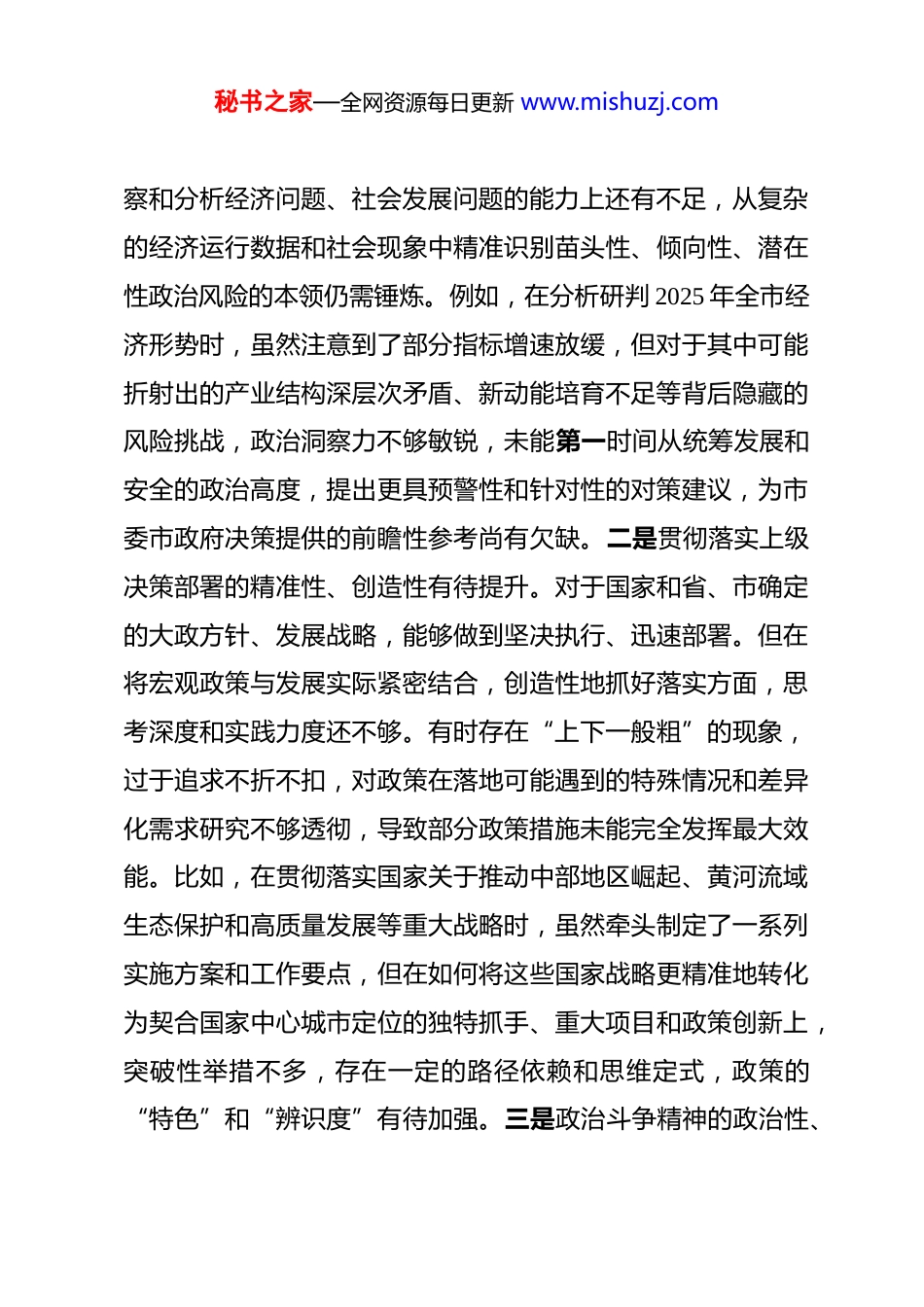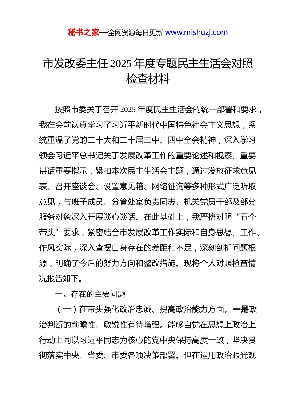 秘书之家—全网资源每日更新 www.mishuzj.com市发改委主任 2025 年度专题民主生活会对照检查材料 按照市委关于召开 2025 年度民主生活会的统一部署和要求,我在会前认真学习了习近平新时代中国特色社会主义思想,系统重温了党的二十大和二十届三中、四中全会精神,深入学习领会习近平总书记关于发展改革工作的重要论述和视察、重要讲话重要指示,紧扣本次民主生活会主题,通过发放征求意见表、召开座谈会、设置意见箱、网络征询等多种形式广泛听取意见,与班子成员、分管处室负责同志、机关党员干部及部分服务对象深入开展谈心谈话。在此基础上,我严格对照“五个带头”要求,紧密结合市发展改革工作实际和自身思想、工作、作风实际,深入查摆自身存在的差距和不足,深刻剖析问题根源,明确了今后的努力方向和整改措施。现将个人对照检查情况报告如下。一、存在的主要问题(一)在带头强化政治忠诚、提高政治能力方面。一是政治判断的前瞻性、敏锐性有待增强。能够自觉在思想上政治上行动上同以习近平同志为核心的党中央保持高度一致,坚决贯彻落实中央、省委、市委各项决策部署。但在运用政治眼光观秘书之家—全网资源每日更新 www.mishuzj.com察和分析经济问题、社会发展问题的能力上还有不足,从复杂的经济运行数据和社会现象中精准识别苗头性、倾向性、潜在性政治风险的本领仍需锤炼。例如,在分析研判 2025 年全市经济形势时,虽然注意到了部分指标增速放缓,但对于其中可能折射出的产业结构深层次矛盾、新动能培育不足等背后隐藏的风险挑战,政治洞察力不够敏锐,未能第一时间从统筹发展和安全的政治高度,提出更具预警性和针对性的对策建议,为市委市政府决策提供的前瞻性参考尚有欠缺。二是贯彻落实上级决策部署的精准性、创造性有待提升。对于国家和省、市确定的大政方针、发展战略,能够做到坚决执行、迅速部署。但在将宏观政策与发展实际紧密结合,创造性地抓好落实方面,思考深度和实践力度还不够。有时存在“上下一般粗”的现象,过于追求不折不扣,对政策在落地可能遇到的特殊情况和差异化需求研究不够透彻,导致部分政策措施未能完全发挥最大效能。比如,在贯彻落实国家关于推动中部地区崛起、黄河流域生态保护和高质量发展等重大战略时,虽然牵头制定了一系列实施方案和工作要点,但在如何将这些国家战略更精准地转化为契合国家中心城市定位的独特抓手、重大项目和政策创新上,突破性举措不多,存在一定的路径依赖和思维定式,政策的“特色”和“辨识度”有待加强。三是政治斗争精神的政治性、秘书之家—全网资源每日更新 www.mishuzj.com艺术性有待加强。面对发展改革领域深层次矛盾和历史遗留问题,能够坚持原则立场,但有时存在“稳字当头”思想,攻坚克难的锐气和斗争的策略艺术有所欠缺。在面对一些涉及多部门协调、利益关系复杂的改革攻坚任务或项目推进难题时,有时顾虑较多,担心触碰矛盾“硬骨头”,存在寻求“最大公约数”而牺牲部分改革彻底性的妥协心态。例如,在推进我市某重点领域市场化改革过程中,面对相关方诉求不一、阻力较大的情况,虽然持续推进,但在关键环节、难点堵点上敢于碰硬、善用政策法规武器进行博弈和引导的决心与智慧不足,导致改革进程未能达到预期效率,反映出在复杂环境下维护发展大局、坚持改革方向的斗争精神和斗争本领尚需淬炼。(二)在带头固本培元、增强党性方面。一是党的创新理论学习成果向实践转化不够顺畅。能够坚持参加中心组学习、专题研讨和个人自学,跟进学习党的最新理论成果,但在“深化、内化、转化”上存在差距。对习近平新时代中国特色社会主义思想,特别是其经济思想、关于城市工作的重要论述的学习,有时停留在理解层面,满足于掌握基本观点,但在如何运用其立场观点方法破解发展改革难题上,思考谋划不够系统深入,存在“学用脱节”现象。比如,在学习领会关于“立足新发展阶段、贯彻新发展理念、构建新发展格局”的重要要求后,秘书之家—全网资源每日更新 www.mishuzj.com虽然在规划编制、政策制定中有所体现,但在推动我市经济实现质的有效提升和量的合理增长,特别是在加快新旧动能转换、...