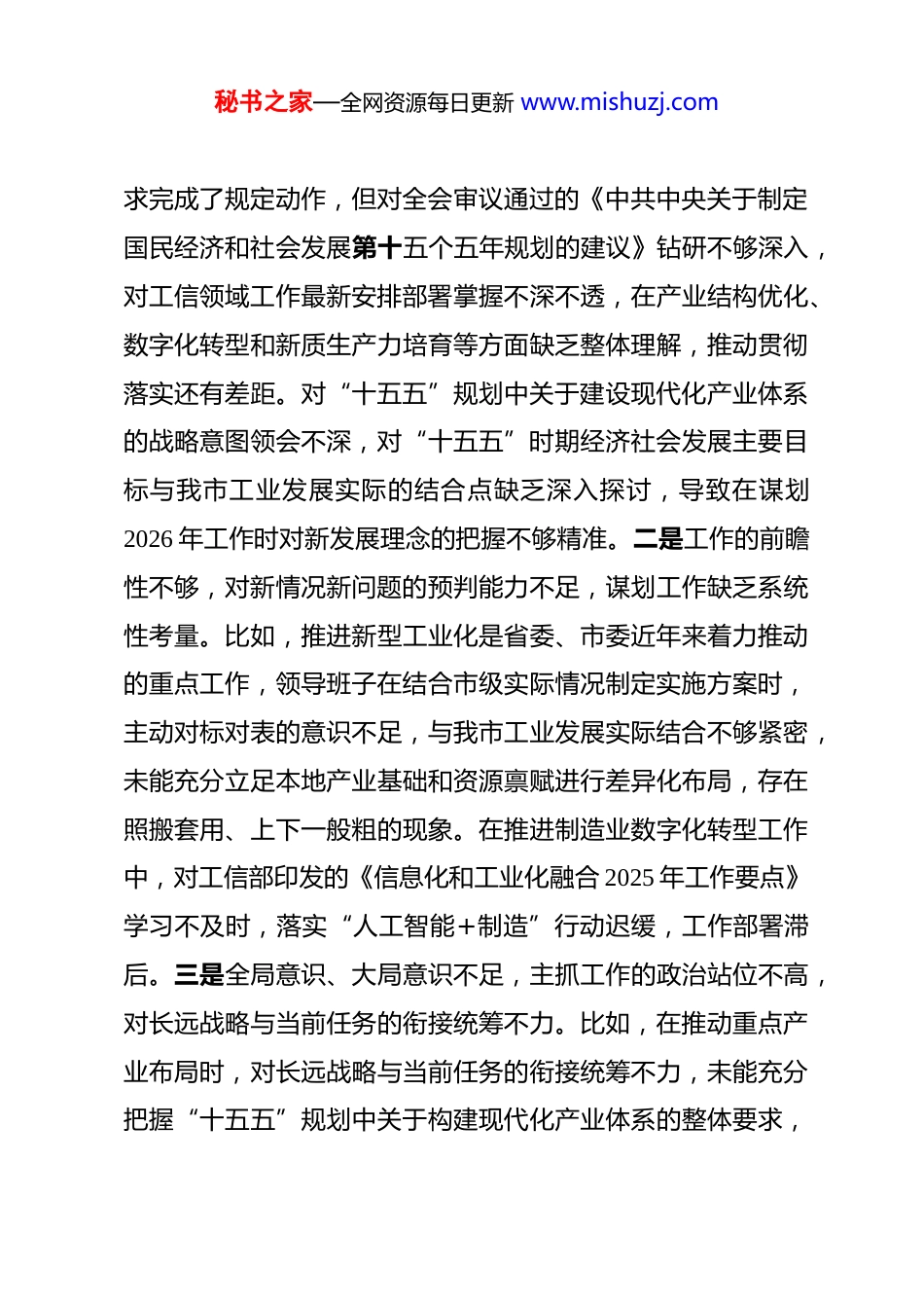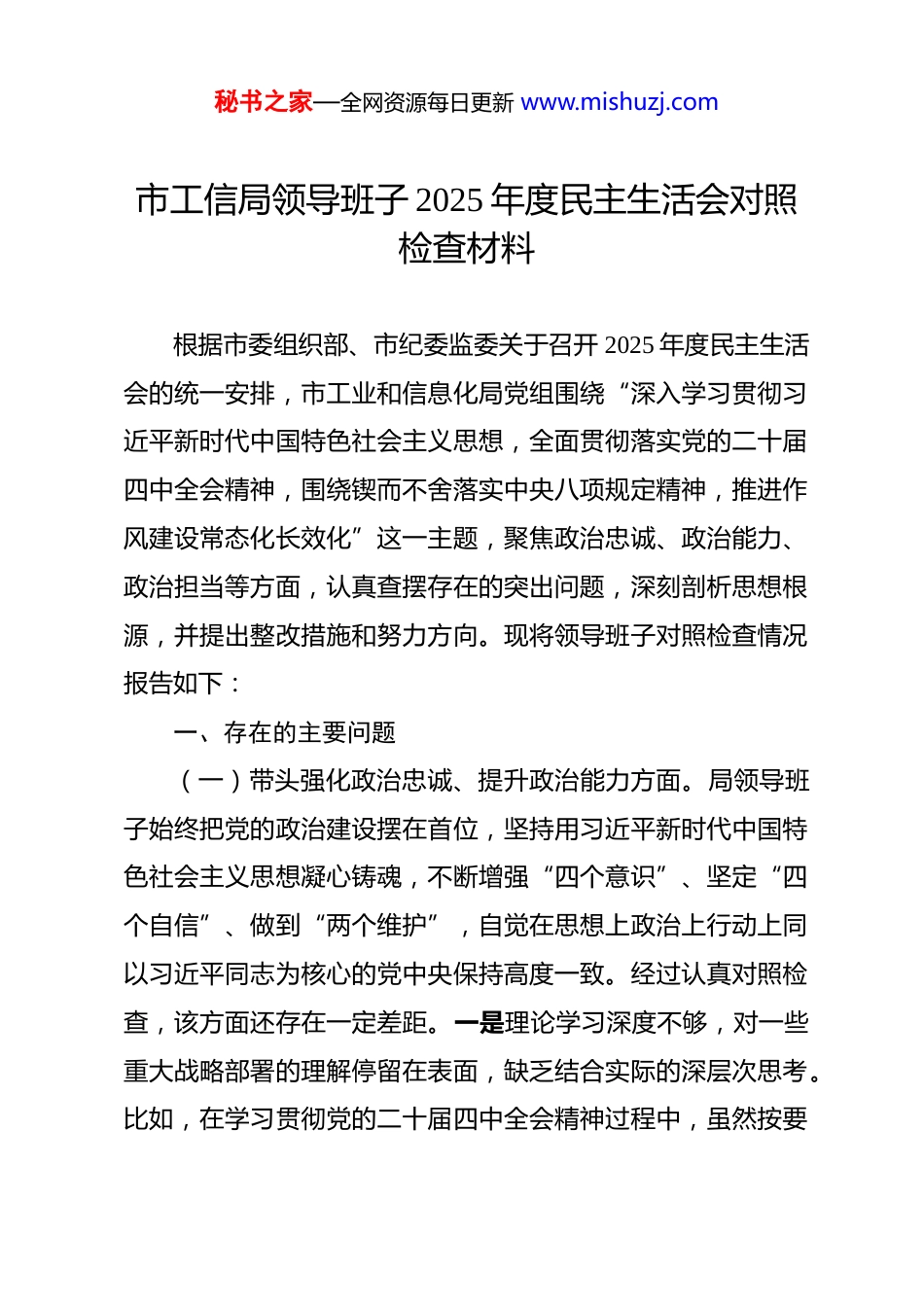 秘书之家—全网资源每日更新 www.mishuzj.com市工信局领导班子 2025 年度民主生活会对照检查材料 根据市委组织部、市纪委监委关于召开 2025 年度民主生活会的统一安排,市工业和信息化局党组围绕“深入学习贯彻习近平新时代中国特色社会主义思想,全面贯彻落实党的二十届四中全会精神,围绕锲而不舍落实中央八项规定精神,推进作风建设常态化长效化”这一主题,聚焦政治忠诚、政治能力、政治担当等方面,认真查摆存在的突出问题,深刻剖析思想根源,并提出整改措施和努力方向。现将领导班子对照检查情况报告如下:一、存在的主要问题(一)带头强化政治忠诚、提升政治能力方面。局领导班子始终把党的政治建设摆在首位,坚持用习近平新时代中国特色社会主义思想凝心铸魂,不断增强“四个意识”、坚定“四个自信”、做到“两个维护”,自觉在思想上政治上行动上同以习近平同志为核心的党中央保持高度一致。经过认真对照检查,该方面还存在一定差距。一是理论学习深度不够,对一些重大战略部署的理解停留在表面,缺乏结合实际的深层次思考。比如,在学习贯彻党的二十届四中全会精神过程中,虽然按要秘书之家—全网资源每日更新 www.mishuzj.com求完成了规定动作,但对全会审议通过的《中共中央关于制定国民经济和社会发展第十五个五年规划的建议》钻研不够深入,对工信领域工作最新安排部署掌握不深不透,在产业结构优化、数字化转型和新质生产力培育等方面缺乏整体理解,推动贯彻落实还有差距。对“十五五”规划中关于建设现代化产业体系的战略意图领会不深,对“十五五”时期经济社会发展主要目标与我市工业发展实际的结合点缺乏深入探讨,导致在谋划2026 年工作时对新发展理念的把握不够精准。二是工作的前瞻性不够,对新情况新问题的预判能力不足,谋划工作缺乏系统性考量。比如,推进新型工业化是省委、市委近年来着力推动的重点工作,领导班子在结合市级实际情况制定实施方案时,主动对标对表的意识不足,与我市工业发展实际结合不够紧密,未能充分立足本地产业基础和资源禀赋进行差异化布局,存在照搬套用、上下一般粗的现象。在推进制造业数字化转型工作中,对工信部印发的《信息化和工业化融合 2025 年工作要点》学习不及时,落实“人工智能+制造”行动迟缓,工作部署滞后。三是全局意识、大局意识不足,主抓工作的政治站位不高,对长远战略与当前任务的衔接统筹不力。比如,在推动重点产业布局时,对长远战略与当前任务的衔接统筹不力,未能充分把握“十五五”规划中关于构建现代化产业体系的整体要求,秘书之家—全网资源每日更新 www.mishuzj.com缺乏分阶段、分步骤的实施路径设计,导致部分项目前期论证不充分、中期推进不平衡、后期评估不到位,影响了政策执行的连续性和实效性。在制定规上工业增加值目标时,部分班子成员偏重数量增长,对通过产业结构优化提升发展质量的关注不够,在推进传统产业改造升级与培育新兴产业协调发展方面思路不够清晰。(二)带头固本培元、增强党性修养方面。班子成员注重政治理论学习,带头提升政治意识,通过党组理论学习中心组、专题研讨、个人自学等方式,深入学习党的创新理论,不断增强党性修养水平。经过认真对照检查,该方面还存在一定差距。一是统筹好理论学习与业务工作的主动性不强,工学矛盾处理不当,存在以业务学习代替政治理论学习的现象。比如,部分班子成员日常参加组织生活的积极性不高,存在“重业务、轻政治”的倾向,未能真正把政治理论学习作为提升党性修养的根本途径。在开展深入贯彻中央八项规定精神学习教育过程中,个别班子成员把学习教育简单理解为读文件、写心得,对习近平总书记关于加强党的作风建设的重要论述学习不够系统,未能真正做到入脑入心、融会贯通。二是政治敏锐性有待提高,对意识形态领域斗争的复杂性认识不足,总体国家安全观树得不牢。比如,有的班子成员落实意识形态“一岗双责”责任制秘书之家—全网资源每日更新 www.mishuzj.com落实不到位,对分管领域意识形态风险预判不足,未能及时发现并处置个别科室在宣传材料中表述不规范的问题,暴露出政治把关不严的短板。在组织党性...