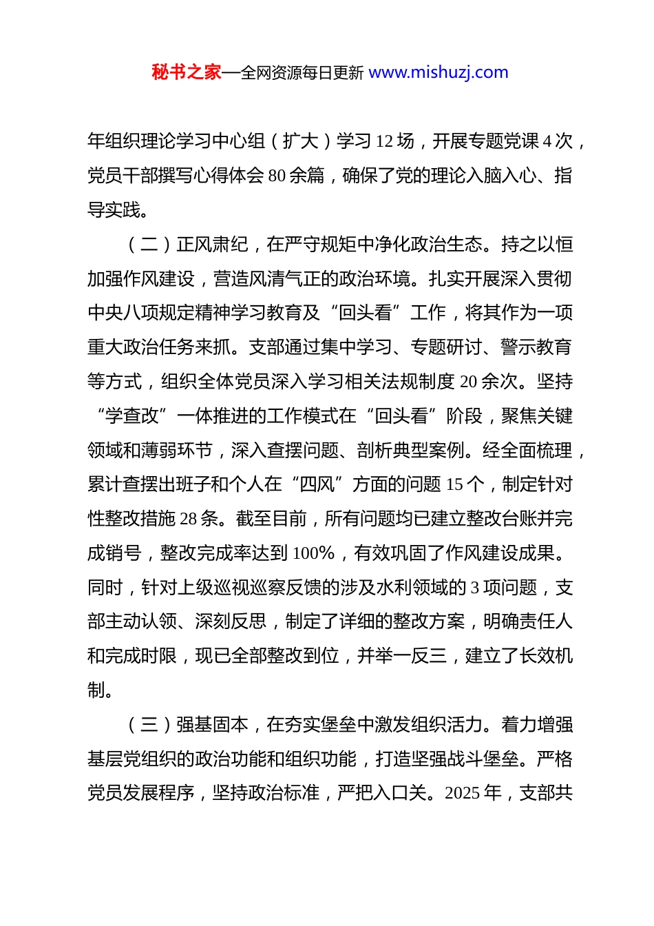 秘书之家—全网资源每日更新 www.mishuzj.com市水利局党支部书记 2025 年度抓基层党建工作述职报告 2025 年,在市委、市政府的坚强领导下,本人作为*市水利局党支部书记,始终坚持以习近平新时代中国特色社会主义思想为指导,全面贯彻党的二十大及二十届四中全会精神,紧紧围绕“围绕水利抓党建、抓好党建促发展”的工作思路,切实履行第一责任人职责,团结带领全体党员干部,为推动*水利事业高质量发展提供了坚强的政治保障和组织保证。根据要求,现将本人 2025 年度抓基层党建工作情况报告如下。一、履职尽责,聚焦主业抓落实,党建工作取得新成效一年来,本人始终把抓好党建作为最大的政绩,坚持守正创新、务实笃行,推动党建工作在传承中发展、在创新中提质。(一)聚力铸魂,在理论武装中筑牢政治忠诚。始终将党的政治建设摆在首位,坚持不懈用党的创新理论凝心铸魂。支部严格落实“第一议题”制度,组织支部委员会和党员大会专题学习习近平总书记最新重要讲话和指示批示精神 38 次。特别是党的二十届四中全会胜利召开后,第一时间组织传达学习,并邀请市委党校专家进行专题辅导,引导全体党员深刻领会全会精神实质,自觉把思想和行动统一到中央决策部署上来。全秘书之家—全网资源每日更新 www.mishuzj.com年组织理论学习中心组(扩大)学习 12 场,开展专题党课 4 次,党员干部撰写心得体会 80 余篇,确保了党的理论入脑入心、指导实践。(二)正风肃纪,在严守规矩中净化政治生态。持之以恒加强作风建设,营造风清气正的政治环境。扎实开展深入贯彻中央八项规定精神学习教育及“回头看”工作,将其作为一项重大政治任务来抓。支部通过集中学习、专题研讨、警示教育等方式,组织全体党员深入学习相关法规制度 20 余次。坚持“学查改”一体推进的工作模式在“回头看”阶段,聚焦关键领域和薄弱环节,深入查摆问题、剖析典型案例。经全面梳理,累计查摆出班子和个人在“四风”方面的问题 15 个,制定针对性整改措施 28 条。截至目前,所有问题均已建立整改台账并完成销号,整改完成率达到 100%,有效巩固了作风建设成果。同时,针对上级巡视巡察反馈的涉及水利领域的 3 项问题,支部主动认领、深刻反思,制定了详细的整改方案,明确责任人和完成时限,现已全部整改到位,并举一反三,建立了长效机制。(三)强基固本,在夯实堡垒中激发组织活力。着力增强基层党组织的政治功能和组织功能,打造坚强战斗堡垒。严格党员发展程序,坚持政治标准,严把入口关。2025 年,支部共秘书之家—全网资源每日更新 www.mishuzj.com发展预备党员 5 名,按期转正党员 4 名,并组织了 8 名入党积极分子参加市直机关工委举办的发展对象集中培训确保了发展党员的质量。圆满完成支部换届选举工作,严格按照《中国共产党基层组织选举工作条例》规定的程序,选举产生了新一届支部委员会。目前全局 3 个党支部换届完成率达到 100%,新一届支委班子结构更加优化,战斗力显著增强。持续推进党支部标准化规范化建设,认真落实“三会一课”、组织生活会、民主评议党员等制度,全年组织各类党员教育培训 25 场次,参训党员覆盖率达到 98%,有效提升了党员队伍的整体素质。(四)融合赋能,在服务大局中彰显党建价值。坚持党建工作与业务工作同谋划、同部署、同落实、同考核破解“两张皮”问题。在今年的*水库除险加固、*流域生态治理等重大水利工程项目中,创新性地开展“党建+重大工程”活动。例如,在*水库除险加固工程现场成立了“党员突击队”,设立“党员责任区”和“党员示范岗”由党员技术骨干带头攻克施工难题,确保了工程质量与安全,项目进度较原计划提前了 15 天。在防汛抗旱工作中,支部发出“党旗在防汛一线高高飘扬”的号召,组建了由 30 名党员组成的防汛抢险先锋队,24 小时值班值守,对全市 28 处重点水利设施进行拉网式排查,成功处置险情 3 起,保障了人民群众生命财产安全。通过将党建链深度融入业务链,秘书之家—全网资源每日更新 www.mishuzj.com真正实现了党建引领业务发展、业务检验党建成效的良性循环。二、深挖细查,正视发...