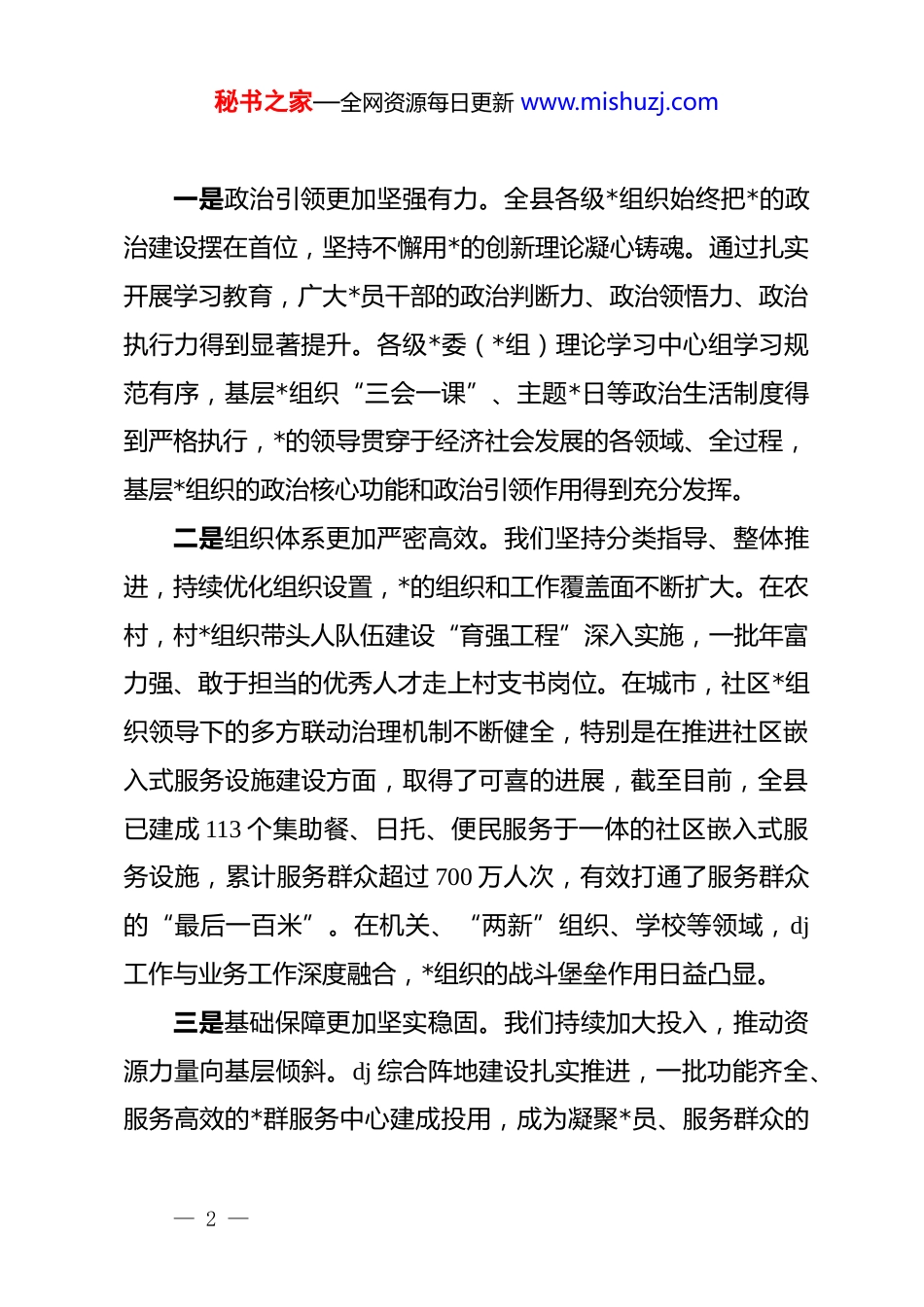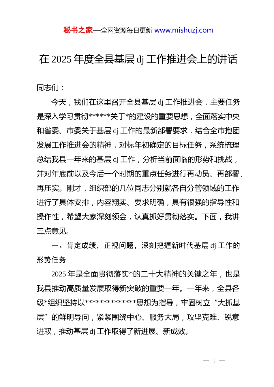 秘书之家—全网资源每日更新 www.mishuzj.com在 2025 年度全县基层 dj 工作推进会上的讲话同志们:今天,我们在这里召开全县基层 dj 工作推进会,主要任务是深入学习贯彻******关于*的建设的重要思想,全面落实中央和省委、市委关于基层 dj 工作的最新部署要求,结合全市抱团发展工作推进会的精神,对标年初确定的目标任务,系统梳理总结我县一年来的基层 dj 工作,分析当前面临的形势和挑战,并对年底前以及今后一个时期的重点任务进行再动员、再部署、再压实。刚才,组织部的几位同志分别就各自分管领域的工作进行了具体安排,内容翔实、要求明确,具有很强的指导性和操作性,希望大家深刻领会,认真抓好贯彻落实。下面,我讲三点意见。一、肯定成绩,正视问题,深刻把握新时代基层 dj 工作的形势任务2025 年是全面贯彻落实*的二十大精神的关键之年,也是我县推动高质量发展取得新突破的重要一年。一年来,全县各级*组织坚持以**************思想为指导,牢固树立“大抓基层”的鲜明导向,紧紧围绕中心、服务大局,攻坚克难、锐意进取,推动基层 dj 工作取得了新进展、新成效。— 1 —秘书之家—全网资源每日更新 www.mishuzj.com一是政治引领更加坚强有力。全县各级*组织始终把*的政治建设摆在首位,坚持不懈用*的创新理论凝心铸魂。通过扎实开展学习教育,广大*员干部的政治判断力、政治领悟力、政治执行力得到显著提升。各级*委(*组)理论学习中心组学习规范有序,基层*组织“三会一课”、主题*日等政治生活制度得到严格执行,*的领导贯穿于经济社会发展的各领域、全过程,基层*组织的政治核心功能和政治引领作用得到充分发挥。二是组织体系更加严密高效。我们坚持分类指导、整体推进,持续优化组织设置,*的组织和工作覆盖面不断扩大。在农村,村*组织带头人队伍建设“育强工程”深入实施,一批年富力强、敢于担当的优秀人才走上村支书岗位。在城市,社区*组织领导下的多方联动治理机制不断健全,特别是在推进社区嵌入式服务设施建设方面,取得了可喜的进展,截至目前,全县已建成 113 个集助餐、日托、便民服务于一体的社区嵌入式服务设施,累计服务群众超过 700 万人次,有效打通了服务群众的“最后一百米”。在机关、“两新”组织、学校等领域,dj工作与业务工作深度融合,*组织的战斗堡垒作用日益凸显。三是基础保障更加坚实稳固。我们持续加大投入,推动资源力量向基层倾斜。dj 综合阵地建设扎实推进,一批功能齐全、服务高效的*群服务中心建成投用,成为凝聚*员、服务群众的— 2 —秘书之家—全网资源每日更新 www.mishuzj.com重要平台。*费收缴、使用和管理工作进一步规范,各单位均能按规定测算、足额收缴,并严格按照程序将*费用于 dj 活动和*员教育,确保每一分钱都用在刀刃上。“灯塔-dj 在线”平台的信息维护工作也得到全面加强,目前,*员信息变动、组织生活记录、*费收缴等关键数据已实现动态更新、准确录入,基层dj 工作的信息化、科学化水平迈上了新台阶。四是服务大局更加彰显作为。全县各级*组织和广大*员紧紧围绕县委、县政府中心工作,在项目建设、乡村振兴、社会治理、疫情防控等急难险重任务中冲锋在前、勇挑重担。特别是在发展壮大村级集体经济方面,各镇街积极探索资源盘活、产业带动、服务创收等多种模式,村集体经济呈现出稳步增长的良好态势。省派第一书记充分发挥桥梁纽带作用,一批帮扶项目落地见效,为派驻村的发展注入了新的活力和动能。同时,我们高度重视人才工作,通过深入企业摸排技术人才需求、加强重点人才信息统计,为我县产业转型升级提供了有力的人才支撑。在充分肯定成绩的同时,我们更要清醒地看到,对照新时代*的建设总要求,对照高质量发展的迫切需要,对照人民群众的热切期盼,我县的基层 dj 工作还存在一些不容忽视的短板和弱项。比如,有的*组织政治功能发挥还不够充分,dj 工作与中— 3 —秘书之家—全网资源每日更新 www.mishuzj.com心工作“两张皮”的现象依然存在;有的*组织书记抓 dj 主业意识不强,责任压力传导层层递减;有的领域 dj 工作创新不足,习惯于老办法、旧套路...