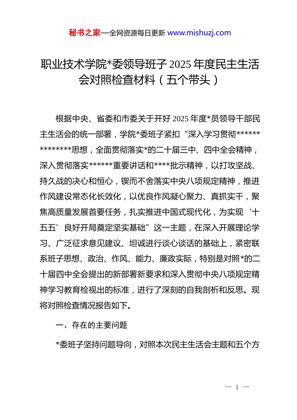 秘书之家—全网资源每日更新 www.mishuzj.com职业技术学院*委领导班子 2025 年度民主生活会对照检查材料(五个带头)根据中央、省委和市委关于开好 2025 年度*员领导干部民主生活会的统一部署,学院*委班子紧扣“深入学习贯彻**************思想,全面贯彻落实*的二十届三中、四中全会精神,深入贯彻落实******重要讲话和****批示精神,以打攻坚战、持久战的决心和恒心,锲而不舍落实中央八项规定精神,推进作风建设常态化长效化,以优良作风凝心聚力、真抓实干,聚焦高质量发展首要任务,扎实推进中国式现代化,为实现‘十五五’良好开局奠定坚实基础”这一主题,在深入开展理论学习、广泛征求意见建议、坦诚进行谈心谈话的基础上,紧密联系班子思想、政治、作风、能力、廉政实际,特别是对照*的二十届四中全会提出的新部署新要求和深入贯彻中央八项规定精神学习教育检视出的标准,进行了深刻的自我剖析和反思。现将对照检查情况报告如下。一、存在的主要问题*委班子坚持问题导向,对照本次民主生活会主题和五个方— 1 —秘书之家—全网资源每日更新 www.mishuzj.com面重点要求,把自己摆进去、把职责摆进去、把工作摆进去,认真查摆了以下突出问题。(一)在带头强化政治忠诚、提高政治能力方面。一是理论武装向实践转化的穿透力有待加强。班子能够坚持将学习贯彻**************思想作为首要政治任务,但在将其蕴含的立场观点方法转化为推动学院高质量发展的具体思路和有效举措上,结合度、转化率还不够高。例如,在谋划学院“十五五”发展规划前期研究时,虽然组织了专题学习,但在将“发展新质生产力”等重大战略思想与学院专业动态调整,尤其是人工智能技术应用等新兴专业建设深度耦合方面,系统性、前瞻性的战略布局还不够清晰,部分论证仍停留在宏观层面,具体路径和突破性抓手谋划不够精准。对*的二十届四中全会精神,如何更有效地融入学院内部治理改革,构建与现代职业教育体系相适应的治理模式,思考的深度和实践的力度尚有提升空间。二是政治判断力、政治领悟力、政治执行力的“最后一公里”有待夯实。班子能够自觉在思想上政治上行动上同*中央保持高度一致,坚决贯彻落实中央、省委和市委的各项决策部署。但在结合学院实际创造性地开展工作方面,有时存在一定的“路径依赖”。比如,在落实国家“双高计划”建设任务,特别是— 2 —秘书之家—全网资源每日更新 www.mishuzj.com推动畜牧兽医高水平专业群内涵式发展过程中,虽然明确了“以群强院、按群管理”的方向,但在打破原有院系壁垒、优化资源配置、激发跨专业协同创新活力等方面,攻坚克难的锐气和一抓到底的韧劲还需进一步强化,部分改革举措落地见效的周期偏长。面对职业教育改革发展的新形势新挑战,运用政治眼光观察和分析职教领域风险隐患的能力有待进一步提升。三是在严明政治纪律和政治规矩的日常监督上存在薄弱环节。班子成员能够自觉遵守*的各项纪律,但在抓常抓长、落细落小上还需加强。例如,在规范*员干部网络言行、引导其在网络空间发挥积极作用方面,虽然提出了原则性要求,也进行过提醒教育,但建立常态化监测、引导和应急处置机制方面还不够完善,未能将这项政治要求完全融入日常的师德师风建设和学生思想政治教育体系之中,针对性、实效性有待增强。(二)在带头固本培元、增强*性方面。一是理想信念教育的时代感和感染力有待提升。班子坚持把政治修养摆在首位,持续用*的创新理论武装头脑。然而,在引导广大师生*员筑牢信仰之基、补足精神之钙、把稳思想之舵的方式方法上,有时习惯于传统模式,运用新媒体新技术、结合青年师生思想特点开展沉浸式、互动式*性教育探索不足。例如,在利用学院拥有— 3 —秘书之家—全网资源每日更新 www.mishuzj.com的省部级科研平台及在中兽药研发、茶叶综合利用等领域取得的成果,挖掘其中蕴含的科学家精神、工匠精神,并将其转化为生动*性教育素材方面,做得还不够系统、不够鲜活,理想信念教育的吸引力、穿透力有待进一步增强。二是*性锻炼的主动性和严肃性有待强化。班子成员能够参加双重组织生活,但在以普通*员身份深入所在支部,带头开展严...