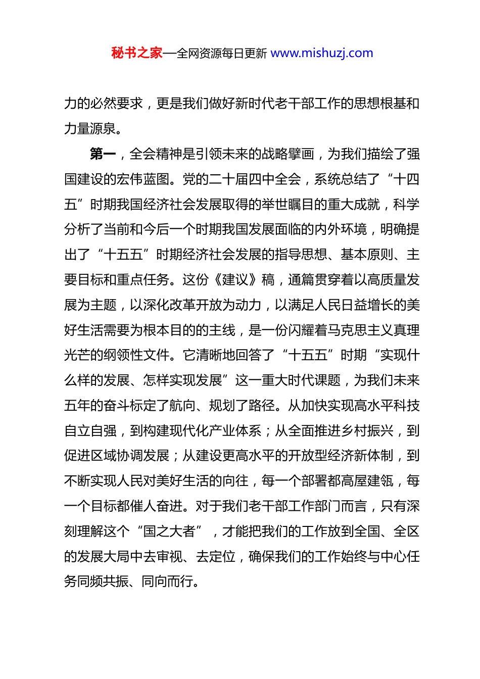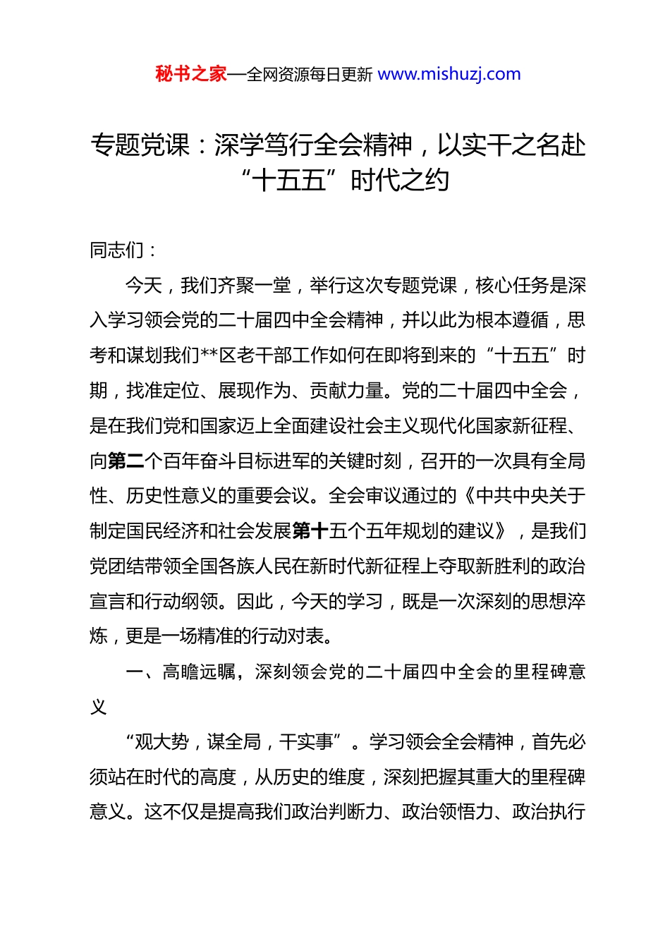 秘书之家—全网资源每日更新 www.mishuzj.com专题党课:深学笃行全会精神,以实干之名赴“十五五”时代之约 同志们:今天,我们齐聚一堂,举行这次专题党课,核心任务是深入学习领会党的二十届四中全会精神,并以此为根本遵循,思考和谋划我们**区老干部工作如何在即将到来的“十五五”时期,找准定位、展现作为、贡献力量。党的二十届四中全会,是在我们党和国家迈上全面建设社会主义现代化国家新征程、向第二个百年奋斗目标进军的关键时刻,召开的一次具有全局性、历史性意义的重要会议。全会审议通过的《中共中央关于制定国民经济和社会发展第十五个五年规划的建议》,是我们党团结带领全国各族人民在新时代新征程上夺取新胜利的政治宣言和行动纲领。因此,今天的学习,既是一次深刻的思想淬炼,更是一场精准的行动对表。一、高瞻远瞩,深刻领会党的二十届四中全会的里程碑意义“观大势,谋全局,干实事”。学习领会全会精神,首先必须站在时代的高度,从历史的维度,深刻把握其重大的里程碑意义。这不仅是提高我们政治判断力、政治领悟力、政治执行秘书之家—全网资源每日更新 www.mishuzj.com力的必然要求,更是我们做好新时代老干部工作的思想根基和力量源泉。第一,全会精神是引领未来的战略擘画,为我们描绘了强国建设的宏伟蓝图。党的二十届四中全会,系统总结了“十四五”时期我国经济社会发展取得的举世瞩目的重大成就,科学分析了当前和今后一个时期我国发展面临的内外环境,明确提出了“十五五”时期经济社会发展的指导思想、基本原则、主要目标和重点任务。这份《建议》稿,通篇贯穿着以高质量发展为主题,以深化改革开放为动力,以满足人民日益增长的美好生活需要为根本目的的主线,是一份闪耀着马克思主义真理光芒的纲领性文件。它清晰地回答了“十五五”时期“实现什么样的发展、怎样实现发展”这一重大时代课题,为我们未来五年的奋斗标定了航向、规划了路径。从加快实现高水平科技自立自强,到构建现代化产业体系;从全面推进乡村振兴,到促进区域协调发展;从建设更高水平的开放型经济新体制,到不断实现人民对美好生活的向往,每一个部署都高屋建瓴,每一个目标都催人奋进。对于我们老干部工作部门而言,只有深刻理解这个“国之大者”,才能把我们的工作放到全国、全区的发展大局中去审视、去定位,确保我们的工作始终与中心任务同频共振、同向而行。秘书之家—全网资源每日更新 www.mishuzj.com第二,全会精神是指导实践的科学指南,为我们提供了砥砺前行的思想武器。思想是行动的先导。全会精神的核心要义,集中体现在一系列新思想、新论断、新要求上。全会再次深刻阐明,“两个确立”是战胜一切艰难险阻、应对一切不确定性的最大确定性、最大底气、最大保证。这要求我们必须把深刻领悟“两个确立”的决定性意义作为首要政治任务,不断增强“四个意识”、坚定“四个自信”、做到“两个维护”,始终在思想上政治上行动上同以习近平同志为核心的党中央保持高度一致。全会强调要坚持和加强党的全面领导,坚持以人民为中心的发展思想,坚持稳中求进工作总基调。这些重要的原则和理念,既是对过去成功经验的深刻总结,也为我们应对未来挑战提供了根本遵循。我们做老干部工作的同志,离党和人民最近,服务的是为党和人民事业奋斗一生的功臣。因此,我们更要带头学深悟透这些科学指南,将其内化为我们的政治信念,外化为我们服务老干部的具体行动,确保老干部工作始终沿着正确政治方向前进。第三,全会精神是推进治理的强大引擎,为我们擘画了社会建设的崭新格局。国家治理体系和治理能力现代化,是实现社会主义现代化的重要保障。党的二十届四中全会,对推进国家治理体系和治理能力现代化作出了新的战略部署。其中,在秘书之家—全网资源每日更新 www.mishuzj.com增进民生福祉、提高人民生活品质方面,全会提出了健全社会保障体系、推进健康中国建设、积极应对人口老龄化等一系列重大举措。这充分体现了我们党深厚的为民情怀和强烈的历史担当。积极应对人口老龄化已经上升为国家战略,而老干部工作,正是这项战略的重要组成部分。全会关于养老服务体系建设、...