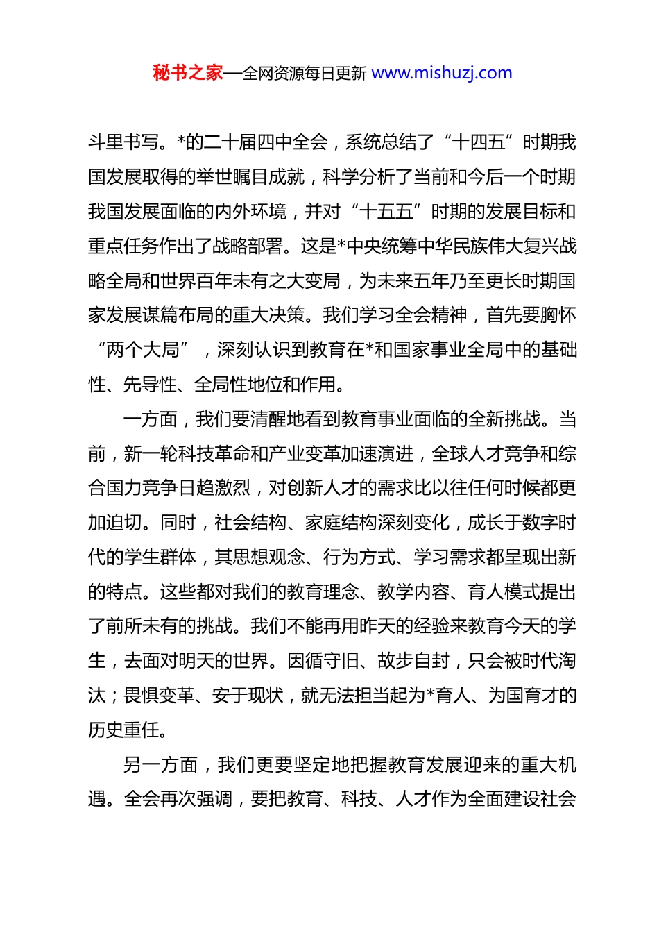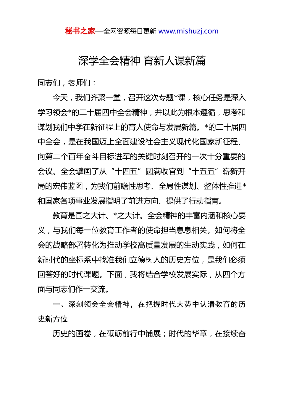 秘书之家—全网资源每日更新 www.mishuzj.com深学全会精神 育新人谋新篇同志们,老师们:今天,我们齐聚一堂,召开这次专题*课,核心任务是深入学习领会*的二十届四中全会精神,并以此为根本遵循,思考和谋划我们中学在新征程上的育人使命与发展新篇。*的二十届四中全会,是在我国迈上全面建设社会主义现代化国家新征程、向第二个百年奋斗目标进军的关键时刻召开的一次十分重要的会议。全会擘画了从“十四五”圆满收官到“十五五”崭新开局的宏伟蓝图,为我们前瞻性思考、全局性谋划、整体性推进*和国家各项事业发展指明了前进方向、提供了行动指南。教育是国之大计、*之大计。全会精神的丰富内涵和核心要义,与我们每一位教育工作者的使命担当息息相关。如何将全会的战略部署转化为推动学校高质量发展的生动实践,如何在新时代的坐标系中找准我们立德树人的历史方位,是我们必须回答好的时代课题。下面,我将结合学校发展实际,从四个方面与同志们作一交流。一、深刻领会全会精神,在把握时代大势中认清教育的历史新方位历史的画卷,在砥砺前行中铺展;时代的华章,在接续奋秘书之家—全网资源每日更新 www.mishuzj.com斗里书写。*的二十届四中全会,系统总结了“十四五”时期我国发展取得的举世瞩目成就,科学分析了当前和今后一个时期我国发展面临的内外环境,并对“十五五”时期的发展目标和重点任务作出了战略部署。这是*中央统筹中华民族伟大复兴战略全局和世界百年未有之大变局,为未来五年乃至更长时期国家发展谋篇布局的重大决策。我们学习全会精神,首先要胸怀“两个大局”,深刻认识到教育在*和国家事业全局中的基础性、先导性、全局性地位和作用。一方面,我们要清醒地看到教育事业面临的全新挑战。当前,新一轮科技革命和产业变革加速演进,全球人才竞争和综合国力竞争日趋激烈,对创新人才的需求比以往任何时候都更加迫切。同时,社会结构、家庭结构深刻变化,成长于数字时代的学生群体,其思想观念、行为方式、学习需求都呈现出新的特点。这些都对我们的教育理念、教学内容、育人模式提出了前所未有的挑战。我们不能再用昨天的经验来教育今天的学生,去面对明天的世界。因循守旧、故步自封,只会被时代淘汰;畏惧变革、安于现状,就无法担当起为*育人、为国育才的历史重任。另一方面,我们更要坚定地把握教育发展迎来的重大机遇。全会再次强调,要把教育、科技、人才作为全面建设社会秘书之家—全网资源每日更新 www.mishuzj.com主义现代化国家的基础性、战略性支撑。国家对教育的高度重视,为我们办好人民满意的教育提供了最坚实的保障。“十五五”规划建议中关于深化教育领域综合改革、加快建设高质量教育体系的部署,为我们指明了清晰的前进路径。特别是数字化、智能化浪潮,为我们破解教育发展不平衡不充分的难题、实现教育形态的革命性重塑,提供了强大的技术赋能。这是我们必须紧紧抓住、主动作为的战略机遇。作为 xx 省 xx 市的一所重点中学,xx 中学自创办以来,便承载着区域人民对优质教育的殷切期盼。我们有着光荣的传统和深厚的底蕴,这是我们发展的宝贵财富。但站在新的历史起点上,我们全体教职员工必须以更高的站位、更宽的视野来审视我们的工作。要深刻认识到,我们培养的不仅仅是能够考上好大学的学生,更是担当民族复兴大任的时代新人;我们追求的不仅仅是升学率的节节攀升,更是学校办学品位和核心竞争力的全面跃升。我们必须主动将学校的发展融入国家发展的宏大叙事之中,在继承优良传统的基础上勇于创新突破,以思想的“破冰”引领行动的“突围”,在服务国家战略和区域发展中展现新担当、作出新贡献。二、坚守立德树人初心,在深化改革创新中激发办学的新活力秘书之家—全网资源每日更新 www.mishuzj.com为谁培养人、培养什么人、怎样培养人,是教育的根本问题,也是检验我们一切工作的根本标准。*的二十届四中全会精神,归根结底是要落实到“育新人”这一核心任务上。新时代的“新人”,必须是德智体美劳全面发展的社会主义建设者和接班人,是有理想、有本领、有担当的时代栋梁。这就要求我们必须始终坚持立德树人根本任务不动摇,...