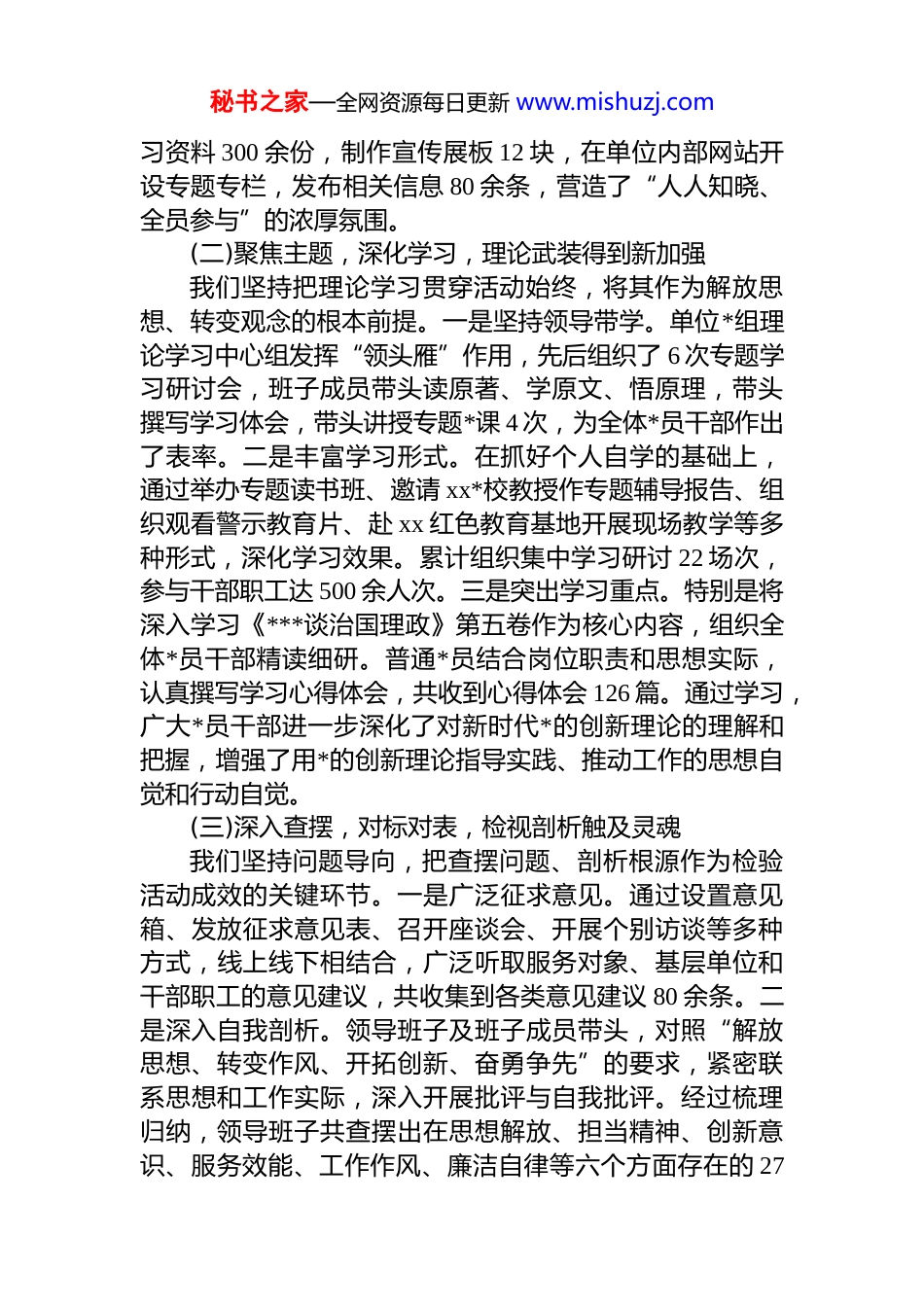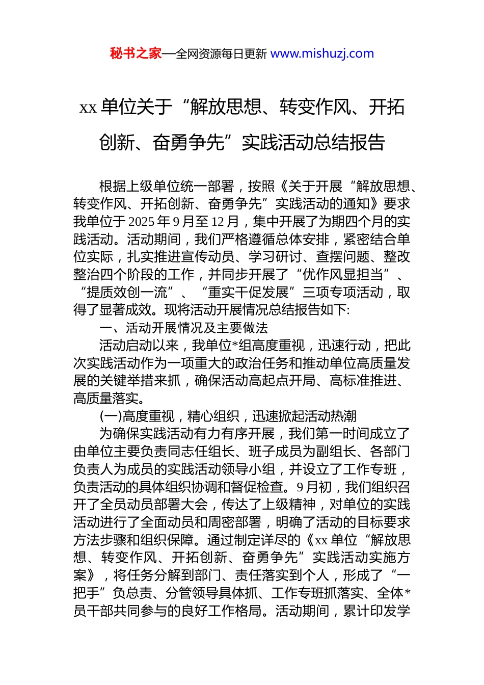 秘书之家—全网资源每日更新 www.mishuzj.comxx 单位关于“解放思想、转变作风、开拓创新、奋勇争先”实践活动总结报告根据上级单位统一部署,按照《关于开展“解放思想、转变作风、开拓创新、奋勇争先”实践活动的通知》要求我单位于 2025 年 9 月至 12 月,集中开展了为期四个月的实践活动。活动期间,我们严格遵循总体安排,紧密结合单位实际,扎实推进宣传动员、学习研讨、查摆问题、整改整治四个阶段的工作,并同步开展了“优作风显担当”、“提质效创一流”、“重实干促发展”三项专项活动,取得了显著成效。现将活动开展情况总结报告如下:一、活动开展情况及主要做法活动启动以来,我单位*组高度重视,迅速行动,把此次实践活动作为一项重大的政治任务和推动单位高质量发展的关键举措来抓,确保活动高起点开局、高标准推进、高质量落实。(一)高度重视,精心组织,迅速掀起活动热潮为确保实践活动有力有序开展,我们第一时间成立了由单位主要负责同志任组长、班子成员为副组长、各部门负责人为成员的实践活动领导小组,并设立了工作专班,负责活动的具体组织协调和督促检查。9 月初,我们组织召开了全员动员部署大会,传达了上级精神,对单位的实践活动进行了全面动员和周密部署,明确了活动的目标要求方法步骤和组织保障。通过制定详尽的《xx 单位“解放思想、转变作风、开拓创新、奋勇争先”实践活动实施方案》,将任务分解到部门、责任落实到个人,形成了“一把手”负总责、分管领导具体抓、工作专班抓落实、全体*员干部共同参与的良好工作格局。活动期间,累计印发学秘书之家—全网资源每日更新 www.mishuzj.com习资料 300 余份,制作宣传展板 12 块,在单位内部网站开设专题专栏,发布相关信息 80 余条,营造了“人人知晓、全员参与”的浓厚氛围。(二)聚焦主题,深化学习,理论武装得到新加强我们坚持把理论学习贯穿活动始终,将其作为解放思想、转变观念的根本前提。一是坚持领导带学。单位*组理论学习中心组发挥“领头雁”作用,先后组织了 6 次专题学习研讨会,班子成员带头读原著、学原文、悟原理,带头撰写学习体会,带头讲授专题*课 4 次,为全体*员干部作出了表率。二是丰富学习形式。在抓好个人自学的基础上,通过举办专题读书班、邀请 xx*校教授作专题辅导报告、组织观看警示教育片、赴 xx 红色教育基地开展现场教学等多种形式,深化学习效果。累计组织集中学习研讨 22 场次,参与干部职工达 500 余人次。三是突出学习重点。特别是将深入学习《***谈治国理政》第五卷作为核心内容,组织全体*员干部精读细研。普通*员结合岗位职责和思想实际,认真撰写学习心得体会,共收到心得体会 126 篇。通过学习,广大*员干部进一步深化了对新时代*的创新理论的理解和把握,增强了用*的创新理论指导实践、推动工作的思想自觉和行动自觉。(三)深入查摆,对标对表,检视剖析触及灵魂我们坚持问题导向,把查摆问题、剖析根源作为检验活动成效的关键环节。一是广泛征求意见。通过设置意见箱、发放征求意见表、召开座谈会、开展个别访谈等多种方式,线上线下相结合,广泛听取服务对象、基层单位和干部职工的意见建议,共收集到各类意见建议 80 余条。二是深入自我剖析。领导班子及班子成员带头,对照“解放思想、转变作风、开拓创新、奋勇争先”的要求,紧密联系思想和工作实际,深入开展批评与自我批评。经过梳理归纳,领导班子共查摆出在思想解放、担当精神、创新意识、服务效能、工作作风、廉洁自律等六个方面存在的 27秘书之家—全网资源每日更新 www.mishuzj.com个具体问题。班子成员也分别形成了个人问题清单。三是普通*员全面检视。普通*员在学习《***谈治国理政》第五卷的基础上,结合心得体会的撰写,深入查找自身在理论学习、*性修养、履职尽责等方面存在的差距和不足,并在心得体会中明确了个人存在的问题及整改措施,实现了问题查摆的全员覆盖、不留死角。(四)动真碰硬,狠抓整改,问题整治取得新突破我们坚持“当下改”与“长久立”相结合,以钉钉子精神推动问题整改落实见效。一是建立三张清单。针对查摆出的 27 个问题,逐...