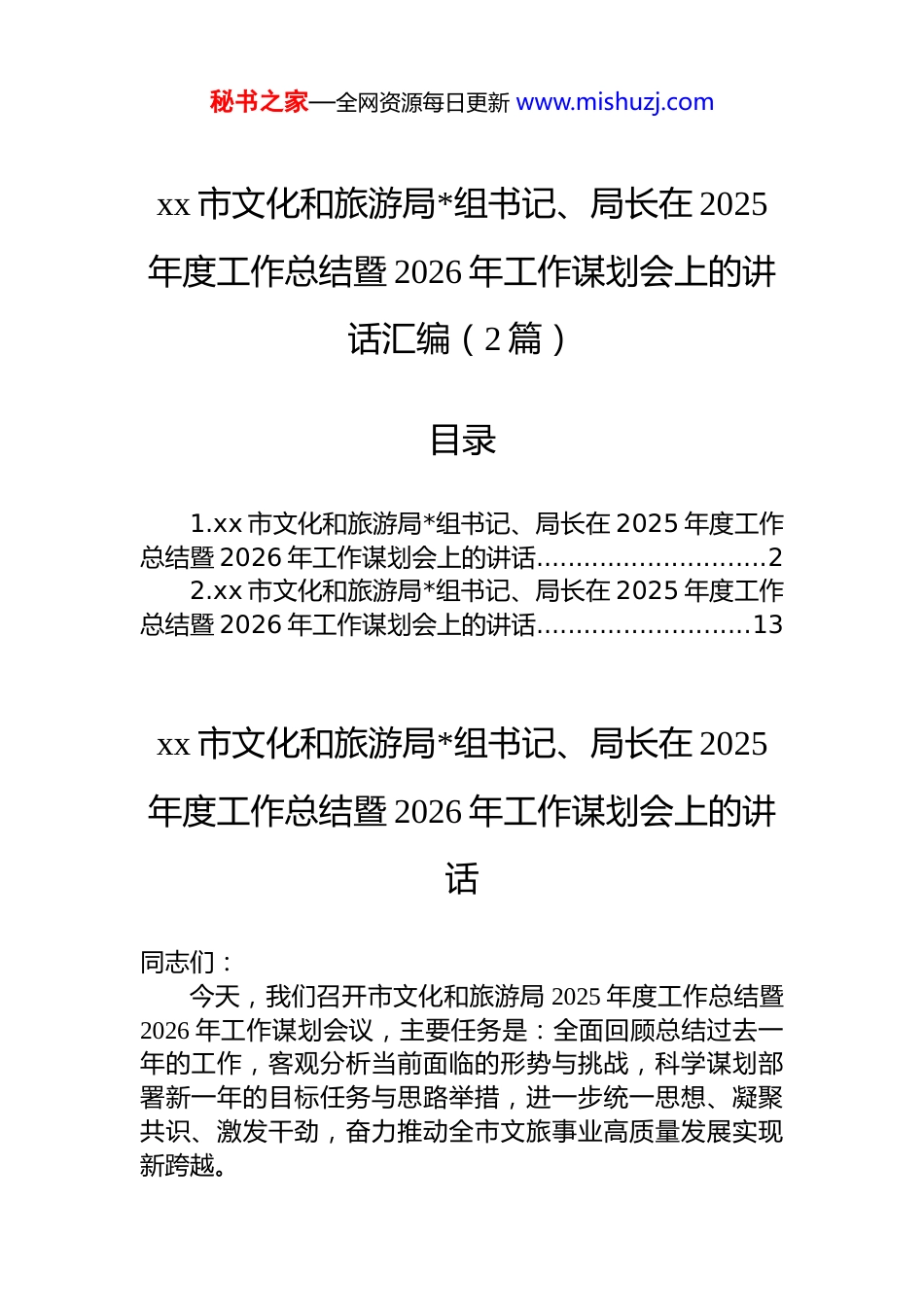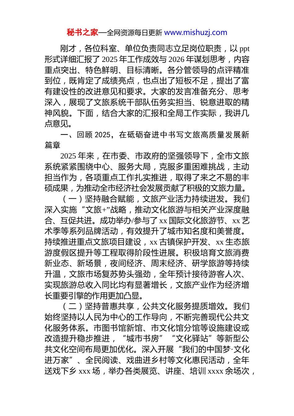 秘书之家—全网资源每日更新 www.mishuzj.comxx 市文化和旅游局*组书记、局长在 2025年度工作总结暨 2026 年工作谋划会上的讲话汇编(2 篇)目录1.xx 市文化和旅游局*组书记、局长在 2025 年度工作总结暨 2026 年工作谋划会上的讲话.............................22.xx 市文化和旅游局*组书记、局长在 2025 年度工作总结暨 2026 年工作谋划会上的讲话...........................13xx 市文化和旅游局*组书记、局长在 2025年度工作总结暨 2026 年工作谋划会上的讲话同志们:今天,我们召开市文化和旅游局 2025 年度工作总结暨2026 年工作谋划会议,主要任务是:全面回顾总结过去一年的工作,客观分析当前面临的形势与挑战,科学谋划部署新一年的目标任务与思路举措,进一步统一思想、凝聚共识、激发干劲,奋力推动全市文旅事业高质量发展实现新跨越。秘书之家—全网资源每日更新 www.mishuzj.com刚才,各位科室、单位负责同志立足岗位职责,以 ppt形式详细汇报了 2025 年工作成效与 2026 年谋划思考,内容重点突出、特色鲜明、目标清晰。各分管领导的点评精准到位,既肯定了成绩亮点,也点出了短板不足,提出了富有建设性的改进意见和要求。大家的发言准备充分、思考深入,展现了文旅系统干部队伍务实担当、锐意进取的精神风貌。下面,结合大家的汇报和全局工作实际,我讲几点意见。一、回顾 2025,在砥砺奋进中书写文旅高质量发展新篇章2025 年来,在市委、市政府的坚强领导下,全市文旅系统紧紧围绕中心、服务大局,克服多重困难挑战,主动担当作为,各项重点工作扎实推进,取得了来之不易的丰硕成果,为推动全市经济社会发展贡献了积极的文旅力量。(一)坚持融合赋能,文旅产业活力持续迸发。我们深入实施“文旅+”战略,推动文化旅游与相关产业深度融合、互促共进。成功举办/参与了 xx 国际文化旅游节、xx 艺术季等系列品牌活动,有效提升了城市知名度和美誉度。持续推进重点文旅项目建设,xx 古镇保护开发、xx 生态旅游度假区提升等工程取得阶段性进展。积极培育文旅消费新业态、新场景,夜间经济、周末经济、研学旅游等持续升温,文旅市场复苏势头强劲,全年预计接待游客人次、实现旅游总收入同比均有显著增长,文旅产业作为经济增长重要引擎的作用更加凸显。(二)坚持普惠共享,公共文化服务提质增效。我们始终坚持以人民为中心的工作导向,不断完善现代公共文化服务体系。市图书馆新馆、市文化馆分馆等设施建设或改造提升稳步推进,“城市书房”“文化驿站”等新型公共文化空间布局更加优化。深入开展“我们的中国梦·文化进万家”、全民阅读、戏曲进乡村等文化惠民活动,全年送戏下乡 xxx 场,举办各类展览、讲座、培训 xxxx 余场次,秘书之家—全网资源每日更新 www.mishuzj.com惠及群众超百万人次。数字文化服务能力持续提升,线上资源供给更加丰富便捷,公共文化服务的覆盖面、适用性满意度进一步提高。(三)坚持守正创新,文化遗产保护利用成果丰硕。我们切实加大文物保护力度,完成 xx 处文物保护单位修缮工程,文物安全形势保持稳定。非物质文化遗产保护传承体系更加健全,新增 xx 项市级非遗代表性项目,认定一批非遗工坊、传承体验中心。推动非遗融入现代生活,成功举办非遗展示展销、非遗技艺大赛等活动,让古老非遗在当代焕发新的生机。加强考古发掘与研究阐释,xx 考古遗址公园建设有序推进,文化遗产在赓续城市文脉、坚定文化自信中的作用更加彰显。(四)坚持精准营销,城市文旅形象更加鲜明。我们创新宣传推广方式,整合利用传统媒体与新媒体平台,策划开展系列主题营销活动,“xx(城市品牌口号)”城市形象更加深入人心。加强与重要客源地、在线旅行商(ota)的合作,拓展线上线下营销渠道。积极应对市场变化,及时发布文旅消费提示、优惠政策,营造了安全、有序、温馨的文旅市场环境。文旅市场秩序规范有序,投诉处理及时高效,游客满意度维持在较高水平。(五)坚持固本强基,文旅发展基础不断夯实。我们持续加强*的建设,扎实开展 zt 教育,引导全系统*员干部深刻领悟“两个确立”的决定性意义,坚...