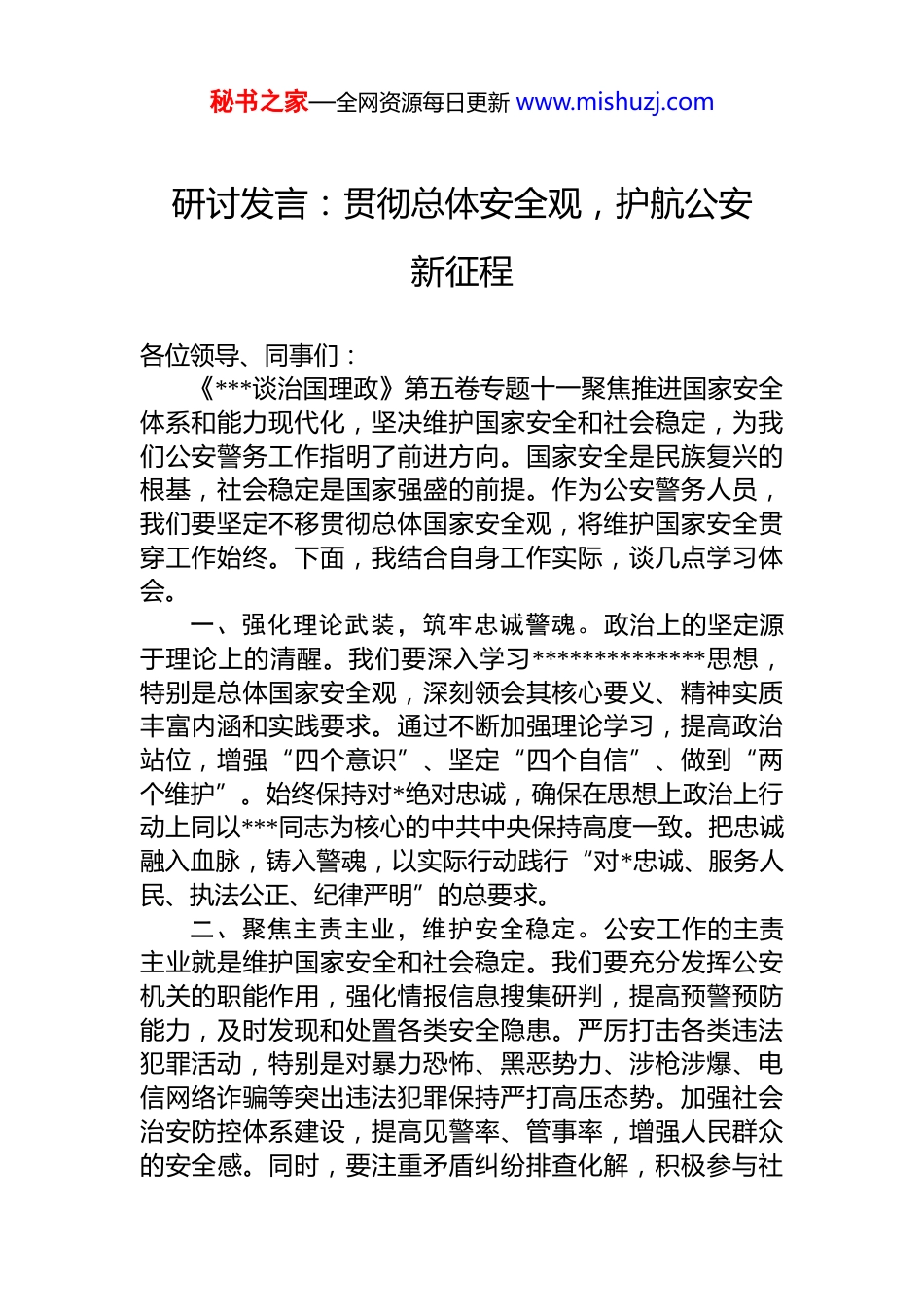 秘书之家—全网资源每日更新 www.mishuzj.com研讨发言:贯彻总体安全观,护航公安新征程各位领导、同事们:《***谈治国理政》第五卷专题十一聚焦推进国家安全体系和能力现代化,坚决维护国家安全和社会稳定,为我们公安警务工作指明了前进方向。国家安全是民族复兴的根基,社会稳定是国家强盛的前提。作为公安警务人员,我们要坚定不移贯彻总体国家安全观,将维护国家安全贯穿工作始终。下面,我结合自身工作实际,谈几点学习体会。一、强化理论武装,筑牢忠诚警魂。政治上的坚定源于理论上的清醒。我们要深入学习**************思想,特别是总体国家安全观,深刻领会其核心要义、精神实质丰富内涵和实践要求。通过不断加强理论学习,提高政治站位,增强“四个意识”、坚定“四个自信”、做到“两个维护”。始终保持对*绝对忠诚,确保在思想上政治上行动上同以***同志为核心的中共中央保持高度一致。把忠诚融入血脉,铸入警魂,以实际行动践行“对*忠诚、服务人民、执法公正、纪律严明”的总要求。二、聚焦主责主业,维护安全稳定。公安工作的主责主业就是维护国家安全和社会稳定。我们要充分发挥公安机关的职能作用,强化情报信息搜集研判,提高预警预防能力,及时发现和处置各类安全隐患。严厉打击各类违法犯罪活动,特别是对暴力恐怖、黑恶势力、涉枪涉爆、电信网络诈骗等突出违法犯罪保持严打高压态势。加强社会治安防控体系建设,提高见警率、管事率,增强人民群众的安全感。同时,要注重矛盾纠纷排查化解,积极参与社秘书之家—全网资源每日更新 www.mishuzj.com会治理,从源头上预防和减少不稳定因素,为经济社会发展创造安全稳定的社会环境。三、严格规范执法,彰显公平正义。执法公正是公安工作的生命线。我们要牢固树立法治思维,严格按照法定权限和程序行使权力、履行职责。加强执法规范化建设,完善执法制度,规范执法行为,提高执法质量。在执法过程中,要做到严格规范公正文明执法,确保每一起案件都经得起法律和历史的检验。同时,要加强执法监督,建立健全执法监督机制,及时纠正执法中的问题和偏差,防止执法不公、执法不严等现象发生。通过严格规范执法,彰显社会公平正义,提升公安机关的执法公信力。四、加强自身建设,提升能力素质。公安工作面临的形势日益复杂,任务日益艰巨,对我们的能力素质提出了更高要求。我们要加强自身建设,不断提升综合素质和业务能力。通过开展岗位练兵、实战培训等活动,提高应对复杂情况、解决实际问题的能力。加强纪律作风建设,严格遵守各项纪律规定,坚决杜绝违法违纪行为。保持清正廉洁的政治本色,树立良好的公安形象。同时,要注重团队协作,形成工作合力,共同推动公安工作不断取得新成效。同志们,维护国家安全和社会稳定责任重大、使命光荣。让我们以**************思想为指引,深入贯彻总体国家安全观,忠诚履职、担当作为,为推进国家安全体系和能力现代化、维护国家安全和社会稳定贡献我们的力量!谢谢大家!