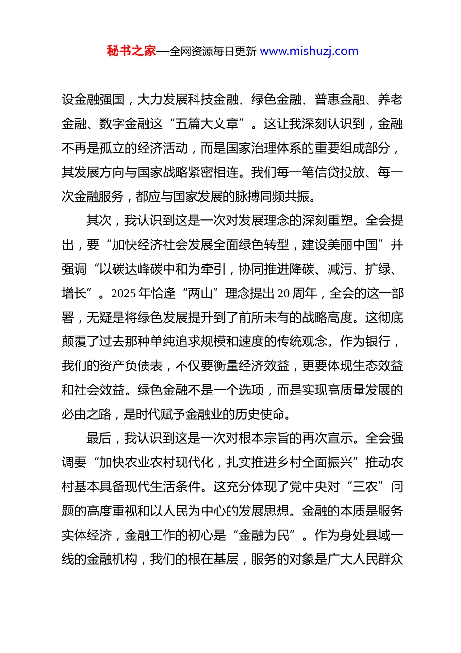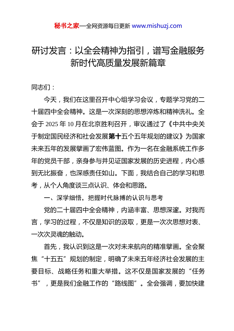 秘书之家—全网资源每日更新 www.mishuzj.com研讨发言:以全会精神为指引,谱写金融服务新时代高质量发展新篇章 同志们:今天,我们在这里召开中心组学习会议,专题学习党的二十届四中全会精神。这是一次深刻的思想淬炼和精神洗礼。全会于 2025 年 10 月在北京胜利召开,审议通过了《中共中央关于制定国民经济和社会发展第十五个五年规划的建议》为国家未来五年的发展擘画了宏伟蓝图。作为一名在金融系统工作多年的党员干部,亲身参与并见证国家发展的历史进程,内心感到无比振奋,也深感责任如山。下面,我结合自己的学习和思考,从个人角度谈三点认识、体会和思路。一、深学细悟,把握时代脉搏的认识与思考党的二十届四中全会精神,内涵丰富、思想深邃。对我而言,学习的过程,不仅是知识的汲取,更是一次次思想对表、一次次灵魂的触动。首先,我认识到这是一次对未来航向的精准擘画。全会聚焦“十五五”规划的制定,明确了未来五年经济社会发展的主要目标、战略任务和重大举措。这不仅是国家发展的“任务书”,更是我们金融工作的“路线图”。全会强调,要加快建秘书之家—全网资源每日更新 www.mishuzj.com设金融强国,大力发展科技金融、绿色金融、普惠金融、养老金融、数字金融这“五篇大文章”。这让我深刻认识到,金融不再是孤立的经济活动,而是国家治理体系的重要组成部分,其发展方向与国家战略紧密相连。我们每一笔信贷投放、每一次金融服务,都应与国家发展的脉搏同频共振。其次,我认识到这是一次对发展理念的深刻重塑。全会提出,要“加快经济社会发展全面绿色转型,建设美丽中国”并强调“以碳达峰碳中和为牵引,协同推进降碳、减污、扩绿、增长”。2025 年恰逢“两山”理念提出 20 周年,全会的这一部署,无疑是将绿色发展提升到了前所未有的战略高度。这彻底颠覆了过去那种单纯追求规模和速度的传统观念。作为银行,我们的资产负债表,不仅要衡量经济效益,更要体现生态效益和社会效益。绿色金融不是一个选项,而是实现高质量发展的必由之路,是时代赋予金融业的历史使命。最后,我认识到这是一次对根本宗旨的再次宣示。全会强调要“加快农业农村现代化,扎实推进乡村全面振兴”推动农村基本具备现代生活条件。这充分体现了党中央对“三农”问题的高度重视和以人民为中心的发展思想。金融的本质是服务实体经济,金融工作的初心是“金融为民”。作为身处县域一线的金融机构,我们的根在基层,服务的对象是广大人民群众秘书之家—全网资源每日更新 www.mishuzj.com和千千万万的中小微企业。如何将金融“活水”精准滴灌到田间地头,送到最需要的农户手中,守护好老百姓的“钱袋子”,这是全会精神给我们提出的最直接、最朴素也最深刻的考题。二、对标反思,触及初心的感悟与体会在学习全会精神的过程中,我常常对照自己的工作进行反思,内心涌现出三种强烈的体会。体会之一,是“本领恐慌”的紧迫感。面对全会提出的发展“五篇大文章”等新任务、新要求,我深刻感受到,旧的知识体系、老的思维模式和传统的工作方法已经难以适应新时代的要求。比如,在服务乡村振兴时,我们是否真正了解本地特色产业的金融需求?在 2024 年,我们*县的茶叶年产值已达 14亿元,花椒产业也蓬勃发展,亩均收益可观。但我们的金融产品是否真的跟上了产业发展的步伐?是简单地提供一笔贷款,还是能够设计出贯穿种植、加工、销售全产业链的金融服务方案?在推进绿色金融时,我们是否具备识别和评估绿色项目风险与机遇的专业能力?这种从“要我服务”到“我要服务”的思想转变,驱动着我必须带领团队持续学习,提升专业素养,否则就会在时代的洪流中落伍。体会之二,是“时我不待”的责任感。全会为“十五五”时期擘画了蓝图,这是一个需要不懈努力、接续奋斗的历史进秘书之家—全网资源每日更新 www.mishuzj.com程。作为县域支行的“领头雁”,我深知自己肩上的担子有多重。总行有宏伟的战略,分行有明确的部署,但最终的落脚点都在我们基层。党中央的决策部署能否在基层落地生根、开花结果,关键在于我们的执行力。我常常自问:我是否只是为了完成上级下达的指标而工作,...