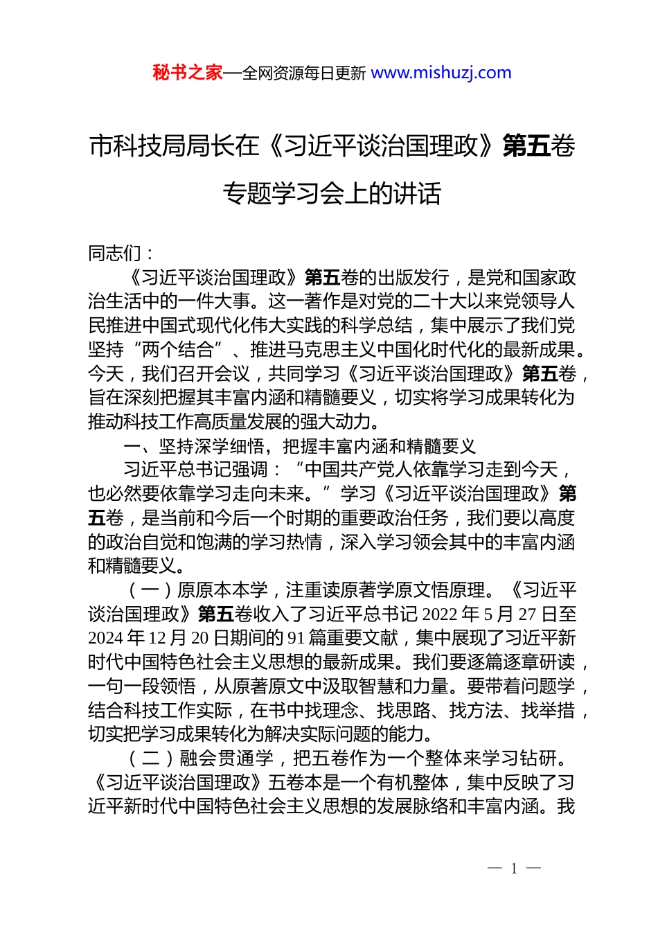 秘书之家—全网资源每日更新 www.mishuzj.com市科技局局长在《习近平谈治国理政》第五卷专题学习会上的讲话同志们:《习近平谈治国理政》第五卷的出版发行,是党和国家政治生活中的一件大事。这一著作是对党的二十大以来党领导人民推进中国式现代化伟大实践的科学总结,集中展示了我们党坚持“两个结合”、推进马克思主义中国化时代化的最新成果。今天,我们召开会议,共同学习《习近平谈治国理政》第五卷,旨在深刻把握其丰富内涵和精髓要义,切实将学习成果转化为推动科技工作高质量发展的强大动力。一、坚持深学细悟,把握丰富内涵和精髓要义习近平总书记强调:“中国共产党人依靠学习走到今天,也必然要依靠学习走向未来。”学习《习近平谈治国理政》第五卷,是当前和今后一个时期的重要政治任务,我们要以高度的政治自觉和饱满的学习热情,深入学习领会其中的丰富内涵和精髓要义。(一)原原本本学,注重读原著学原文悟原理。《习近平谈治国理政》第五卷收入了习近平总书记 2022 年 5 月 27 日至2024 年 12 月 20 日期间的 91 篇重要文献,集中展现了习近平新时代中国特色社会主义思想的最新成果。我们要逐篇逐章研读,一句一段领悟,从原著原文中汲取智慧和力量。要带着问题学,结合科技工作实际,在书中找理念、找思路、找方法、找举措,切实把学习成果转化为解决实际问题的能力。(二)融会贯通学,把五卷作为一个整体来学习钻研。《习近平谈治国理政》五卷本是一个有机整体,集中反映了习近平新时代中国特色社会主义思想的发展脉络和丰富内涵。我— 1 —秘书之家—全网资源每日更新 www.mishuzj.com们要把第五卷和前四卷结合起来,系统学习、全面把握,深刻领会这一思想的连贯性、继承性和创新性。要从整体上理解习近平新时代中国特色社会主义思想的科学体系,把握其核心要义、精神实质、丰富内涵和实践要求,切实做到学深悟透、融会贯通。(三)联系实际学,深刻领会思想的真理力量和实践伟力习近平总书记指出:“理论在一个国家实现的程度取决于理论满足现实需要的程度,理论作用发挥的效度取决于理论见诸实践的深度。”我们要坚持理论联系实际的马克思主义学风,把学习《习近平谈治国理政》第五卷与推动科技工作结合起来,深刻领会这一思想的真理力量和实践伟力。要紧密结合我市科技工作实际,围绕科技创新中心任务,把学习成果转化为推动科技进步、促进经济发展的实际行动,切实做到学用结合、知行合一。(四)精心组织学,认真落实“第一议题”制度。我们要切实加强组织领导,认真落实“第一议题”制度,以理论学习中心组、“三会一课”等为抓手,开展系统学习。领导干部要带头领学促学,发挥示范引领作用,引导全体党员干部在学懂弄通做实上下功夫。要精心组织培训,制定详细的学习计划,确保学习活动有序开展。要通过集中学习、个人自学、交流研讨、专题辅导等多种形式,营造浓厚的学习氛围,推动学习活动不断走深走实。二、转化学习成果,推动高水平科技自立自强习近平总书记强调:“科技是第一生产力、人才是第一资源、创新是第一动力。”我们要切实把学习《习近平谈治国理政》第五卷的成果转化为推动高水平科技自立自强、建设科技强国的实际成效,为实现党的二十大描绘的宏伟蓝图贡献科技力量。(一)强化职责使命担当,高标准完成党中央赋予的各项— 2 —秘书之家—全网资源每日更新 www.mishuzj.com工作任务。作为科技部门,我们要深刻认识到肩负的职责使命,切实增强责任感和使命感。要以习近平新时代中国特色社会主义思想为指导,全面贯彻落实党中央关于科技创新的决策部署,紧紧围绕我市经济社会发展需求,制定切实可行的科技发展规划和政策措施。要加强对科技创新工作的统筹协调和组织推动,确保党中央赋予的各项工作任务落到实处。(二)务求科技创新工作实效,加快推进“十五五”科技创新规划编制。当前,我们要加快推进“十五五”科技创新规划编制工作,立足我市科技发展现状和优势,明确未来五年科技创新的目标任务、重点领域和关键举措。要加强调查研究,广泛征求意见,确保规划具有科学性、前瞻性和可操作性。要深化科技体制改...
