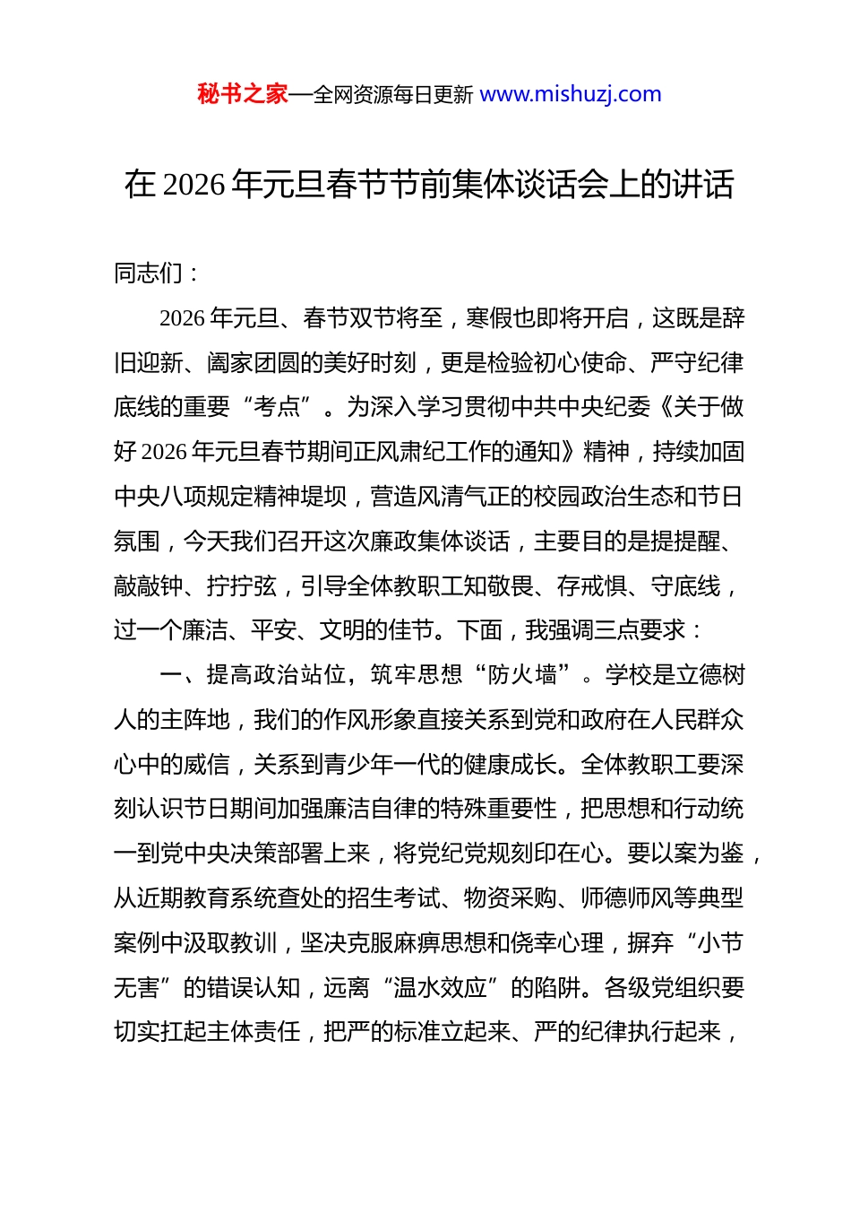 秘书之家—全网资源每日更新 www.mishuzj.com在 2026 年元旦春节节前集体谈话会上的讲话 同志们:2026 年元旦、春节双节将至,寒假也即将开启,这既是辞旧迎新、阖家团圆的美好时刻,更是检验初心使命、严守纪律底线的重要“考点”。为深入学习贯彻中共中央纪委《关于做好 2026 年元旦春节期间正风肃纪工作的通知》精神,持续加固中央八项规定精神堤坝,营造风清气正的校园政治生态和节日氛围,今天我们召开这次廉政集体谈话,主要目的是提提醒、敲敲钟、拧拧弦,引导全体教职工知敬畏、存戒惧、守底线,过一个廉洁、平安、文明的佳节。下面,我强调三点要求:一、提高政治站位,筑牢思想“防火墙”。学校是立德树人的主阵地,我们的作风形象直接关系到党和政府在人民群众心中的威信,关系到青少年一代的健康成长。全体教职工要深刻认识节日期间加强廉洁自律的特殊重要性,把思想和行动统一到党中央决策部署上来,将党纪党规刻印在心。要以案为鉴,从近期教育系统查处的招生考试、物资采购、师德师风等典型案例中汲取教训,坚决克服麻痹思想和侥幸心理,摒弃“小节无害”的错误认知,远离“温水效应”的陷阱。各级党组织要切实扛起主体责任,把严的标准立起来、严的纪律执行起来,秘书之家—全网资源每日更新 www.mishuzj.com通过警示教育、谈心谈话等方式,抓早抓小、防微杜渐,筑牢拒腐防变的思想堡垒。二、严守纪律底线,不越行为“红线”。节日期间人情往来密集,更要警惕“腐败外衣”的隐蔽变异,全体教职工必须严格遵守廉洁自律各项规定,坚决做到“十个严禁”:一是严禁违规收送高档烟酒茶、电子红包、有价证券、商业预付卡等礼品礼金,杜绝通过快递、代购等隐蔽方式搞利益输送;二是严禁违规接受学生家长、管理服务对象的宴请,或躲进私人会所、“一桌餐”等场所搞违规吃喝;三是严禁以节日慰问、工作总结等名义违规发放津补贴、福利,或巧立名目变相开支;四是严禁公车私用、私车公养,或违规借用管理服务对象车辆;五是严禁违规使用公款旅游、接待走亲访友等非公务活动,或接受管理服务对象安排的旅游、娱乐活动;六是严禁借节日之机搞“小圈子”“拜码头”,在招生录取、职称评审、评优评先等工作中说情打招呼;七是严禁违规大操大办婚丧喜庆事宜或借机敛财;八是严禁参与黄赌毒、封建迷信等违纪违法活动,坚决杜绝酒驾醉驾;九是严禁违反值班值守规定,擅自脱岗漏岗或酒后上岗;十是严禁加重基层负担,杜绝文山会海、重复报表、过度留痕等形式主义问题。三、强化责任担当,弘扬清廉“新风尚”。各级领导干部秘书之家—全网资源每日更新 www.mishuzj.com要发挥“头雁效应”,既严于律己、以身作则,带头遵守廉洁规定,又要认真履行“一岗双责”,严管所辖、严负其责,加强对分管领域教职工和家庭成员的教育监督。要自觉净化社交圈、生活圈、朋友圈,带头弘扬艰苦奋斗、勤俭节约的优良传统,推进移风易俗,抵制人情攀比等不良习俗。学校纪委将持续强化监督执纪问责,采取明察暗访、专项检查等方式,紧盯重点领域和关键岗位,对顶风违纪行为露头就打、快查严处,对典型案例一律通报曝光,既追究当事人责任,也追究主体责任和监督责任。同时,畅通监督举报渠道,鼓励师生员工参与监督,共同筑牢校园廉洁防线。同志们,廉洁是教育的生命线,节日是廉洁的“试金石”希望大家以此次谈话为警醒,把纪律规矩挺在前面,心有所畏、言有所戒、行有所止,用实际行动维护教育系统的良好形象。最后,预祝大家度过一个欢乐祥和、廉洁平安的元旦春节!谢谢大家!