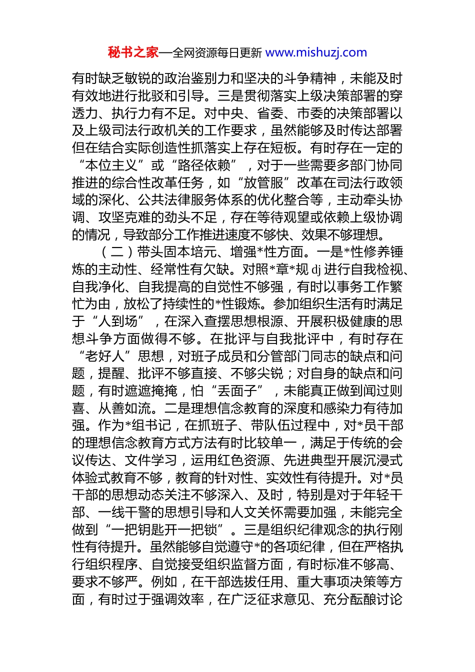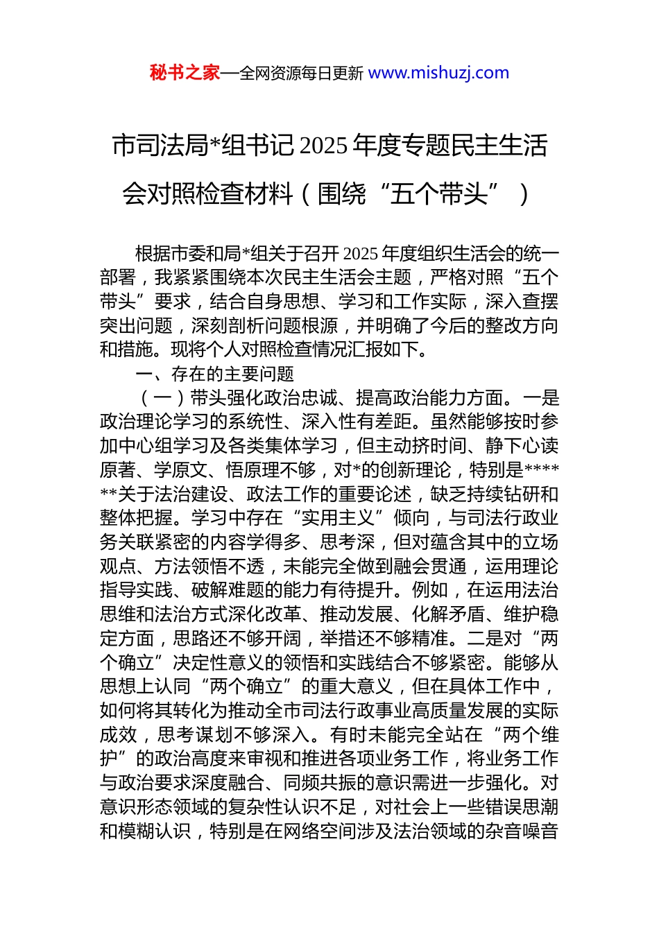 秘书之家—全网资源每日更新 www.mishuzj.com市司法局*组书记 2025 年度专题民主生活会对照检查材料(围绕“五个带头”)根据市委和局*组关于召开 2025 年度组织生活会的统一部署,我紧紧围绕本次民主生活会主题,严格对照“五个带头”要求,结合自身思想、学习和工作实际,深入查摆突出问题,深刻剖析问题根源,并明确了今后的整改方向和措施。现将个人对照检查情况汇报如下。一、存在的主要问题(一)带头强化政治忠诚、提高政治能力方面。一是政治理论学习的系统性、深入性有差距。虽然能够按时参加中心组学习及各类集体学习,但主动挤时间、静下心读原著、学原文、悟原理不够,对*的创新理论,特别是******关于法治建设、政法工作的重要论述,缺乏持续钻研和整体把握。学习中存在“实用主义”倾向,与司法行政业务关联紧密的内容学得多、思考深,但对蕴含其中的立场观点、方法领悟不透,未能完全做到融会贯通,运用理论指导实践、破解难题的能力有待提升。例如,在运用法治思维和法治方式深化改革、推动发展、化解矛盾、维护稳定方面,思路还不够开阔,举措还不够精准。二是对“两个确立”决定性意义的领悟和实践结合不够紧密。能够从思想上认同“两个确立”的重大意义,但在具体工作中,如何将其转化为推动全市司法行政事业高质量发展的实际成效,思考谋划不够深入。有时未能完全站在“两个维护”的政治高度来审视和推进各项业务工作,将业务工作与政治要求深度融合、同频共振的意识需进一步强化。对意识形态领域的复杂性认识不足,对社会上一些错误思潮和模糊认识,特别是在网络空间涉及法治领域的杂音噪音秘书之家—全网资源每日更新 www.mishuzj.com有时缺乏敏锐的政治鉴别力和坚决的斗争精神,未能及时有效地进行批驳和引导。三是贯彻落实上级决策部署的穿透力、执行力有不足。对中央、省委、市委的决策部署以及上级司法行政机关的工作要求,虽然能够及时传达部署但在结合实际创造性抓落实上存在短板。有时存在一定的“本位主义”或“路径依赖”,对于一些需要多部门协同推进的综合性改革任务,如“放管服”改革在司法行政领域的深化、公共法律服务体系的优化整合等,主动牵头协调、攻坚克难的劲头不足,存在等待观望或依赖上级协调的情况,导致部分工作推进速度不够快、效果不够理想。(二)带头固本培元、增强*性方面。一是*性修养锤炼的主动性、经常性有欠缺。对照*章*规 dj 进行自我检视、自我净化、自我提高的自觉性不够强,有时以事务工作繁忙为由,放松了持续性的*性锻炼。参加组织生活有时满足于“人到场”,在深入查摆思想根源、开展积极健康的思想斗争方面做得不够。在批评与自我批评中,有时存在“老好人”思想,对班子成员和分管部门同志的缺点和问题,提醒、批评不够直接、不够尖锐;对自身的缺点和问题,有时遮遮掩掩,怕“丢面子”,未能真正做到闻过则喜、从善如流。二是理想信念教育的深度和感染力有待加强。作为*组书记,在抓班子、带队伍过程中,对*员干部的理想信念教育方式方法有时比较单一,满足于传统的会议传达、文件学习,运用红色资源、先进典型开展沉浸式体验式教育不够,教育的针对性、实效性有待提升。对*员干部的思想动态关注不够深入、及时,特别是对于年轻干部、一线干警的思想引导和人文关怀需要加强,未能完全做到“一把钥匙开一把锁”。三是组织纪律观念的执行刚性有待提升。虽然能够自觉遵守*的各项纪律,但在严格执行组织程序、自觉接受组织监督方面,有时标准不够高、要求不够严。例如,在干部选拔任用、重大事项决策等方面,有时过于强调效率,在广泛征求意见、充分酝酿讨论秘书之家—全网资源每日更新 www.mishuzj.com等环节做得不够扎实细致。对分管领域和下属单位*员干部的日常教育管理监督,有时存在“重业务、轻 dj”、“重使用、轻管理”的现象,对苗头性、倾向性问题抓早抓小、防微杜渐的力度不够。(三)带头敬畏人民、敬畏组织、敬畏法纪方面。一是践行以人民为中心的发展思想不够深入。虽然部署推进了公共法律服务体系建设、法律援助、人民调解、普法宣传等民生工作,但深入了解群众在法治领域的“急难愁盼”...