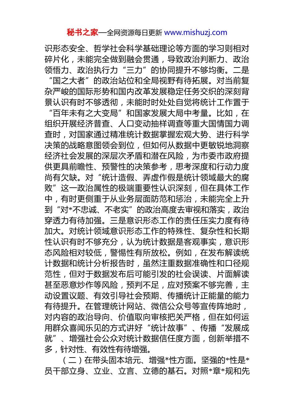 秘书之家—全网资源每日更新 www.mishuzj.com市统计局*组书记 2025 年度民主生活会对照检查发言材料根据市委关于开好 2025 年度*员领导干部民主生活会的统一部署和要求,会前,本人聚焦会议主题,深入学习领会*的二十大及二十届历次全会精神、******系列重要讲话和****批示精神,深刻认识进一步全面深化改革的战略意义和实践要求。同时,与班子成员、分管处室负责同志、*员干部代表及普通群众进行了深入谈心谈话,广泛征求了各方面意见建议。在此基础上,紧密联系个人思想动态、工作表现和市统计局工作实际,严格对照本次民主生活会要求的五个方面内容,深入查摆自身存在的问题,深刻剖析问题产生的思想根源,并明确今后的努力方向和整改措施。现将对照检查情况报告如下。一、存在的主要问题(一)在带头强化政治忠诚、提高政治能力方面。政治忠诚是首要的政治品质,政治能力是履职尽责的“压舱石”。对标最高要求,自身仍存在差距和不足。一是理论武装的深度和转化效果有待提升。对**************思想的整体性、关联性把握还不够系统深入,特别是运用贯穿其中的立场观点方法指导统计工作实践、破解统计改革发展难题的能力有待加强。例如,在深刻理解把握“中国式现代化”科学内涵并将其融入统计监测评价体系时,系统性思考和创新性转化不足,有时满足于完成上级布置的统计核算任务,对如何构建更科学、更精准反映我市高质量发展进程的统计指标体系主动研究不够、思考不深。在学习上存在一定的“实用主义”倾向,与统计工作直接相关的政策理论学得多、思考深,而对涉及国家长远发展、意秘书之家—全网资源每日更新 www.mishuzj.com识形态安全、哲学社会科学基础理论等方面的学习则相对碎片化,未能完全做到融会贯通,导致政治判断力、政治领悟力、政治执行力“三力”的协同提升不够均衡。二是“国之大者”的政治站位和全局视野有待拓展。对当前复杂严峻的国际形势和国内改革发展稳定任务交织的深刻背景认识有时不够透彻,未能时时处处自觉将统计工作置于“百年未有之大变局”和国家发展大局中考量。比如,在组织开展经济普查、人口变动抽样调查等重大国情国力调查时,对国家通过精准统计数据掌握宏观大势、进行科学决策的战略意图领会到位,但如何从数据中更敏锐地洞察经济社会发展的深层次矛盾和潜在风险,为市委市政府提供更具前瞻性、预警性的决策参考,思考深度和行动力度尚有欠缺。对“统计造假、弄虚作假是统计领域最大的腐败”这一政治属性的极端重要性认识深刻,但在具体工作中,有时更侧重于从业务层面防范和惩治,未能完全上升到“对*不忠诚、不老实”的政治高度去审视和落实,政治穿透力有待加强。三是意识形态工作的责任压实力度有待加大。对统计领域意识形态工作的特殊性、复杂性和长期性认识有时不够充分,认为统计数据是客观事实,意识形态风险相对较低,警惕性有所放松。例如,在发布解读统计数据和统计分析报告时,虽然注重数据准确性和口径规范性,但对于数据发布后可能引发的社会误读、片面解读甚至恶意炒作等风险,预判不足,应对预案不够完善,主动设置议题、有效引导社会预期、传播统计正能量的能力有待提升。在管理统计网站、微信公众号等宣传阵地时,对内容的政治导向、价值取向审核把关严格,但在如何运用群众喜闻乐见的方式讲好“统计故事”、传播“发展成就”、增强社会公众对统计数据信任度方面,创新举措不多,针对性、有效性有待增强。(二)在带头固本培元、增强*性方面。坚强的*性是*员干部立身、立业、立言、立德的基石。对照*章*规和先秘书之家—全网资源每日更新 www.mishuzj.com进典型,自身*性锤炼仍需持续用力。一是理想信念的“总开关”拧得不够紧。随着工作环境和岗位的变化,有时不自觉地放松了对主观世界的持续改造,用*的创新理论滋养初心、引领使命的自觉性有所减弱。在面对统计工作任务繁重、压力增大时,有时会产生“歇歇脚”“松口气”的念头,攻坚克难的锐气和斗志有所减退。例如,在推进统计方法制度改革、探索新经济新业态统计等难点工作时,有时存在畏难情绪,习惯于等待上级明确指示或兄弟单位先行经验,敢闯敢试、先...