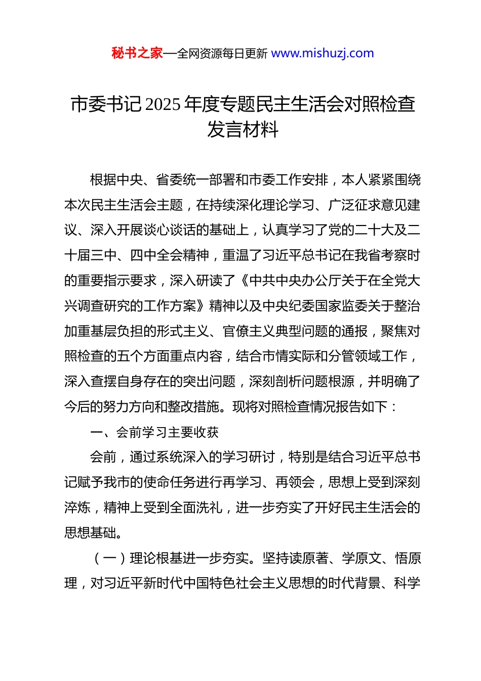 秘书之家—全网资源每日更新 www.mishuzj.com市委书记 2025 年度专题民主生活会对照检查发言材料 根据中央、省委统一部署和市委工作安排,本人紧紧围绕本次民主生活会主题,在持续深化理论学习、广泛征求意见建议、深入开展谈心谈话的基础上,认真学习了党的二十大及二十届三中、四中全会精神,重温了习近平总书记在我省考察时的重要指示要求,深入研读了《中共中央办公厅关于在全党大兴调查研究的工作方案》精神以及中央纪委国家监委关于整治加重基层负担的形式主义、官僚主义典型问题的通报,聚焦对照检查的五个方面重点内容,结合市情实际和分管领域工作,深入查摆自身存在的突出问题,深刻剖析问题根源,并明确了今后的努力方向和整改措施。现将对照检查情况报告如下:一、会前学习主要收获会前,通过系统深入的学习研讨,特别是结合习近平总书记赋予我市的使命任务进行再学习、再领会,思想上受到深刻淬炼,精神上受到全面洗礼,进一步夯实了开好民主生活会的思想基础。(一)理论根基进一步夯实。坚持读原著、学原文、悟原理,对习近平新时代中国特色社会主义思想的时代背景、科学秘书之家—全网资源每日更新 www.mishuzj.com体系、精神实质和实践要求有了更系统的把握,特别是对其中的世界观、方法论和贯穿其中的立场观点方法的理解更加透彻。更加深刻地认识到,作为国家中心城市、区域核心引擎,必须自觉运用党的创新理论观察分析形势、研究谋划发展、破解改革难题,才能确保各项工作始终沿着正确方向前进。(二)政治忠诚进一步筑牢。通过学习,更加深刻领悟“两个确立”的决定性意义,对“两个维护”的政治要求把握更加精准。进一步增强了政治敏锐性和政治鉴别力,深刻认识到工作必须时刻对标对表党中央决策部署和省委工作要求,自觉从“国之大者”的高度思考和推进各项工作,确保习近平总书记重要讲话、重要指示批示精神在不折不扣落地生根、结出丰硕成果。(三)使命担当进一步激发。对照习近平总书记提出的“在推进中国式现代化建设中走在前列”的殷切期望,以及关于全面深化改革、扩大高水平对外开放、推动高质量发展等一系列重要要求,深感责任重大、使命光荣。进一步增强了作为市委班子成员,推动在区域建设、国家科技自立自强、制造业立市、绿美生态建设、实现老城市新活力、“四个出新出彩”等重大战略中展现新担当新作为的紧迫感和责任感。(四)人民立场进一步站稳。深化了对“江山就是人民,秘书之家—全网资源每日更新 www.mishuzj.com人民就是江山”的理解,更加清醒地认识到,的发展必须以人民为中心,聚焦超大城市治理、共同富裕、民生“七有”目标等,用心用情用力解决好群众急难愁盼问题。通过反思“为了谁、依靠谁、我是谁”的根本问题,增强了践行党的群众路线、走好新时代网上网下群众路线的思想自觉和行动自觉。(五)纪律标尺进一步拉紧。结合学习党章党规党纪和典型案例通报,特别是形式主义、官僚主义新表现、新变种的剖析,进一步绷紧了纪律规矩这根弦。深刻认识到,作为“关键少数”,必须在廉洁自律上标准更高、要求更严,带头落实全面从严治党政治责任,持续巩固发展风清气正的良好政治生态。二、对照检查发现的主要问题(一)在带头强化政治忠诚、提高政治能力方面。一是政治领悟的穿透力有待加强。对习近平新时代中国特色社会主义思想的领会,有时还停留在概念层面、政策层面,对其蕴含的马克思主义立场观点方法,特别是关于中国式现代化、新质生产力、统筹发展和安全等重大理论与发展实践的结合点、着力点,思考不够深、研究不够透。在将“两个确立”的决定性意义转化为做到“两个维护”的自觉行动上,有时存在“温差”,比如,在推动分管领域工作时,虽然能够坚决执行中央和省委市委决策,但对其背后的战略考量、政治深意思考不深,创造秘书之家—全网资源每日更新 www.mishuzj.com性转化为具体实践的思路和举措不够丰富。二是政治判断的前瞻性有待提升。面对复杂严峻的国际环境和改革发展稳定任务,有时对分管领域可能存在的政治风险、意识形态风险、经济风险等,预判研判不够敏锐、不够精准。例如,在防范化解金融、房地产等领...