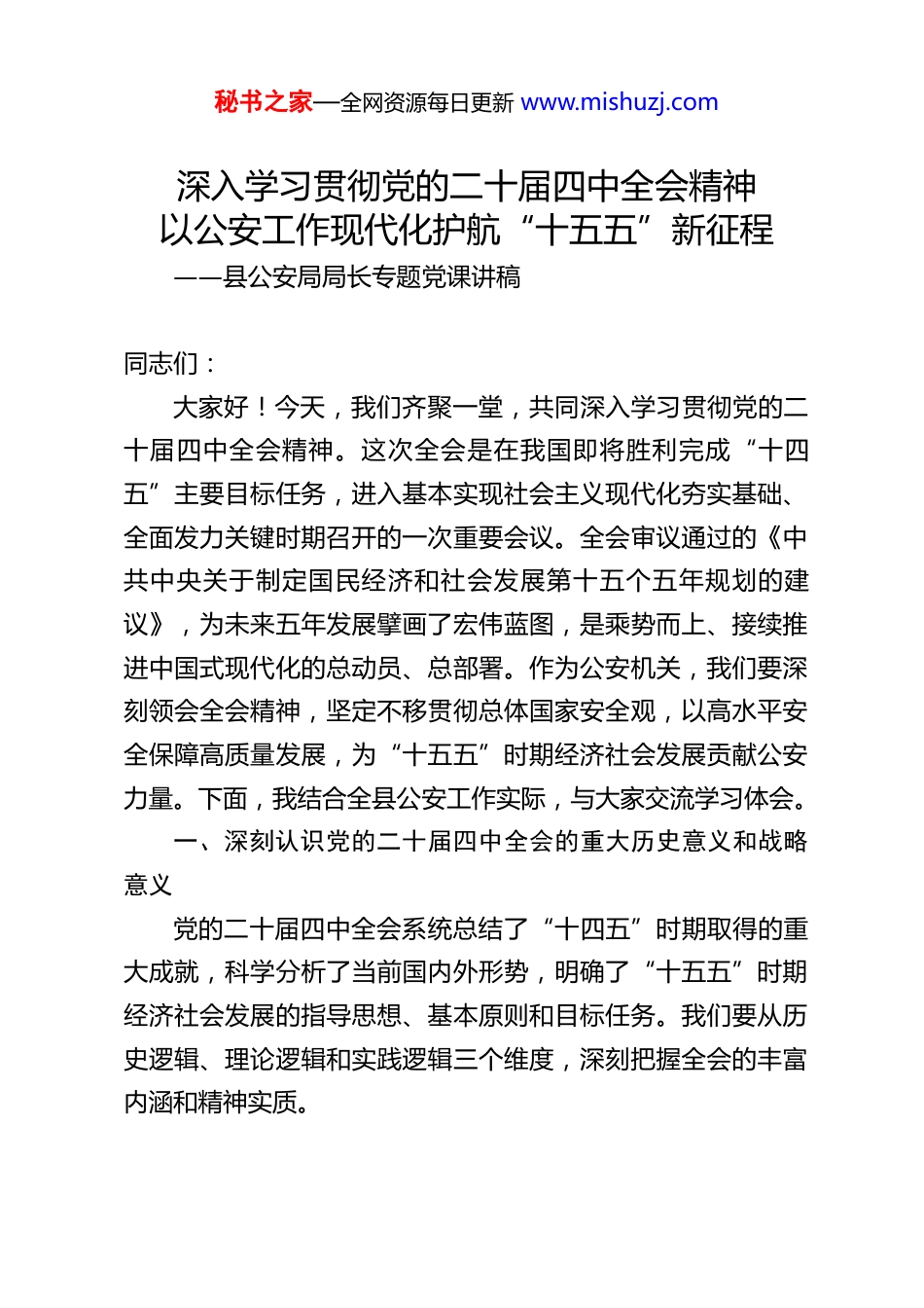 秘书之家—全网资源每日更新 www.mishuzj.com深入学习贯彻党的二十届四中全会精神以公安工作现代化护航“十五五”新征程——县公安局局长专题党课讲稿 同志们:大家好!今天,我们齐聚一堂,共同深入学习贯彻党的二十届四中全会精神。这次全会是在我国即将胜利完成“十四五”主要目标任务,进入基本实现社会主义现代化夯实基础、全面发力关键时期召开的一次重要会议。全会审议通过的《中共中央关于制定国民经济和社会发展第十五个五年规划的建议》,为未来五年发展擘画了宏伟蓝图,是乘势而上、接续推进中国式现代化的总动员、总部署。作为公安机关,我们要深刻领会全会精神,坚定不移贯彻总体国家安全观,以高水平安全保障高质量发展,为“十五五”时期经济社会发展贡献公安力量。下面,我结合全县公安工作实际,与大家交流学习体会。一、深刻认识党的二十届四中全会的重大历史意义和战略意义 党的二十届四中全会系统总结了“十四五”时期取得的重大成就,科学分析了当前国内外形势,明确了“十五五”时期经济社会发展的指导思想、基本原则和目标任务。我们要从历史逻辑、理论逻辑和实践逻辑三个维度,深刻把握全会的丰富内涵和精神实质。秘书之家—全网资源每日更新 www.mishuzj.com(一)全会召开的时代背景与历史方位。“十四五”时期是开启全面建设社会主义现代化国家新征程的第一个五年,发展历程极不寻常、极不平凡。以习近平同志为核心的党中央团结带领全党全国各族人民,迎难而上、砥砺前行,经受住世纪疫情严重冲击,有效应对一系列重大风险挑战,推动党和国家事业取得新的重大成就。我国经济实力、科技实力、综合国力和民生福祉显著提升,为“十五五”发展奠定了坚实基础。全会指出,“十五五”时期是基本实现社会主义现代化夯实基础、全面发力的关键时期,在基本实现现代化进程中具有承前启后的重要地位。当前,我国发展处于战略机遇和风险挑战并存、不确定难预料因素增多的时期。准确把握这一历史方位,是我们贯彻落实全会精神的前提。(二)全会的重大政治意义和战略意义。全会最重要的成果是审议通过了《中共中央关于制定国民经济和社会发展第十五个五年规划的建议》。《建议》共有 15 个部分、61 条,分为三大板块,第一板块是总论,第二板块分领域部署“十五五”时期的战略任务和重大举措,第三板块主要部署坚持和加强党中央集中统一领导等任务。《建议》是我们党历史上又一个重要纲领性文献,指导方针科学精准,发展目标清晰明确,任务举措求真务实,是接续推进中国式现代化的又一次总动员、总部署。科学制定和接续实施五年规划,是我们党治国理政一条重要经验,也是中国特色社会主义一个重要政治优势。习近秘书之家—全网资源每日更新 www.mishuzj.com平总书记亲自担任文件起草组组长,亲自擘画、全程指导、把脉定向,对《建议》形成发挥了决定性作用。这充分体现了以习近平同志为核心的党中央高瞻远瞩的战略眼光和强烈的历史担当。(三)全会提出的核心要求与战略任务。全会强调,“十五五”时期经济社会发展必须坚持党的全面领导。《建议》明确了“十五五”时期经济社会发展的指导方针和主要目标,强调要全面贯彻习近平新时代中国特色社会主义思想,围绕全面建成社会主义现代化强国、实现第二个百年奋斗目标,以中国式现代化全面推进中华民族伟大复兴。“十五五”时期经济社会发展主要目标包括七个方面:高质量发展取得显著成效;科技自立自强水平大幅提高;进一步全面深化改革取得新突破;社会文明程度明显提升;人民生活品质不断提高;美丽中国建设取得新的重大进展;国家安全屏障更加巩固。这些目标既催人奋进又切实可行,为我们指明了前进方向。全会还从建设现代化产业体系、扩大高水平对外开放、加快高水平科技自立自强、加快建设健康中国、促进人口高质量发展等方面作出了系统部署。特别是全会强调要“推进国家安全体系和能力现代化,建设更高水平平安中国”,这对我们公安机关提出了直接而明确的要求。二、准确把握“十五五”时期公安工作面临的形势与任务 作为党和人民手中的“刀把子”,公安机关必须准确把握秘书之家—全网资源每日更新 w...