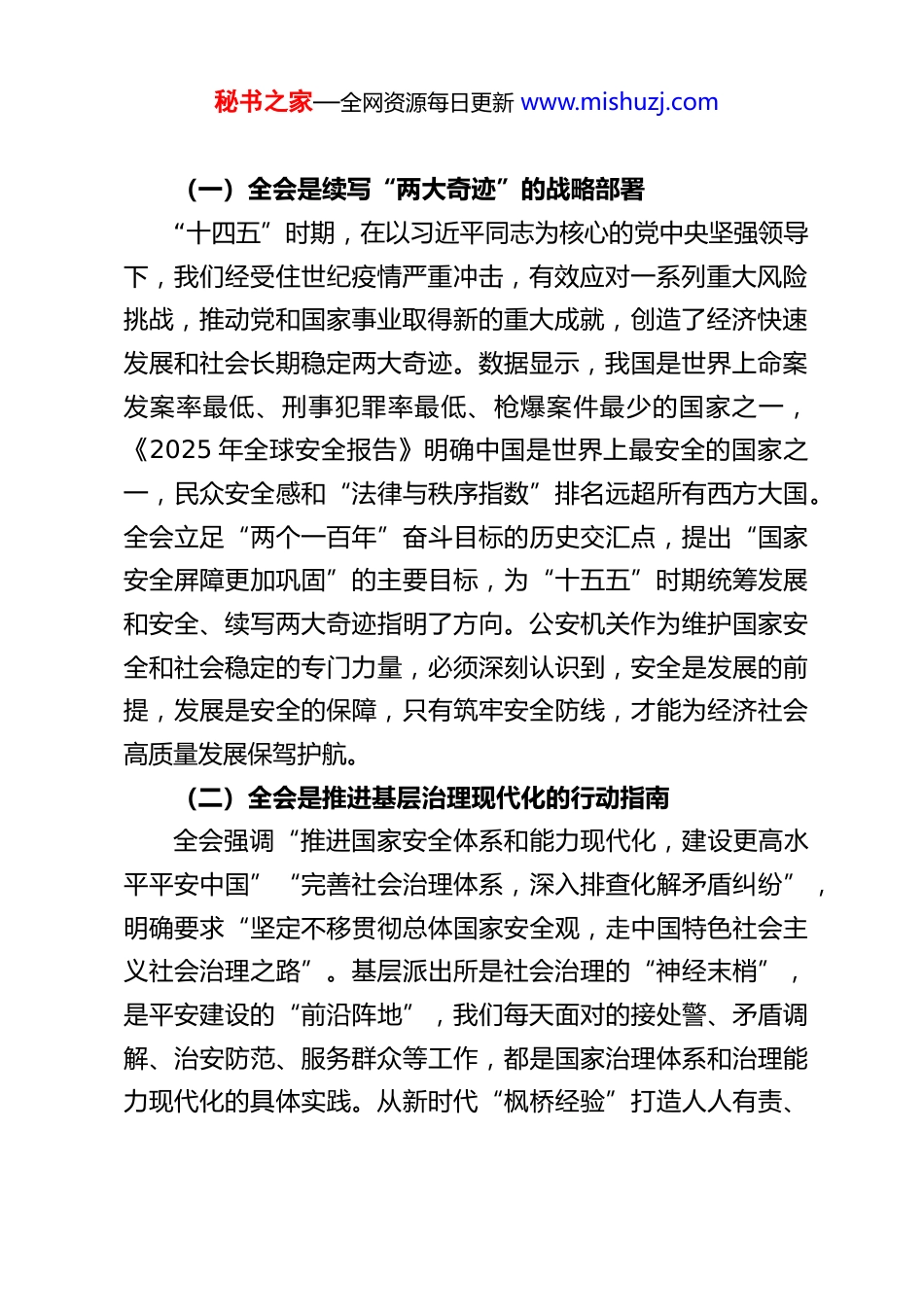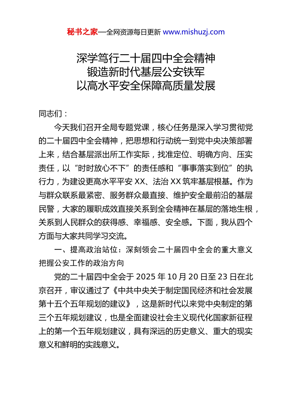 秘书之家—全网资源每日更新 www.mishuzj.com深学笃行二十届四中全会精神锻造新时代基层公安铁军以高水平安全保障高质量发展同志们:今天我们召开全局专题党课,核心任务是深入学习贯彻党的二十届四中全会精神,把思想和行动统一到党中央决策部署上来,结合基层派出所工作实际,找准定位、明确方向、压实责任,以“时时放心不下”的责任感和“事事落实到位”的执行力,为建设更高水平平安 XX、法治 XX 筑牢基层根基。作为与群众联系最紧密、服务群众最直接、维护安全最前沿的基层民警,大家的履职成效直接关系到全会精神在基层的落地生根,关系到人民群众的获得感、幸福感、安全感。下面,我从四个方面与大家共同学习交流。一、提高政治站位:深刻领会二十届四中全会的重大意义把握公安工作的政治方向党的二十届四中全会于 2025 年 10 月 20 日至 23 日在北京召开,审议通过了《中共中央关于制定国民经济和社会发展第十五个五年规划的建议》,这是新时代以来党中央制定的第三个五年规划建议,也是全面建设社会主义现代化国家新征程上的第一个五年规划建议,具有深远的历史意义、重大的现实意义和鲜明的实践意义。秘书之家—全网资源每日更新 www.mishuzj.com(一)全会是续写“两大奇迹”的战略部署“十四五”时期,在以习近平同志为核心的党中央坚强领导下,我们经受住世纪疫情严重冲击,有效应对一系列重大风险挑战,推动党和国家事业取得新的重大成就,创造了经济快速发展和社会长期稳定两大奇迹。数据显示,我国是世界上命案发案率最低、刑事犯罪率最低、枪爆案件最少的国家之一,《2025 年全球安全报告》明确中国是世界上最安全的国家之一,民众安全感和“法律与秩序指数”排名远超所有西方大国。全会立足“两个一百年”奋斗目标的历史交汇点,提出“国家安全屏障更加巩固”的主要目标,为“十五五”时期统筹发展和安全、续写两大奇迹指明了方向。公安机关作为维护国家安全和社会稳定的专门力量,必须深刻认识到,安全是发展的前提,发展是安全的保障,只有筑牢安全防线,才能为经济社会高质量发展保驾护航。(二)全会是推进基层治理现代化的行动指南全会强调“推进国家安全体系和能力现代化,建设更高水平平安中国”“完善社会治理体系,深入排查化解矛盾纠纷”,明确要求“坚定不移贯彻总体国家安全观,走中国特色社会主义社会治理之路”。基层派出所是社会治理的“神经末梢”,是平安建设的“前沿阵地”,我们每天面对的接处警、矛盾调解、治安防范、服务群众等工作,都是国家治理体系和治理能力现代化的具体实践。从新时代“枫桥经验”打造人人有责、秘书之家—全网资源每日更新 www.mishuzj.com人人尽责的社会治理共同体,到“新时代六尺巷工作法”实现源头治理、多元共治,基层治理的成效直接关系到国家治理的成色。全会对基层治理的部署要求,为我们破解基层警务难题、提升治理效能提供了根本遵循。(三)全会是锻造新时代公安铁军的根本遵循全会明确“坚持党的全面领导”是“十五五”时期经济社会发展必须遵循的重要原则,强调“坚持人民至上”“坚持统筹发展和安全”。公安机关是党和人民手中的“刀把子”,政治性是第一属性,讲政治是第一要求。当前,世界变乱交织,我国发展面临的不确定难预料风险因素明显增多,统筹发展和安全任务更加艰巨。作为基层民警,我们必须深刻领会全会精神,把党的绝对领导贯穿公安工作全过程各方面,以过硬的政治素质、业务能力、纪律作风,应对风险挑战、履行职责使命,为基本实现社会主义现代化提供坚强安全保障。二、把握核心要义:深刻理解全会精神与公安工作的内在联系,明确基层警务的使命任务二十届四中全会围绕“统筹发展和安全”作出一系列战略部署,与公安工作息息相关、紧密相连。我们要从全会精神中找准基层派出所的职能定位,明确“干什么、怎么干”的核心任务,把学习成果转化为维护安全、服务发展、保障民生的实际行动。(一)坚持总体国家安全观,筑牢政治安全“第一道防秘书之家—全网资源每日更新 www.mishuzj.com线”全会提出“健全国家安全体系,加强重点领域国家安全能力建设”,将国家安全提升...