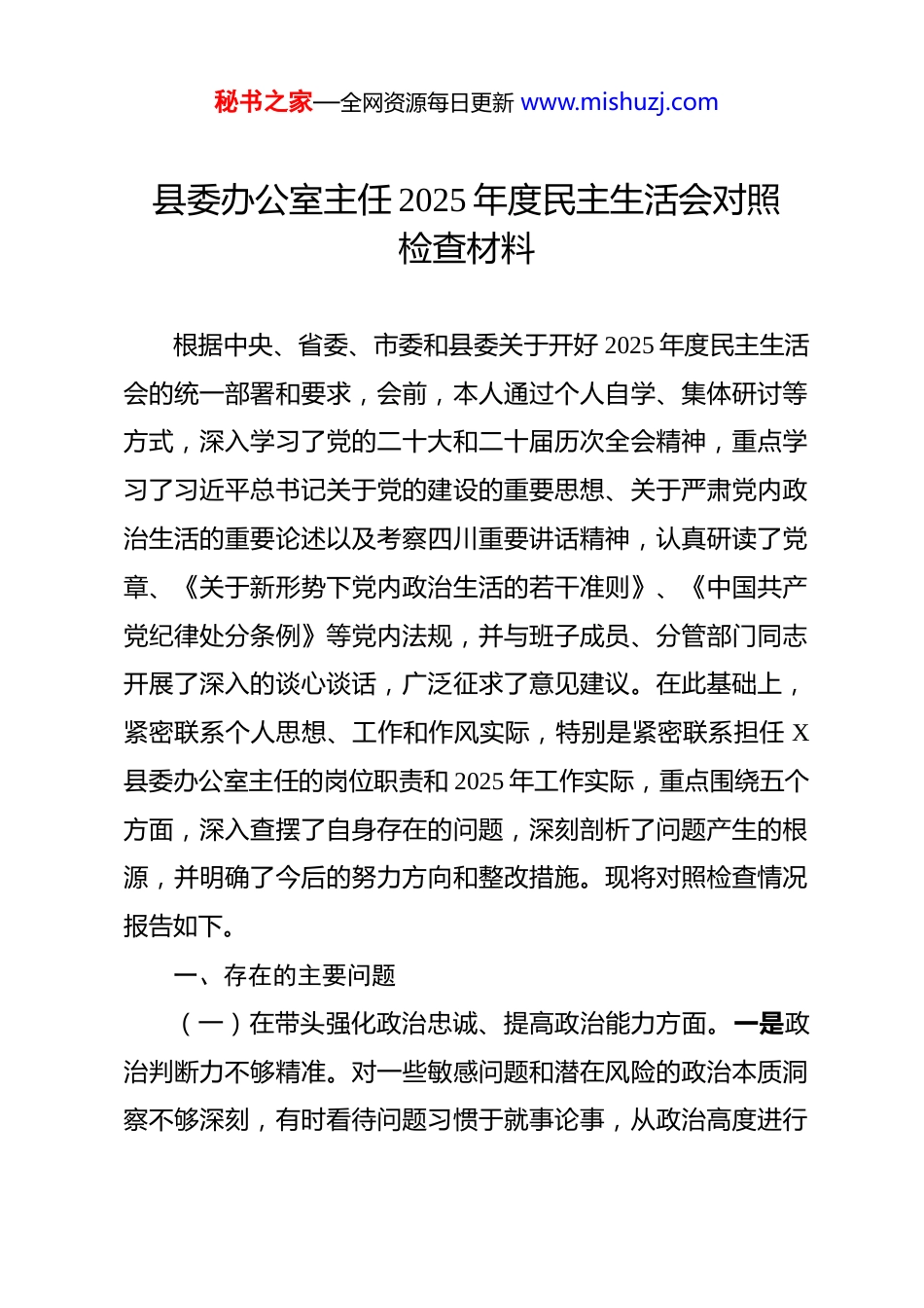秘书之家—全网资源每日更新 www.mishuzj.com县委办公室主任 2025 年度民主生活会对照检查材料 根据中央、省委、市委和县委关于开好 2025 年度民主生活会的统一部署和要求,会前,本人通过个人自学、集体研讨等方式,深入学习了党的二十大和二十届历次全会精神,重点学习了习近平总书记关于党的建设的重要思想、关于严肃党内政治生活的重要论述以及考察四川重要讲话精神,认真研读了党章、《关于新形势下党内政治生活的若干准则》、《中国共产党纪律处分条例》等党内法规,并与班子成员、分管部门同志开展了深入的谈心谈话,广泛征求了意见建议。在此基础上,紧密联系个人思想、工作和作风实际,特别是紧密联系担任 X县委办公室主任的岗位职责和 2025 年工作实际,重点围绕五个方面,深入查摆了自身存在的问题,深刻剖析了问题产生的根源,并明确了今后的努力方向和整改措施。现将对照检查情况报告如下。一、存在的主要问题(一)在带头强化政治忠诚、提高政治能力方面。一是政治判断力不够精准。对一些敏感问题和潜在风险的政治本质洞察不够深刻,有时看待问题习惯于就事论事,从政治高度进行秘书之家—全网资源每日更新 www.mishuzj.com分析、研判和把握的能力有待加强。比如,在审核涉及某些敏感领域的文稿或处理相关事务时,有时更多考虑的是业务层面的稳妥,对其可能引发的政治风险思考不够周全、评估不够到位,政治“过滤”作用发挥不充分。二是政治领悟力不够深入。对党的创新理论,特别是习近平新时代中国特色社会主义思想的学习,有时停留在“知道大概”层面,对其核心要义、精神实质和实践要求的理解把握缺乏深度和广度,“知其然”多,“知其所以然”少。像在理解“高质量发展”这个首要任务时,对如何将其与 X 县情,特别是与办公室“三服务”工作深度融合、创造性落实方面,思路还不够开阔,办法还不多,存在“上下一般粗”的现象,未能完全做到“结合”二字文章。三是政治执行力不够坚决。在贯彻落实中央、省委、市委和县委决策部署时,虽然能做到及时传达、安排部署,但有时存在“雷声大、雨点小”的情况,后续的跟踪问效、督促检查抓得不够紧、不够实,导致一些工作效果打了折扣。例如,在推动精文简会方面,虽然制定了相关制度,但 2025 年第三季度时,仍出现了一周内会议安排略显集中、个别文件篇幅偏长的问题,说明在执行层面还存在薄弱环节,一抓到底的韧劲不足。对意识形态领域的一些错误思潮和言论,有时缺乏主动亮剑、坚决斗争的锐气,存在一定的“好人主义”思想。秘书之家—全网资源每日更新 www.mishuzj.com(二)在带头固本培元、增强党性方面。一是理论武装的自觉性系统性有待加强。学习存在“实用主义”倾向,与工作联系紧密的学得多些、深些,对一些基础理论、基本方略的学习则缺乏“挤”和“钻”的精神,全面系统、融会贯通上有差距。参加中心组学习有时带有“完成任务”心态,会前准备不足,会上研讨发言质量不高,未能真正将学习成果转化为坚定的理想信念和高强的党性修养。党内政治生活的“炉火”烧得不够旺,参加组织生活有时存在“例行公事”现象,批评与自我批评辣味不足,担心“伤和气”“丢面子”,主动汇报思想、自觉接受监督不够经常。二是党性锤炼的主动性深刻性有所欠缺。随着职务提升和工作繁忙,有时不自觉地放松了对主观世界的持续改造,艰苦奋斗、自我革命的精神有所懈怠。对照焦裕禄、兰辉等先进典型,深感自己在党性修养的锤炼上标准不高、要求不严。比如,在工作中遇到困难和矛盾时,有时第一反应是寻求现有经验或上级指示,缺乏那种敢于直面问题、勇于突破创新的锐气和担当,这与党性原则要求有差距。三是宗旨意识树得不够牢固。虽然经常强调要践行以人民为中心的发展思想,但在具体工作中,“官本位”思想有时仍有残留,坐在办公室听汇报、看材料多,深入基层、深入群众、面对面倾听群众呼声不够经常。比如,2025 年虽然也按要求下基层进行秘书之家—全网资源每日更新 www.mishuzj.com了调研,但有时“走马观花”式调研多,真正沉下去、静下心,与群众同坐一条板凳,了解“急难愁盼”、解决实际问题的“解剖...