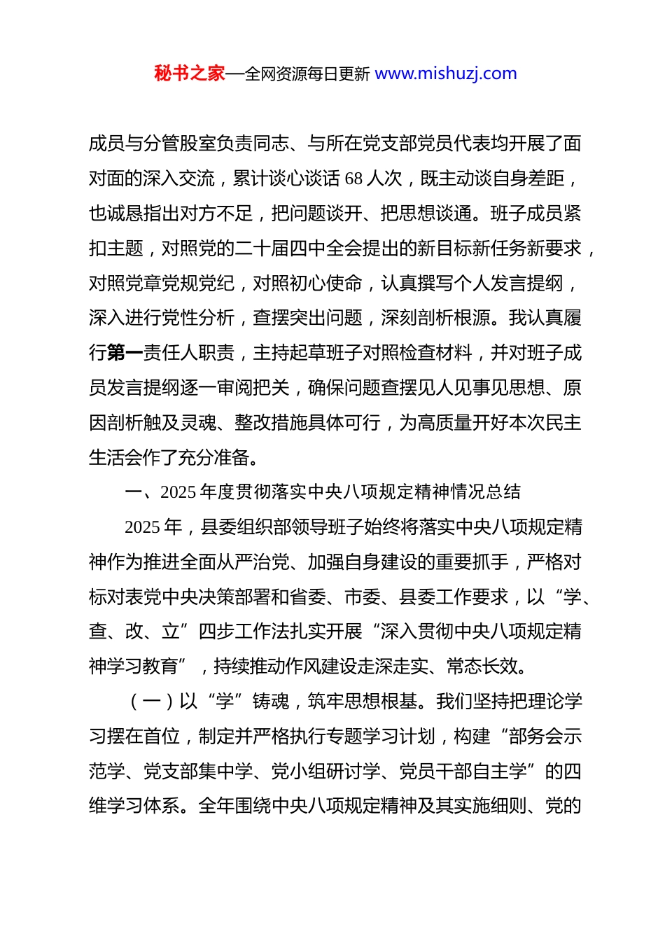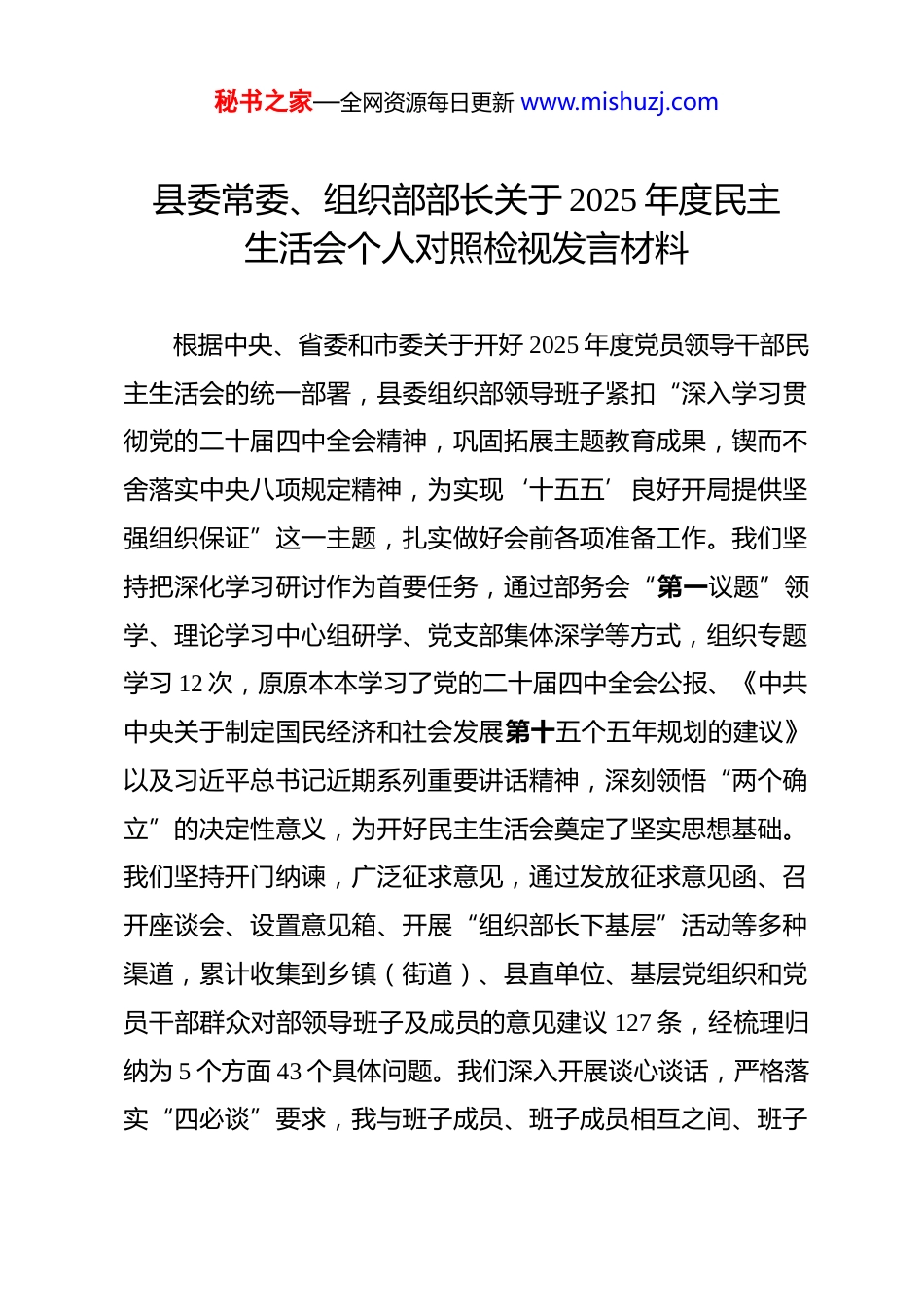 秘书之家—全网资源每日更新 www.mishuzj.com县委常委、组织部部长关于 2025 年度民主生活会个人对照检视发言材料 根据中央、省委和市委关于开好 2025 年度党员领导干部民主生活会的统一部署,县委组织部领导班子紧扣“深入学习贯彻党的二十届四中全会精神,巩固拓展主题教育成果,锲而不舍落实中央八项规定精神,为实现‘十五五’良好开局提供坚强组织保证”这一主题,扎实做好会前各项准备工作。我们坚持把深化学习研讨作为首要任务,通过部务会“第一议题”领学、理论学习中心组研学、党支部集体深学等方式,组织专题学习 12 次,原原本本学习了党的二十届四中全会公报、《中共中央关于制定国民经济和社会发展第十五个五年规划的建议》以及习近平总书记近期系列重要讲话精神,深刻领悟“两个确立”的决定性意义,为开好民主生活会奠定了坚实思想基础。我们坚持开门纳谏,广泛征求意见,通过发放征求意见函、召开座谈会、设置意见箱、开展“组织部长下基层”活动等多种渠道,累计收集到乡镇(街道)、县直单位、基层党组织和党员干部群众对部领导班子及成员的意见建议 127 条,经梳理归纳为 5 个方面 43 个具体问题。我们深入开展谈心谈话,严格落实“四必谈”要求,我与班子成员、班子成员相互之间、班子秘书之家—全网资源每日更新 www.mishuzj.com成员与分管股室负责同志、与所在党支部党员代表均开展了面对面的深入交流,累计谈心谈话 68 人次,既主动谈自身差距,也诚恳指出对方不足,把问题谈开、把思想谈通。班子成员紧扣主题,对照党的二十届四中全会提出的新目标新任务新要求,对照党章党规党纪,对照初心使命,认真撰写个人发言提纲,深入进行党性分析,查摆突出问题,深刻剖析根源。我认真履行第一责任人职责,主持起草班子对照检查材料,并对班子成员发言提纲逐一审阅把关,确保问题查摆见人见事见思想、原因剖析触及灵魂、整改措施具体可行,为高质量开好本次民主生活会作了充分准备。一、2025 年度贯彻落实中央八项规定精神情况总结2025 年,县委组织部领导班子始终将落实中央八项规定精神作为推进全面从严治党、加强自身建设的重要抓手,严格对标对表党中央决策部署和省委、市委、县委工作要求,以“学、查、改、立”四步工作法扎实开展“深入贯彻中央八项规定精神学习教育”,持续推动作风建设走深走实、常态长效。(一)以“学”铸魂,筑牢思想根基。我们坚持把理论学习摆在首位,制定并严格执行专题学习计划,构建“部务会示范学、党支部集中学、党小组研讨学、党员干部自主学”的四维学习体系。全年围绕中央八项规定精神及其实施细则、党的秘书之家—全网资源每日更新 www.mishuzj.com自我革命战略思想、新修订的《中国共产党纪律处分条例》等重点内容,组织专题学习会 8 场、集中研讨交流 4 次,班子成员带头撰写心得体会、带头讲廉政党课。我们将警示教育作为学习教育的关键一环,组织全体干部集中观看《作风建设永远在路上》等警示教育片,赴县廉政教育基地开展现场教学 2 次,深刻剖析中纪委、省纪委通报的以及本县查处的共 7 起违反中央八项规定精神典型案例,特别是涉及组织人事领域的案例,用“身边事”教育“身边人”,引导干部知敬畏、存戒惧、守底线,自觉抵制歪风邪气。(二)以“查”明纪,精准扫描画像。我们发扬刀刃向内的自我革命精神,坚持问题导向,对照《违反中央八项规定及其实施细则精神问题清单》和《隐形变异的“四风”问题新表现清单》,采取“班子查、领导点、群众提、自己找”相结合的方式,全面深入查摆问题。领导班子重点围绕贯彻落实党中央决策部署、服务高质量发展、为基层减负、规范选人用人、廉洁自律等方面,查摆出 5 个倾向性问题。班子成员及全体干部结合岗位职责,对照检查在公务接待、会议活动、文件简报、调查研究、干部考察、个人交往等方面是否存在形式主义、官僚主义新表现,累计自查自纠问题 65 个。例如,在整治形式主义为基层减负工作中,我们牵头对全县各部门发文、开会、督秘书之家—全网资源每日更新 www.mishuzj.com查检查考核情况进行了 2 次专项摸排,发现并反馈了 4...