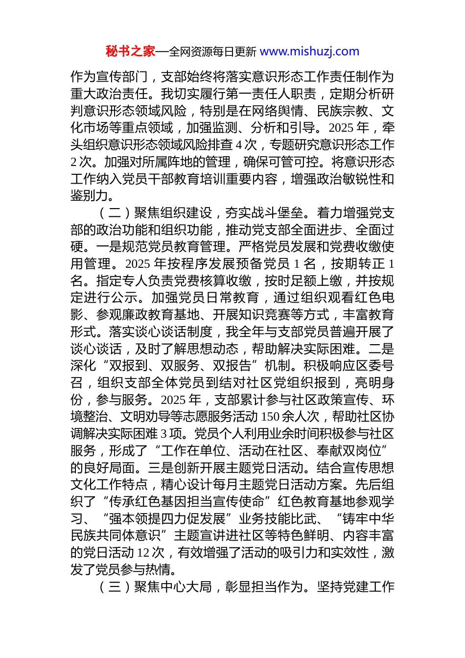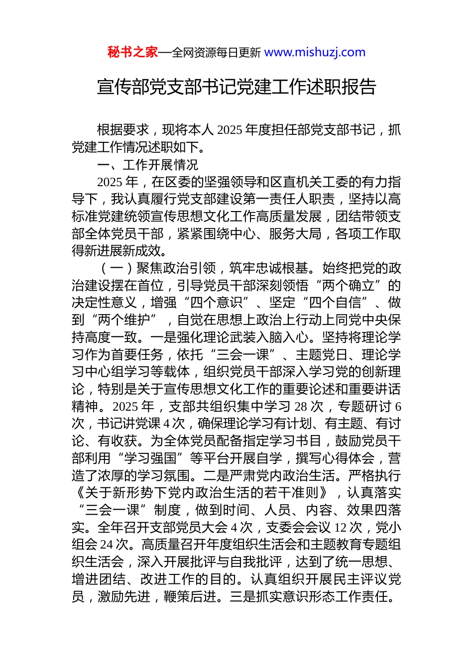秘书之家—全网资源每日更新 www.mishuzj.com宣传部党支部书记党建工作述职报告根据要求,现将本人 2025 年度担任部党支部书记,抓党建工作情况述职如下。一、工作开展情况2025 年,在区委的坚强领导和区直机关工委的有力指导下,我认真履行党支部建设第一责任人职责,坚持以高标准党建统领宣传思想文化工作高质量发展,团结带领支部全体党员干部,紧紧围绕中心、服务大局,各项工作取得新进展新成效。(一)聚焦政治引领,筑牢忠诚根基。始终把党的政治建设摆在首位,引导党员干部深刻领悟“两个确立”的决定性意义,增强“四个意识”、坚定“四个自信”、做到“两个维护”,自觉在思想上政治上行动上同党中央保持高度一致。一是强化理论武装入脑入心。坚持将理论学习作为首要任务,依托“三会一课”、主题党日、理论学习中心组学习等载体,组织党员干部深入学习党的创新理论,特别是关于宣传思想文化工作的重要论述和重要讲话精神。2025 年,支部共组织集中学习 28 次,专题研讨 6次,书记讲党课 4 次,确保理论学习有计划、有主题、有讨论、有收获。为全体党员配备指定学习书目,鼓励党员干部利用“学习强国”等平台开展自学,撰写心得体会,营造了浓厚的学习氛围。二是严肃党内政治生活。严格执行《关于新形势下党内政治生活的若干准则》,认真落实“三会一课”制度,做到时间、人员、内容、效果四落实。全年召开支部党员大会 4 次,支委会会议 12 次,党小组会 24 次。高质量召开年度组织生活会和主题教育专题组织生活会,深入开展批评与自我批评,达到了统一思想、增进团结、改进工作的目的。认真组织开展民主评议党员,激励先进,鞭策后进。三是抓实意识形态工作责任。秘书之家—全网资源每日更新 www.mishuzj.com作为宣传部门,支部始终将落实意识形态工作责任制作为重大政治责任。我切实履行第一责任人职责,定期分析研判意识形态领域风险,特别是在网络舆情、民族宗教、文化市场等重点领域,加强监测、分析和引导。2025 年,牵头组织意识形态领域风险排查 4 次,专题研究意识形态工作2 次。加强对所属阵地的管理,确保可管可控。将意识形态工作纳入党员干部教育培训重要内容,增强政治敏锐性和鉴别力。(二)聚焦组织建设,夯实战斗堡垒。着力增强党支部的政治功能和组织功能,推动党支部全面进步、全面过硬。一是规范党员教育管理。严格党员发展和党费收缴使用管理。2025 年按程序发展预备党员 1 名,按期转正 1名。指定专人负责党费核算收缴,按时足额上缴,并按规定进行公示。加强党员日常教育,通过组织观看红色电影、参观廉政教育基地、开展知识竞赛等方式,丰富教育形式。落实谈心谈话制度,我全年与支部党员普遍开展了谈心谈话,及时了解思想动态,帮助解决实际困难。二是深化“双报到、双服务、双报告”机制。积极响应区委号召,组织支部全体党员到结对社区党组织报到,亮明身份,参与服务。2025 年,支部累计参与社区政策宣传、环境整治、文明劝导等志愿服务活动 150 余人次,帮助社区协调解决实际困难 3 项。党员个人利用业余时间积极参与社区服务,形成了“工作在单位、活动在社区、奉献双岗位”的良好局面。三是创新开展主题党日活动。结合宣传思想文化工作特点,精心设计每月主题党日活动方案。先后组织了“传承红色基因担当宣传使命”红色教育基地参观学习、“强本领提四力促发展”业务技能比武、“铸牢中华民族共同体意识”主题宣讲进社区等特色鲜明、内容丰富的党日活动 12 次,有效增强了活动的吸引力和实效性,激发了党员参与热情。(三)聚焦中心大局,彰显担当作为。坚持党建工作秘书之家—全网资源每日更新 www.mishuzj.com与业务工作深度融合,以高质量党建推动宣传思想文化工作守正创新。一是服务高质量发展有力有效。紧紧围绕区委、区政府中心工作,如优化营商环境、重大项目建设、乡村振兴等,组织党员干部深入一线采访调研,策划推出系列有深度、有温度的新闻报道和专题栏目。2025 年,在市级以上主流媒体刊发反映我区经济社会发展成效的稿件数量同比增长 15%。积极运用新媒体平台,讲好*故事,传播*声音...