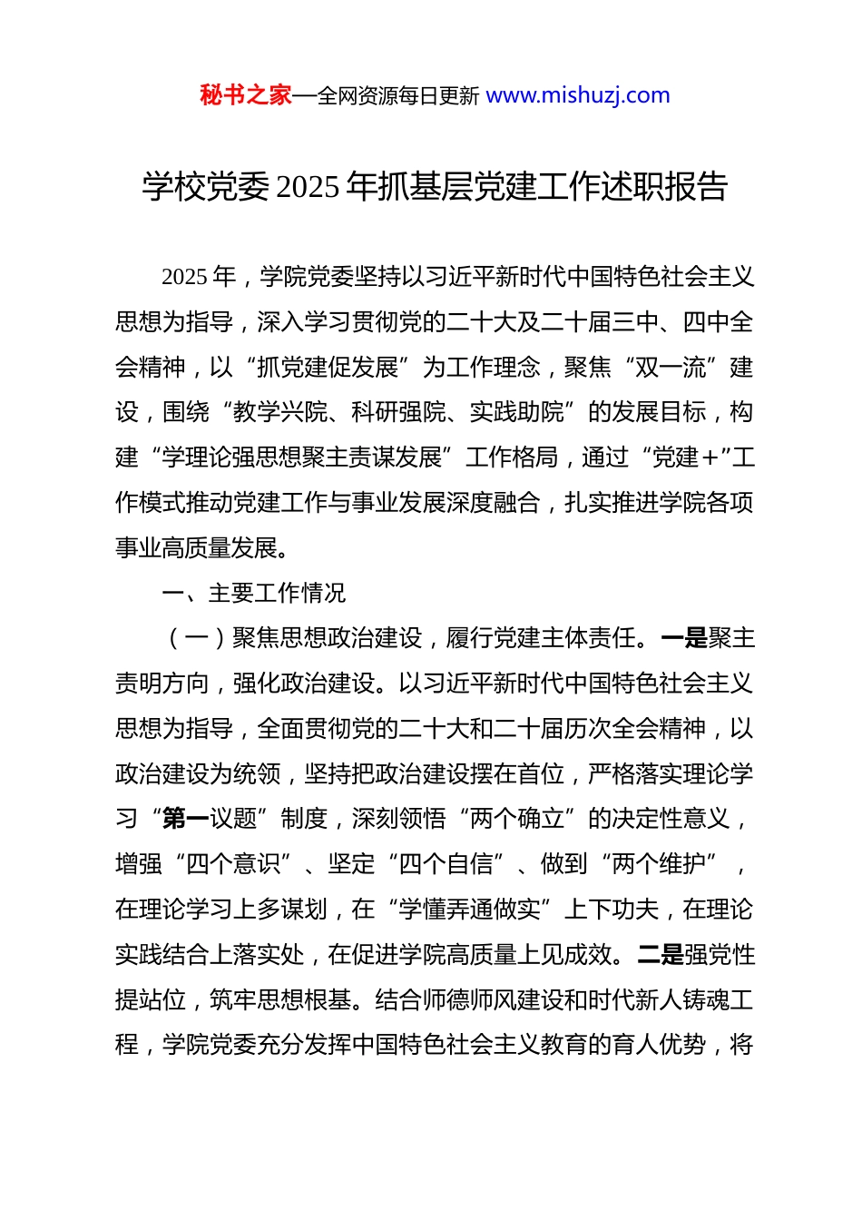秘书之家—全网资源每日更新 www.mishuzj.com学校党委 2025 年抓基层党建工作述职报告 2025 年,学院党委坚持以习近平新时代中国特色社会主义思想为指导,深入学习贯彻党的二十大及二十届三中、四中全会精神,以“抓党建促发展”为工作理念,聚焦“双一流”建设,围绕“教学兴院、科研强院、实践助院”的发展目标,构建“学理论强思想聚主责谋发展”工作格局,通过“党建+”工作模式推动党建工作与事业发展深度融合,扎实推进学院各项事业高质量发展。一、主要工作情况(一)聚焦思想政治建设,履行党建主体责任。一是聚主责明方向,强化政治建设。以习近平新时代中国特色社会主义思想为指导,全面贯彻党的二十大和二十届历次全会精神,以政治建设为统领,坚持把政治建设摆在首位,严格落实理论学习“第一议题”制度,深刻领悟“两个确立”的决定性意义,增强“四个意识”、坚定“四个自信”、做到“两个维护”,在理论学习上多谋划,在“学懂弄通做实”上下功夫,在理论实践结合上落实处,在促进学院高质量上见成效。二是强党性提站位,筑牢思想根基。结合师德师风建设和时代新人铸魂工程,学院党委充分发挥中国特色社会主义教育的育人优势,将秘书之家—全网资源每日更新 www.mishuzj.com思想政治工作根植于学科体系、教学体系、教材体系、管理体系、网络体系建设中,依托党校、团校、青年大学习、形势与政策课、启航工程等载体,通过党建引领、社会实践、网络增能等路径,积极开展专题辅导、专家指导、专项引导、专业教导等一系列活动,构建新时代“三全育人”新格局。三是建堡垒强功能,夯实组织根基。学院党委坚持以提升组织力为重点,严格落实“三会一课”、民主评议党员等制度,创新开展“主题党日+”活动,通过规范组织生活、严格党员教育管理、强化政治引领,持续巩固党支部标准化建设成果。实施党支部书记能力提升计划,依托“双创”项目和“双带头人”培育工程,通过专题培训、经验交流、述职评议等方式,着力打造政治强、业务精、作风好的支部带头人队伍,重点做好高层次人才和青年骨干教师党员发展工作,切实增强基层党组织的凝聚力和战斗力。(二)落实党风廉政建设,推进全面从严治党。一是健全监督机制,筑牢意识形态安全防线。严格落实意识形态工作责任制,强化风险防控,确保校园政治安全和思想稳定。加强思想动态研判,在重要时间节点开展师生思想状况调研,及时发现并妥善处理苗头性、倾向性问题。严把课堂教学政治关,严格执行教材审核、教学督导制度,坚决防范错误思潮渗透。深秘书之家—全网资源每日更新 www.mishuzj.com化师德师风建设,创新廉政教育形式,引导教师严守政治纪律、学术规范和职业操守,营造风清气正的政治环境。二是深化作风建设,推进正风肃纪常态化长效化。建立健全政治把关机制,将政治把关贯穿于教学科研、人才引进、学术活动等日常工作之中,通过党委会、党政联席会、班子碰头会以及专题会议分析研判意识形态领域风险点,完善意识形态工作责任制。紧盯“四风”问题新表现,在节假日等重要节点开展专项检查,严查违规收送礼品礼金、公款吃喝等行为,坚决防止反弹回潮。加强廉洁文化建设,开展家风家教主题活动,引导党员干部廉洁修身、廉洁齐家。完善廉政风险防控机制,聚焦招生考试、科研经费、职称评聘等重点领域,强化制度约束和监督执纪,推动形成不敢腐、不能腐、不想腐的有效机制,为学院事业发展保驾护航。(三)深化“一岗双责”,构建融合发展新格局。一是“党建+教学”筑牢立德树人廉洁根基。学院坚持把党风廉政建设融入教育教学全过程,以“时代新人铸魂工程”综合改革为抓手,构建风清气正的政治环境。优化学院二级机构设置,全面推行“支部书记+系主任”双带头人制度,确保教学科研与廉政建设同部署、同落实。健全教学监督机制,严格执行教师教学考核、教材选用审查等制度,充分发挥学院教学督导组秘书之家—全网资源每日更新 www.mishuzj.com作用,确保课堂教学守牢政治底线、法律底线和道德底线。二是“党建+科研”构建规范有序的科研生态。学院将全面从严治党要求贯穿科研工作各环节,着力营造求真务实的学术...