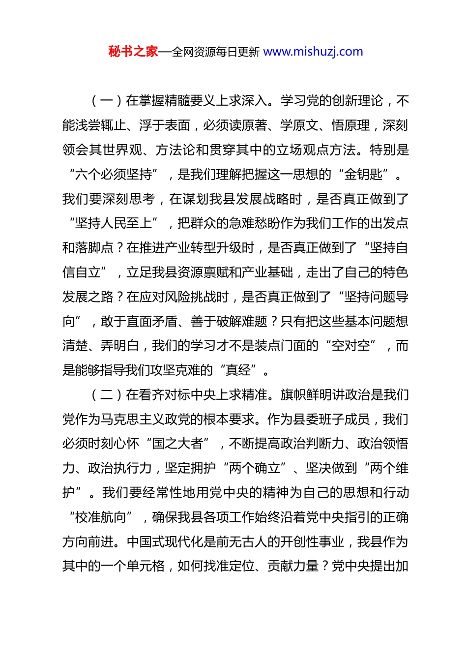秘书之家—全网资源每日更新 www.mishuzj.com在 2025 年度民主生活会前集体学习研讨会上的发言 同志们:在年度民主生活会即将召开之际,我们组织这次集体学习研讨,首要目的就是通过思想的再“充电”、精神的再“补钙”,为高质量开好民主生活会打下坚实的思想和理论根基。会前,我同大家一样,再次深入学习了习近平总书记关于党的建设的重要思想、关于党的自我革命的重要思想,特别是总书记在二十届中央政治局第二十一次集体学习时的重要讲话精神,重温了《习近平谈治国理政》相关篇目,愈发感到思想之旗的领航力量,愈发感到肩上责任的千钧之重。下面,围绕本次研讨主题,结合近期的学习思考和工作实际,我谈几点认识,与同志们交流。一、以深学细悟筑牢思想根基,在“学懂”上持续用力思想是行动的先导,理论是实践的指南。习近平新时代中国特色社会主义思想,是当代中国马克思主义、二十一世纪马克思主义,是我们认识世界、改造世界的强大思想武器。面对复杂严峻的外部环境和艰巨繁重的改革发展稳定任务,我们必须坚持不懈用党的创新理论武装头脑、指导实践、推动工作。秘书之家—全网资源每日更新 www.mishuzj.com(一)在掌握精髓要义上求深入。学习党的创新理论,不能浅尝辄止、浮于表面,必须读原著、学原文、悟原理,深刻领会其世界观、方法论和贯穿其中的立场观点方法。特别是“六个必须坚持”,是我们理解把握这一思想的“金钥匙”。我们要深刻思考,在谋划我县发展战略时,是否真正做到了“坚持人民至上”,把群众的急难愁盼作为我们工作的出发点和落脚点?在推进产业转型升级时,是否真正做到了“坚持自信自立”,立足我县资源禀赋和产业基础,走出了自己的特色发展之路?在应对风险挑战时,是否真正做到了“坚持问题导向”,敢于直面矛盾、善于破解难题?只有把这些基本问题想清楚、弄明白,我们的学习才不是装点门面的“空对空”,而是能够指导我们攻坚克难的“真经”。(二)在看齐对标中央上求精准。旗帜鲜明讲政治是我们党作为马克思主义政党的根本要求。作为县委班子成员,我们必须时刻心怀“国之大者”,不断提高政治判断力、政治领悟力、政治执行力,坚定拥护“两个确立”、坚决做到“两个维护”。我们要经常性地用党中央的精神为自己的思想和行动“校准航向”,确保我县各项工作始终沿着党中央指引的正确方向前进。中国式现代化是前无古人的开创性事业,我县作为其中的一个单元格,如何找准定位、贡献力量?党中央提出加秘书之家—全网资源每日更新 www.mishuzj.com快发展新质生产力,我们县的比较优势在哪里、突破口在何方?这些都是我们需要通过深入学习,结合县情实际,进行精准回答的时代课题。(三)在厚植为民情怀上求真情。党的理论,根植于人民服务于人民。我们学习的最终目的,是为了更好地为人民服务。要始终牢记“江山就是人民,人民就是江山”,把学习过程变成密切联系群众、深入了解民情、真心服务民生的过程。我们要带着对人民群众的深厚感情去学,想一想群众在教育、医疗、养老、住房等方面还有哪些不满意的地方,我们工作的改进空间在哪里。去年,我们通过“民生实事票决制”办成了一批好事,但群众的需求是动态变化的。理论学习要让我们更加清醒地认识到,“老百姓的幸福生活就是最大的人权”,我们肩上的担子有多重,责任有多大。二、以正视问题的自觉审视过往,在“弄通”上深挖根源“知其然,更要知其所以然”。“弄通”就是要联系实际、带着问题学,在检视剖析中深化理解。过去一年,在全县上下的共同努力下,我们顶住了经济下行压力,办成了一些大事要事,取得了一些可喜的成绩。全县地区生产总值同比增长*%,固定资产投资完成*亿元,引进*万元以上产业项目*个,城乡居民人均可支配收入分别增长*%和*%。这些成绩值得肯定,但秘书之家—全网资源每日更新 www.mishuzj.com我们绝不能躺在功劳簿上沾沾自喜。对照党中央的要求、对照高质量发展的标尺、对照人民群众的期盼,我们必须清醒地看到自身存在的差距和不足。(一)在发展质量和效益上存在差距。虽然经济总量在增长,但发展的质量和效益仍有待提高。一是产业结构“偏传统、...