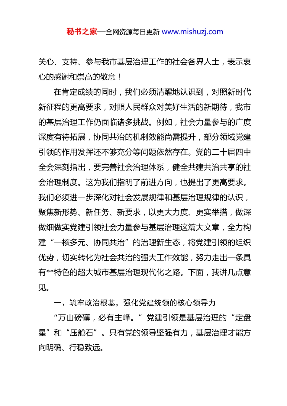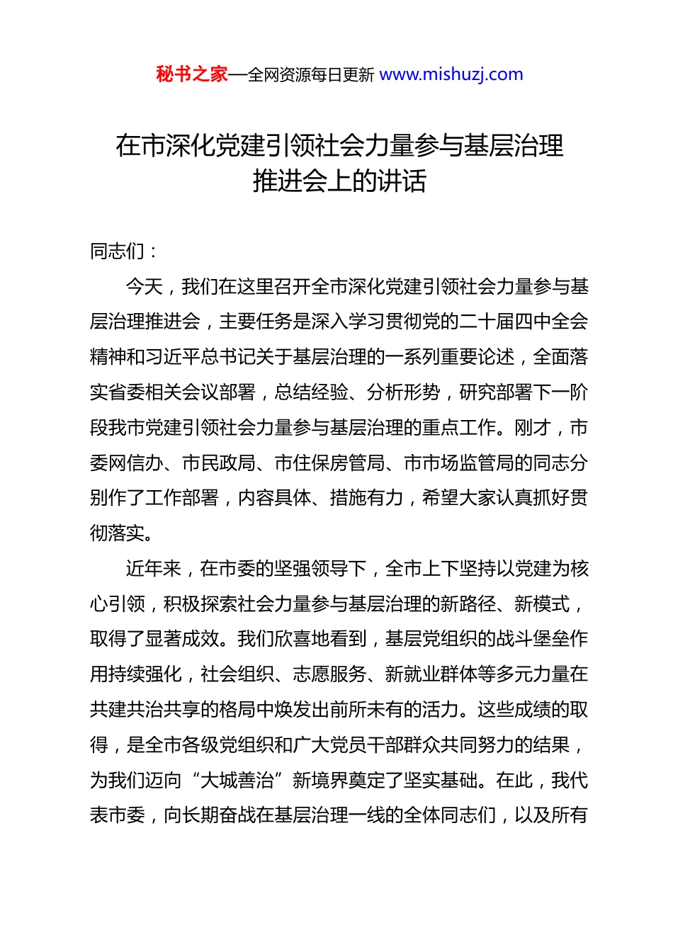 秘书之家—全网资源每日更新 www.mishuzj.com在市深化党建引领社会力量参与基层治理推进会上的讲话 同志们:今天,我们在这里召开全市深化党建引领社会力量参与基层治理推进会,主要任务是深入学习贯彻党的二十届四中全会精神和习近平总书记关于基层治理的一系列重要论述,全面落实省委相关会议部署,总结经验、分析形势,研究部署下一阶段我市党建引领社会力量参与基层治理的重点工作。刚才,市委网信办、市民政局、市住保房管局、市市场监管局的同志分别作了工作部署,内容具体、措施有力,希望大家认真抓好贯彻落实。近年来,在市委的坚强领导下,全市上下坚持以党建为核心引领,积极探索社会力量参与基层治理的新路径、新模式,取得了显著成效。我们欣喜地看到,基层党组织的战斗堡垒作用持续强化,社会组织、志愿服务、新就业群体等多元力量在共建共治共享的格局中焕发出前所未有的活力。这些成绩的取得,是全市各级党组织和广大党员干部群众共同努力的结果,为我们迈向“大城善治”新境界奠定了坚实基础。在此,我代表市委,向长期奋战在基层治理一线的全体同志们,以及所有秘书之家—全网资源每日更新 www.mishuzj.com关心、支持、参与我市基层治理工作的社会各界人士,表示衷心的感谢和崇高的敬意!在肯定成绩的同时,我们必须清醒地认识到,对照新时代新征程的更高要求,对照人民群众对美好生活的新期待,我市的基层治理工作仍面临诸多挑战。例如,社会力量参与的广度深度有待拓展,协同共治的机制效能尚需提升,部分领域党建引领的作用发挥还不够充分等问题依然存在。党的二十届四中全会深刻指出,要完善社会治理体系,健全共建共治共享的社会治理制度。这为我们指明了前进方向,也提出了更高要求。我们必须进一步深化对社会发展规律和基层治理规律的认识,聚焦新形势、新任务、新要求,以更大力度、更实举措,做深做细做实党建引领社会力量参与基层治理这篇大文章,全力构建“一核多元、协同共治”的治理新生态,将党建引领的组织优势,切实转化为社会共治的强大工作效能,努力走出一条具有**特色的超大城市基层治理现代化之路。下面,我讲几点意见。一、筑牢政治根基,强化党建统领的核心领导力“万山磅礴,必有主峰。”党建引领是基层治理的“定盘星”和“压舱石”。只有党的领导坚强有力,基层治理才能方向明确、行稳致远。秘书之家—全网资源每日更新 www.mishuzj.com第一,必须持续深化“两个覆盖”攻坚。社会组织、新就业群体等是社会力量的重要组成部分,也是党建工作的重点和难点领域。要持续巩固拓展“两个覆盖”集中攻坚行动的成果,确保党的组织和党的工作在新兴领域无盲区、无死角。要坚持“应建尽建”原则,对符合条件的社会组织、企业、楼宇、商圈等,通过单独组建、联合组建、挂靠组建等多种方式,灵活设置党组织,力争到明年底,全市性行业协会商会党的组织覆盖率保持在 92%以上,社会组织党组织覆盖率力争达到 90%的既定目标。对于暂不具备建立党组织条件的,要通过选派党建指导员、建立群团组织、开展共建活动等方式,将党的工作有效覆盖,把党的政治主张和组织意图传递到每一个“神经末梢”,确保社会力量始终在党的领导下有序发展、规范运行。第二,必须全面建强基层战斗堡垒。村、社区党组织是党在基层的执政根基,是引领一切工作的核心。要把选优配强村(社区)“两委”班子作为重中之重,严格标准、拓宽来源,真正把那些政治素质好、治理能力强、群众威望高的优秀人才选拔到带头人岗位上来。要持续深化“头雁”工程,加强对村(社区)党组织书记的系统培训和实践锻炼,提升他们驾驭复杂局面、统筹多元力量、服务人民群众的综合能力。要创新联建共建机制,大力推广“社区大党委”“村社共同体”等模式,秘书之家—全网资源每日更新 www.mishuzj.com吸纳辖区内的机关、企事业单位、社会组织党组织负责人担任兼职委员,推动组织共建、资源共享、活动共联、事务共商,打破行政壁垒和条块分割,形成区域化党建的强大合力。第三,必须彰显政治功能和组织功能。基层党组织的根本任务是把方向、管大局、保落实。要坚持把政治建设摆在首位,教育引...