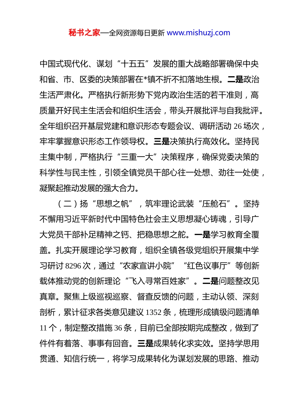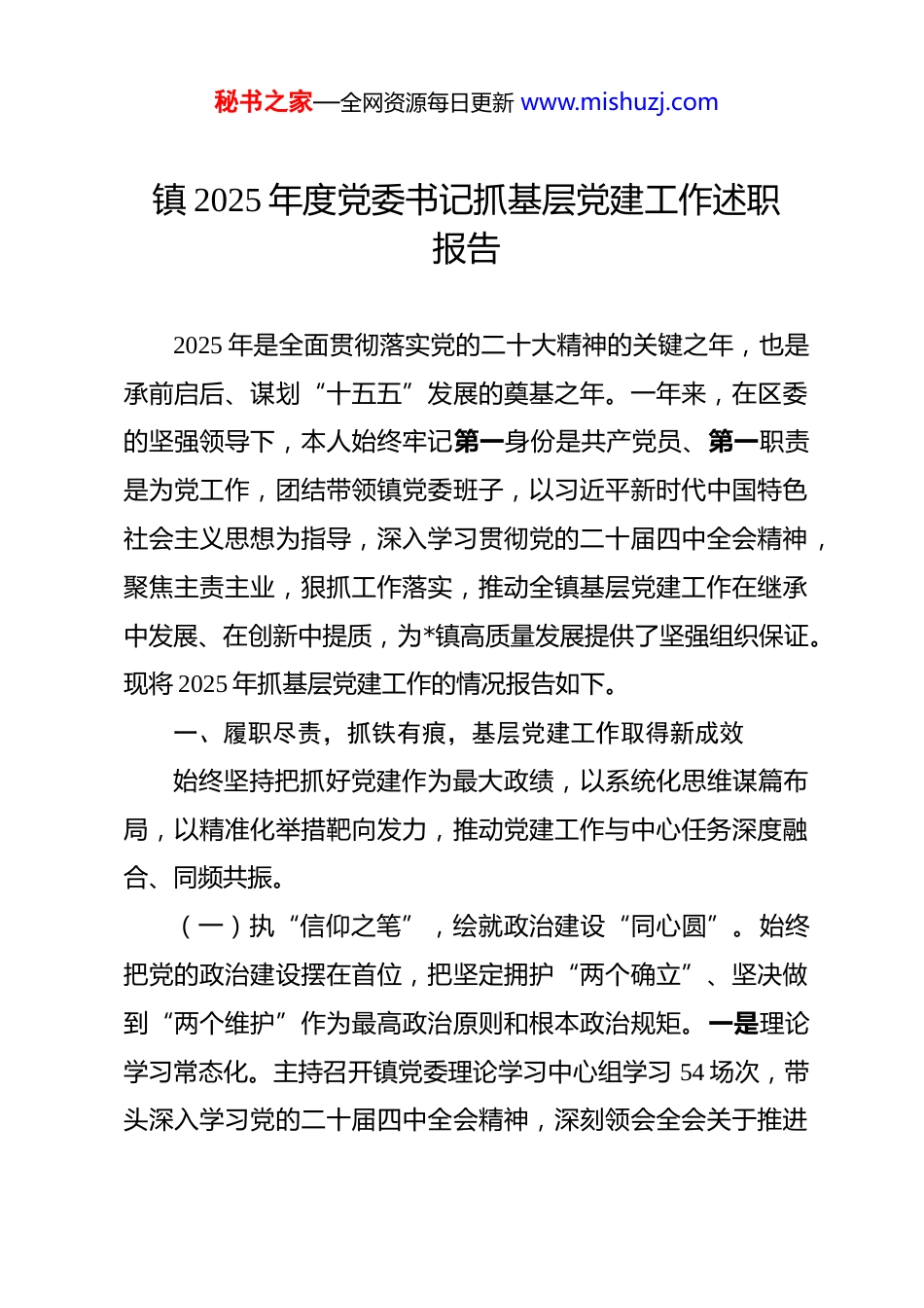 秘书之家—全网资源每日更新 www.mishuzj.com镇 2025 年度党委书记抓基层党建工作述职报告 2025 年是全面贯彻落实党的二十大精神的关键之年,也是承前启后、谋划“十五五”发展的奠基之年。一年来,在区委的坚强领导下,本人始终牢记第一身份是共产党员、第一职责是为党工作,团结带领镇党委班子,以习近平新时代中国特色社会主义思想为指导,深入学习贯彻党的二十届四中全会精神,聚焦主责主业,狠抓工作落实,推动全镇基层党建工作在继承中发展、在创新中提质,为*镇高质量发展提供了坚强组织保证。现将 2025 年抓基层党建工作的情况报告如下。一、履职尽责,抓铁有痕,基层党建工作取得新成效始终坚持把抓好党建作为最大政绩,以系统化思维谋篇布局,以精准化举措靶向发力,推动党建工作与中心任务深度融合、同频共振。(一)执“信仰之笔”,绘就政治建设“同心圆”。始终把党的政治建设摆在首位,把坚定拥护“两个确立”、坚决做到“两个维护”作为最高政治原则和根本政治规矩。一是理论学习常态化。主持召开镇党委理论学习中心组学习 54 场次,带头深入学习党的二十届四中全会精神,深刻领会全会关于推进秘书之家—全网资源每日更新 www.mishuzj.com中国式现代化、谋划“十五五”发展的重大战略部署确保中央和省、市、区委的决策部署在*镇不折不扣落地生根。二是政治生活严肃化。严格执行新形势下党内政治生活的若干准则,高质量开好民主生活会和组织生活会,带头开展批评与自我批评。全年组织召开基层党建和意识形态专题会议、调研活动 26 场次,牢牢掌握意识形态工作领导权。三是决策执行高效化。坚持民主集中制,严格执行“三重一大”决策程序,确保党委决策的科学性与民主性,引领全镇党员干部心往一处想、劲往一处使,凝聚起推动发展的强大合力。(二)扬“思想之帆”,筑牢理论武装“压舱石”。坚持不懈用习近平新时代中国特色社会主义思想凝心铸魂,引导广大党员干部补足精神之钙、把稳思想之舵。一是学习教育全覆盖。扎实开展理论学习教育,组织全镇各级党组织开展集中学习研讨 8296 次,通过“农家宣讲小院”“红色议事厅”等创新载体推动党的创新理论“飞入寻常百姓家”。二是问题整改见真章。聚焦上级巡视巡察、督查反馈的问题,主动认领、深刻剖析,累计征求各类意见建议 1352 条,梳理形成镇级问题清单11 个,制定整改措施 36 条,目前已全部按期完成整改,做到了件件有着落、事事有回音。三是成果转化求实效。坚持学思用贯通、知信行统一,将学习成果转化为谋划发展的思路、推动秘书之家—全网资源每日更新 www.mishuzj.com工作的举措和改善民生的实效,确保理论武装与实践担当同向发力。(三)强“组织之基”,夯实基层治理“桥头堡”。牢固树立大抓基层的鲜明导向,聚焦增强基层党组织政治功能和组织功能,推动基层战斗堡垒全面建强。一是集体经济实现新跨越。持续深化“三级党组织领办合作社”模式,探索“联村共建”“村企联建”等发展路径,大力培育壮大特色优势产业。截至 2025 年底,全镇 16 个行政村集体经济收入均超过 50 万元,总收入达到 1350 万元,同比增长 18%,有力破解了“无钱办事”的难题。二是基层治理效能获得提升。全面推广“党建+网格治理”模式,将党小组建在网格上,实现党建网格与综治、城管等“多网合一”,全镇 158 个基础网格党组织覆盖率达到100%推动资源下沉、服务前移,矛盾纠纷化解率达 98%以上。三是新兴领域党建有突破。强化“两新”组织党建品牌建设,新建非公企业党支部 3 个,选派党建指导员 6 名,有效扩大了党在新兴领域的号召力和凝聚力。(四)奏“活力之章”,激活党建品牌“动力源”。注重创新方式方法,丰富活动载体,让党建工作“活”起来、“实”起来。一是党员发展渠道持续拓宽。在全市率先试点探索从劳务派遣工中发展党员,成功发展优秀劳务派遣工党员 3秘书之家—全网资源每日更新 www.mishuzj.com名,为优化党员队伍结构提供了有益探索。二是宣传教育工作亮点纷呈。我镇拍摄的党员电教片《福》荣获第十七届全省党员教育电视片观摩交流活动一等奖,并成功承办全市首...