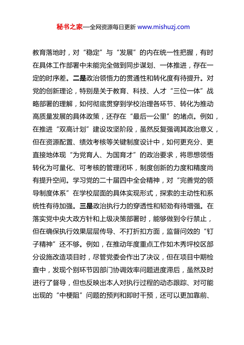秘书之家—全网资源每日更新 www.mishuzj.com职业技术学院党委书记 2025 年度民主生活会个人对照检查材料 根据本次民主生活会主题要求,本人紧扣深入学习贯彻习近平新时代中国特色社会主义思想,全面贯彻落实党的二十届三中、四中全会精神,以及锲而不舍落实推进作风建设常态化长效化的核心要义,在深入开展学习研讨、广泛征求意见建议、坦诚进行谈心谈话的基础上,严格对照“五个带头”要求,紧密联系个人思想、职责和工作实际,进行了深刻的自我剖析和反思。现将个人对照检查情况报告如下。一、存在的主要问题(一)带头强化政治忠诚、提高政治能力方面。一是政治判断力的前瞻性和敏锐性有待加强。面对职业教育领域深刻变革和区域发展新形势,有时对潜在的风险挑战和机遇辨识不够及时、精准。例如,在谋划学校“十五五”发展规划前期工作时,虽然组织了多轮研讨,但对国家关于职业技术大学设置政策的深层导向和可能带来的连锁反应,研判的深度和预见性尚有不足,更多侧重于对标既有指标,导致部分规划内容的前瞻布局不够大胆,与地方产业未来需求的超前对接思考可以更进一步。在贯彻“稳定、发展、生态、强边”四件大事结合职业秘书之家—全网资源每日更新 www.mishuzj.com教育落地时,对“稳定”与“发展”的内在统一性把握,有时在具体工作部署中未能完全做到同步谋划、一体推进,存在一定的时序差。二是政治领悟力的贯通性和转化度有待提升。对党的创新理论,特别是关于教育、科技、人才“三位一体”战略部署的理解,如何彻底贯穿到学校治理各环节、转化为推动高质量发展的具体政策,还存在“最后一公里”的堵点。例如,在推进“双高计划”建设攻坚阶段,虽然反复强调其政治意义,但在资源配置、绩效考核等关键制度设计中,如何更充分、更直接地体现“为党育人、为国育才”的政治要求,将思想领悟转化为可量化、可考核的管理闭环,制度创新的力度和精度尚有提升空间。学习党的二十届四中全会精神,对“完善党的领导制度体系”在学校层面的具体实现形式,探索的主动性和系统性有待加强。三是政治执行力的穿透性和韧劲有待增强。在落实党中央大政方针和上级决策部署时,能够做到令行禁止,但在确保执行效果层层传导、不打折扣方面,监督问效的“钉子精神”还不够。例如,在推动年度重点工作如木秀坪校区部分设施改造项目时,尽管党委会作出了决议,但在项目中期检查中,发现个别环节因部门协调效率问题进度滞后,虽然及时进行了督导,但也反映出本人对执行过程的动态跟踪、对可能出现的“中梗阻”问题的预判和即时干预,还可以更加靠前、秘书之家—全网资源每日更新 www.mishuzj.com更加细致。在落实某些需要长期坚持的基础性工作上,如师德师风长效机制建设,存在初期部署严、后期常规化督导有所弱化的现象,一抓到底的韧劲需持续强化。(二)带头固本培元、增强党性方面。一是理论武装“学用结合”的紧密度有待提高。能够坚持参加中心组学习、完成规定篇目阅读,但在运用习近平新时代中国特色社会主义思想的世界观、方法论,在破解学校改革发展深层次矛盾上,转化运用不够自如。例如,面对部分二级学院产教融合“合而不深”、校企合作停留在协议层面的问题,虽然意识到需要运用“系统观念”和“问题导向”去解决,但在牵头设计跨部门协同机制、撬动企业真实投入方面,提出的解决方案创新性不足,未能完全将学习成果转化为根治顽瘴痼疾的有效策略。对党章党规党纪的日常温习、对照检视,有时与繁忙事务性工作冲突,未能真正做到常学常新、入脑入心。二是党性锻炼“主动淬炼”的自觉性有待增强。作为一名老党员,能够坚守基本底线,但在严肃党内政治生活、用好批评和自我批评武器上,“辣味”还可以更足。在参加所在支部组织生活时,虽然能以普通党员身份发言,但有时对支部其他同志的批评意见,侧重于工作建议,触及思想灵魂、打扫政治灰尘的深度互动有待加强。在自我革命精神的践行上,对于自身一些固有的思维定式和工秘书之家—全网资源每日更新 www.mishuzj.com作习惯,如习惯于听汇报、看材料掌握情况,主动“下沉”到教学一线、实训基地与师生面对面交流的频率和深...