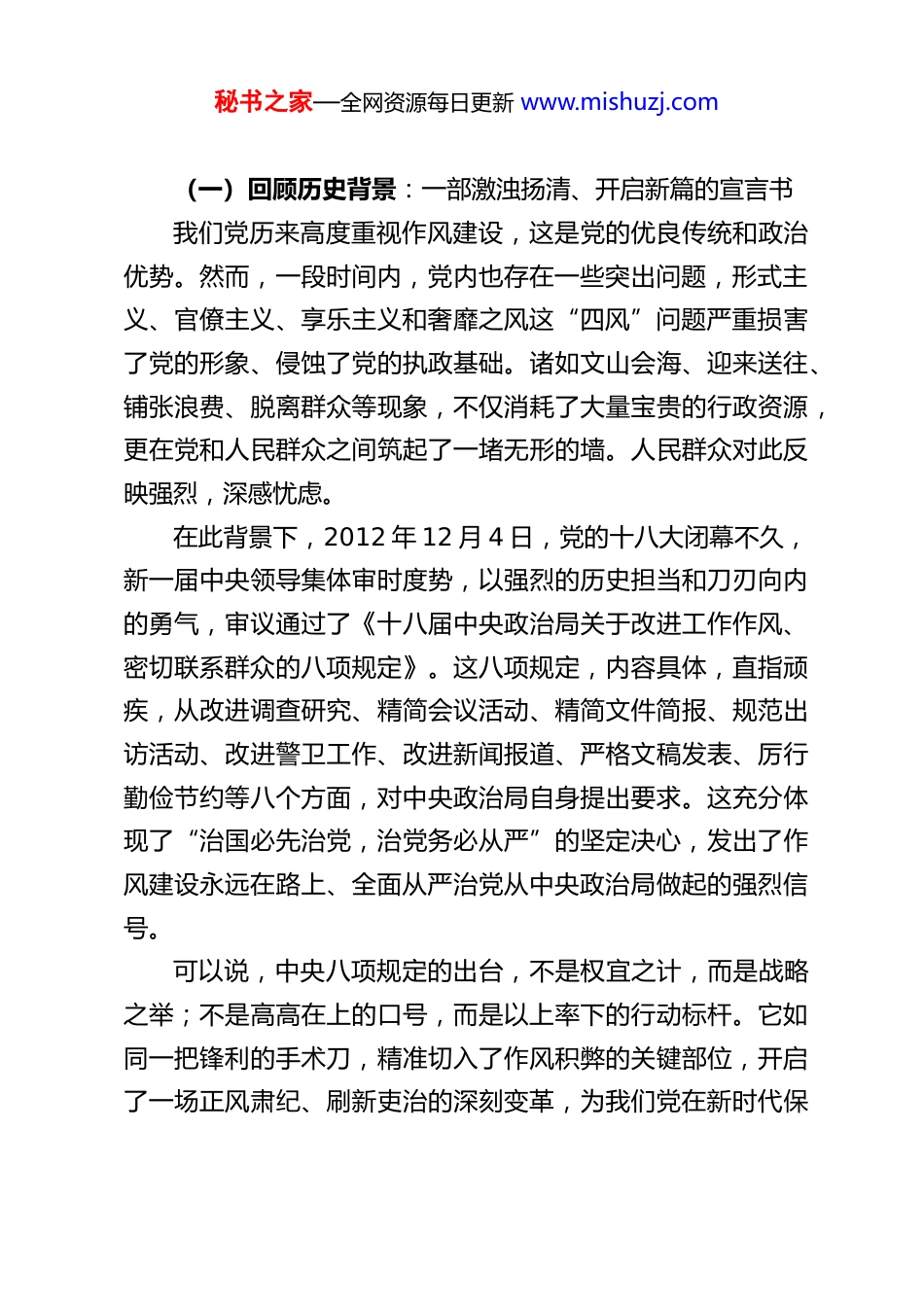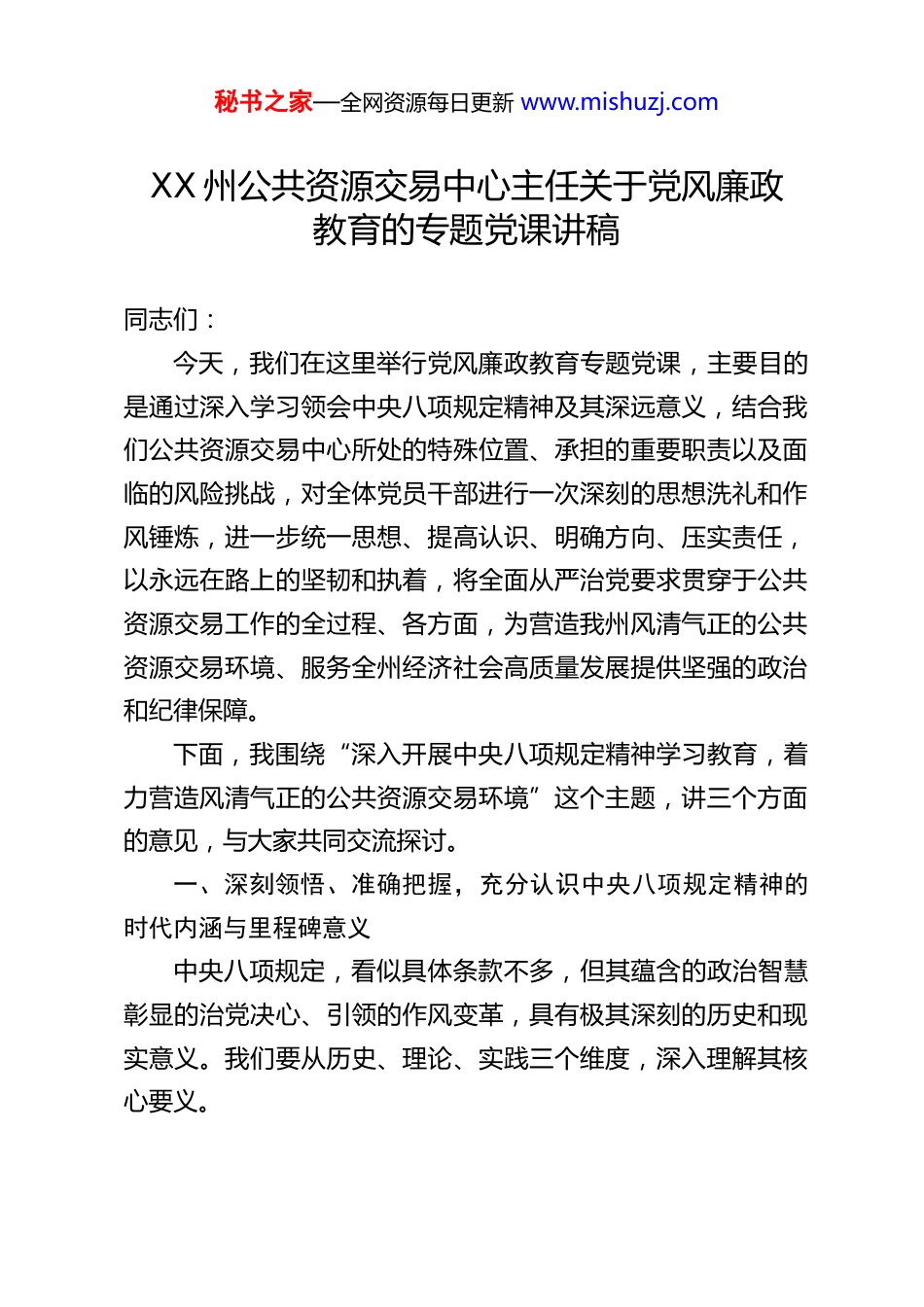 秘书之家—全网资源每日更新 www.mishuzj.comXX 州公共资源交易中心主任关于党风廉政教育的专题党课讲稿同志们:今天,我们在这里举行党风廉政教育专题党课,主要目的是通过深入学习领会中央八项规定精神及其深远意义,结合我们公共资源交易中心所处的特殊位置、承担的重要职责以及面临的风险挑战,对全体党员干部进行一次深刻的思想洗礼和作风锤炼,进一步统一思想、提高认识、明确方向、压实责任,以永远在路上的坚韧和执着,将全面从严治党要求贯穿于公共资源交易工作的全过程、各方面,为营造我州风清气正的公共资源交易环境、服务全州经济社会高质量发展提供坚强的政治和纪律保障。下面,我围绕“深入开展中央八项规定精神学习教育,着力营造风清气正的公共资源交易环境”这个主题,讲三个方面的意见,与大家共同交流探讨。一、深刻领悟、准确把握,充分认识中央八项规定精神的时代内涵与里程碑意义中央八项规定,看似具体条款不多,但其蕴含的政治智慧彰显的治党决心、引领的作风变革,具有极其深刻的历史和现实意义。我们要从历史、理论、实践三个维度,深入理解其核心要义。秘书之家—全网资源每日更新 www.mishuzj.com(一)回顾历史背景:一部激浊扬清、开启新篇的宣言书我们党历来高度重视作风建设,这是党的优良传统和政治优势。然而,一段时间内,党内也存在一些突出问题,形式主义、官僚主义、享乐主义和奢靡之风这“四风”问题严重损害了党的形象、侵蚀了党的执政基础。诸如文山会海、迎来送往、铺张浪费、脱离群众等现象,不仅消耗了大量宝贵的行政资源,更在党和人民群众之间筑起了一堵无形的墙。人民群众对此反映强烈,深感忧虑。在此背景下,2012 年 12 月 4 日,党的十八大闭幕不久,新一届中央领导集体审时度势,以强烈的历史担当和刀刃向内的勇气,审议通过了《十八届中央政治局关于改进工作作风、密切联系群众的八项规定》。这八项规定,内容具体,直指顽疾,从改进调查研究、精简会议活动、精简文件简报、规范出访活动、改进警卫工作、改进新闻报道、严格文稿发表、厉行勤俭节约等八个方面,对中央政治局自身提出要求。这充分体现了“治国必先治党,治党务必从严”的坚定决心,发出了作风建设永远在路上、全面从严治党从中央政治局做起的强烈信号。可以说,中央八项规定的出台,不是权宜之计,而是战略之举;不是高高在上的口号,而是以上率下的行动标杆。它如同一把锋利的手术刀,精准切入了作风积弊的关键部位,开启了一场正风肃纪、刷新吏治的深刻变革,为我们党在新时代保秘书之家—全网资源每日更新 www.mishuzj.com持先进性和纯洁性、巩固执政地位奠定了坚实的基础。这是我们理解八项规定精神必须把握的历史起点。(二)把握核心要义:一个管党治党、密切联系群众的重要法宝中央八项规定精神的核心要义,绝非仅仅局限于八条具体内容本身,其精神实质是永恒的,主要体现在以下几个方面:体现了以上率下的领导方法。“子帅以正,孰敢不正?”中央八项规定首先是对中央政治局的要求,习近平总书记和其他中央领导同志以身作则、率先垂范,无论国内考察还是出国访问,都严格遵守规定,为全党树立了榜样。这种“从最高层做起”的示范效应,形成了强大的感召力和约束力,推动了全党作风的转变。这告诉我们,作风建设关键在领导干部,尤其是主要领导干部。在我们中心,班子成员、各科室负责人也必须带头执行各项纪律规定,要求别人做到的,自己首先做到;要求别人不做的,自己坚决不做。彰显了密切联系群众的根本宗旨。八项规定的每一条都蕴含着浓厚的为民情怀。改进调查研究是为了更真切地了解实情、倾听民意;精简会议文件是为了把更多时间和精力用在抓落实、解难题上;厉行勤俭节约是为了把有限的资源更多用于改善民生。其最终落脚点都是为了保持党同人民群众的血肉联系,巩固党的执政根基。公共资源交易工作直接服务市场主体,关乎政府形象和公信力,我们的作风如何,效率高低,是否廉洁,秘书之家—全网资源每日更新 www.mishuzj.com直接影响到企业和群众对党和政府的评价。因此,我们必须把服务对象满意不满意作为检验我们工作成效的重要标...
