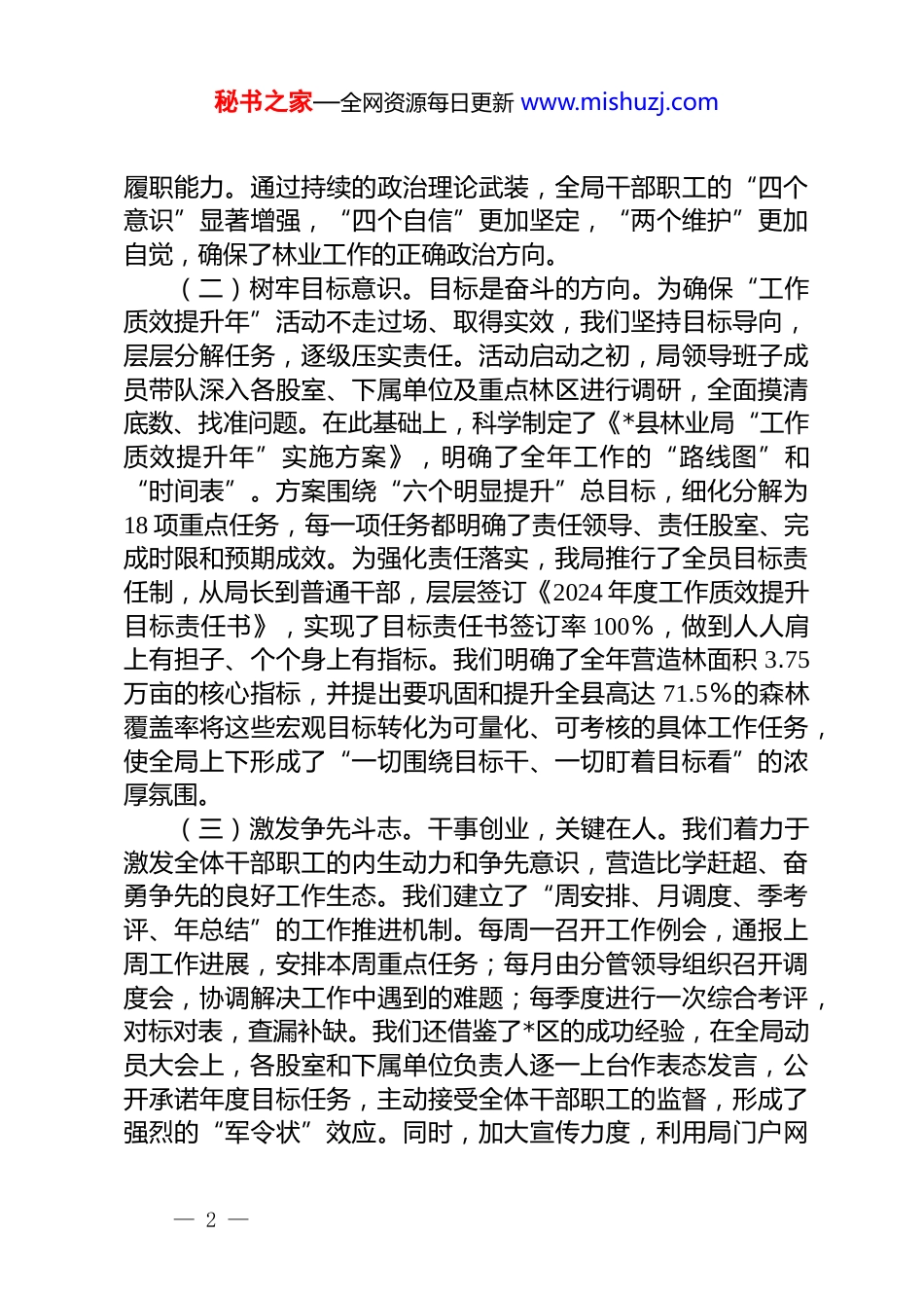 秘书之家—全网资源每日更新 www.mishuzj.com县林业局“实干争先抓落实,工作质效提升年”工作总结根据县委、县政府的统一部署,*县林业局深入开展“实干争先抓落实,工作质效提升年”活动。一年来,全局上下紧紧围绕“生态立县、绿色崛起”的发展战略,以“定标明责、谋深抓实、加压奋进”为总基调,全体干部职工凝心聚力、锐意进取,各项工作取得了显著成效,为建设美丽*提供了坚实的生态保障。现将全年工作总结如下:一、以“思想破冰”为先导,筑牢落实之基思想是行动的先导。我局坚持将思想建设摆在首位,通过一系列举措,打破思维定势,破除发展障碍,为全年工作的高效落实奠定了坚实的思想基础。(一)强化政治担当。我们深刻认识到,林业工作不仅是业务工作,更是重要的政治工作。全局上下始终将政治建设贯穿于林业工作的全过程和各方面。年初,局党组专题召开“工作质效提升年”动员部署会,传达学习了全县三级干部大会精神,要求全体干部职工必须“进一步思想破冰,转变作风,奋力争先进位”,将思想和行动统一到县委的决策部署上来。我们组织开展了多层次、全覆盖的政治理论学习。通过党组理论学习中心组学习、“三会一课”、主题党日等形式,深入学习习近平新时代中国特色社会主义思想,特别是习近平生态文明思想和关于林业草原工作的重要论述。2024 年 11 月,我局机关党委专门举办了为期两天的党建业务知识培训班,局属各基层党组织书记、党建专干及驻村第一书记等 40 余人参加了培训,聚焦党的二十届三中全会精神等重点内容,通过“专题辅导+现场观摩”的形式,有效提升了基层党务工作者的政治素养和— 1 —秘书之家—全网资源每日更新 www.mishuzj.com履职能力。通过持续的政治理论武装,全局干部职工的“四个意识”显著增强,“四个自信”更加坚定,“两个维护”更加自觉,确保了林业工作的正确政治方向。(二)树牢目标意识。目标是奋斗的方向。为确保“工作质效提升年”活动不走过场、取得实效,我们坚持目标导向,层层分解任务,逐级压实责任。活动启动之初,局领导班子成员带队深入各股室、下属单位及重点林区进行调研,全面摸清底数、找准问题。在此基础上,科学制定了《*县林业局“工作质效提升年”实施方案》,明确了全年工作的“路线图”和“时间表”。方案围绕“六个明显提升”总目标,细化分解为18 项重点任务,每一项任务都明确了责任领导、责任股室、完成时限和预期成效。为强化责任落实,我局推行了全员目标责任制,从局长到普通干部,层层签订《2024 年度工作质效提升目标责任书》,实现了目标责任书签订率 100%,做到人人肩上有担子、个个身上有指标。我们明确了全年营造林面积 3.75万亩的核心指标,并提出要巩固和提升全县高达 71.5%的森林覆盖率将这些宏观目标转化为可量化、可考核的具体工作任务,使全局上下形成了“一切围绕目标干、一切盯着目标看”的浓厚氛围。(三)激发争先斗志。干事创业,关键在人。我们着力于激发全体干部职工的内生动力和争先意识,营造比学赶超、奋勇争先的良好工作生态。我们建立了“周安排、月调度、季考评、年总结”的工作推进机制。每周一召开工作例会,通报上周工作进展,安排本周重点任务;每月由分管领导组织召开调度会,协调解决工作中遇到的难题;每季度进行一次综合考评,对标对表,查漏补缺。我们还借鉴了*区的成功经验,在全局动员大会上,各股室和下属单位负责人逐一上台作表态发言,公开承诺年度目标任务,主动接受全体干部职工的监督,形成了强烈的“军令状”效应。同时,加大宣传力度,利用局门户网— 2 —秘书之家—全网资源每日更新 www.mishuzj.com站、宣传栏、工作简报等平台,大力宣传活动中涌现出的先进典型和成功经验,讲述林业人扎根山林、守护绿色的感人故事,有效激发了广大干部职工的职业荣誉感和工作热情,形成了“人人思进、个个争先”的生动局面。二、以“精准发力”为关键,攻克落实之要抓落实,必须找准症结、精准施策。我局紧紧围绕林业核心业务,将“工作质效提升年”的 18 项重点任务与主责主业深度融合,精准发力,破解了一系列发展难题。(一)提高斗争...