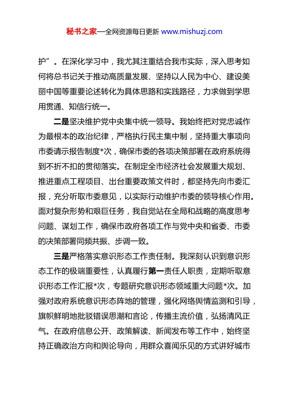秘书之家—全网资源每日更新 www.mishuzj.com2025 年度市长个人述责述廉报告 一年来,在市委的坚强领导下,在市人大、市政协的监督支持下,我始终以习近平新时代中国特色社会主义思想为指导,心怀“国之大者”,牢记人民嘱托,恪尽职守、勤勉工作,聚焦经济发展、社会治理、民生改善和生态文明建设等各项重点任务,带领市政府一班人锐意进取、攻坚克难。同时,我始终绷紧廉洁自律这根弦,严格要求自己,主动接受监督,努力为全市人民交上一份合格的答卷。现将本人一年来的履责和廉洁情况报告如下,恳请各位领导和同志们评议。一、坚定政治立场,筑牢思想根基,以过硬政治建设引领发展航向一是深入学习贯彻习近平新时代中国特色社会主义思想。我严格落实“第一议题”制度,主持市政府常务会议、理论学习中心组学习共*次,第一时间传达学习习近平总书记最新重要讲话精神和党中央决策部署。系统研读《习近平谈治国理政》第四卷、第五卷,专题学习《习近平经济思想学习纲要》《习近平法治思想学习纲要》等权威著作。通过集中研讨、专题讲座、实地调研等多种形式,深刻领悟“两个确立”的决定性意义,增强“四个意识”、坚定“四个自信”、做到“两个维秘书之家—全网资源每日更新 www.mishuzj.com护”。在深化学习中,我尤其注重结合我市实际,深入思考如何将总书记关于推动高质量发展、坚持以人民为中心、建设美丽中国等重要论述转化为具体思路和实践路径,力求做到学思用贯通、知信行统一。二是坚决维护党中央集中统一领导。我始终把对党忠诚作为最根本的政治纪律,严格执行民主集中制,坚持重大事项向市委请示报告制度*次,确保市委的各项决策部署在政府系统得到不折不扣的贯彻落实。在制定全市经济社会发展重大规划、推进重点工程项目、出台重要政策文件时,都坚持先向市委汇报,充分听取市委意见,以实际行动维护市委的领导核心作用。面对复杂形势和艰巨任务,我自觉站在全局和战略的高度思考问题、谋划工作,确保市政府各项工作与党中央和省委、市委的决策部署同频共振、步调一致。三是严格落实意识形态工作责任制。我深刻认识到意识形态工作的极端重要性,认真履行第一责任人职责,定期听取意识形态工作汇报*次,专题研究意识形态领域重大问题*次。加强对政府系统意识形态阵地的管理,强化网络舆情监测和引导,旗帜鲜明地批驳错误思潮和言论,传播主流价值,弘扬清风正气。在政府信息公开、政策解读、新闻发布等工作中,始终坚持正确政治方向和舆论导向,用群众喜闻乐见的方式讲好城市秘书之家—全网资源每日更新 www.mishuzj.com故事,凝聚奋进力量。四是持续提升政治能力和政治判断力、政治领悟力、政治执行力。我深刻认识到,作为市长,提升政治能力是履职尽责的根本保障。我自觉加强党性锻炼,对照党章党规党纪,定期开展批评与自我批评,检视自身存在的不足。在处理复杂问题和应对风险挑战时,我注重从政治上看问题、办事情,善于从纷繁复杂的现象中把握本质,从各种信息中甄别真伪,从不同意见中汲取智慧,确保各项决策既符合政策法规,又顺应民心民意。我带领市政府班子成员,将政治要求融入具体业务工作,以实际成效检验政治站位,努力把党中央和省委、市委的决策部署转化为全市人民可见可感的生动实践。二、忠诚履职尽责,担当作为,推动经济社会高质量发展迈上新台阶(一)聚力创新驱动,厚植发展新优势。一是科技创新体系建设实现突破。我牵头组织编制了《科技创新发展五年规划(2025—2029 年)》,明确了“*个主攻方向、*项重点任务”。全年新增国家级高新技术企业*家,省级科技型中小企业*家。我亲自对接*家顶尖科研院所,促成*个重点实验室和*个产业技术研究院落户我市,搭建了产学研深度融合的创新平台。市财政在科技研发投入同比增长*%,有效激发了企业创新的内生动秘书之家—全网资源每日更新 www.mishuzj.com力。全市研发经费投入强度达到*%,位居全省前列。二是产业转型升级步伐加快。我市紧抓战略性新兴产业发展机遇,出台了《加快培育“*+*”现代化产业体系实施意见》,集中资源打造新一代信息技术、高端装备制造、生物医药等支柱产业集群。全年引...