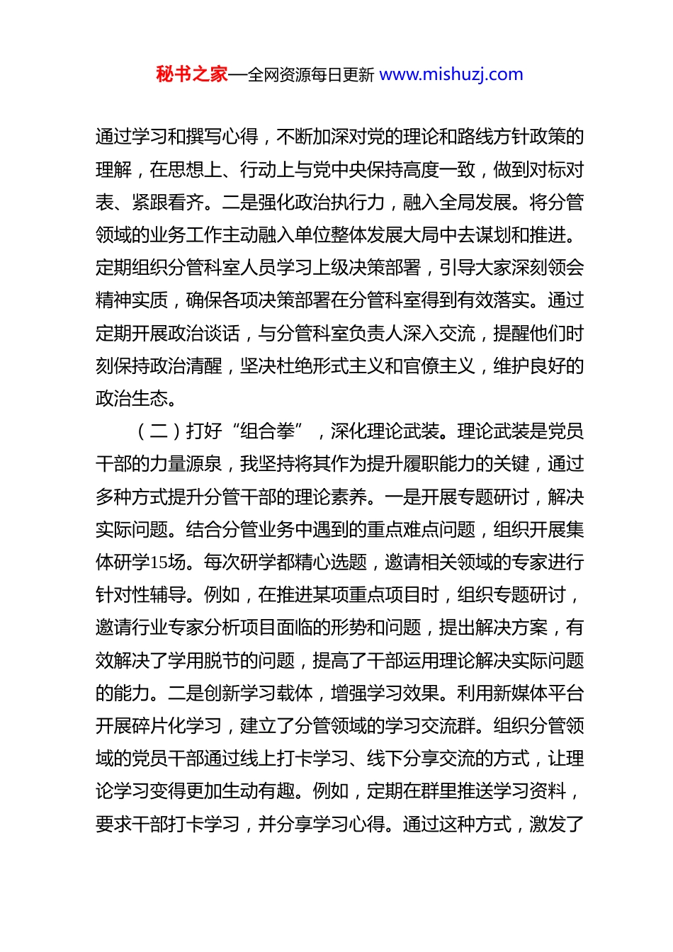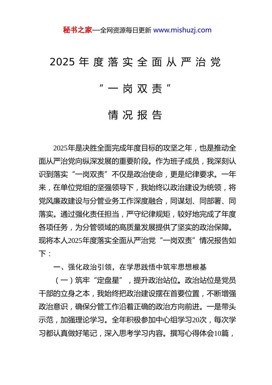 秘书之家—全网资源每日更新 www.mishuzj.com2025 年 度 落 实 全 面 从 严 治 党“ 一 岗 双 责 ”情 况 报 告2025年是决胜全面完成年度目标的攻坚之年,也是推动全面从严治党向纵深发展的重要阶段。作为班子成员,我深刻认识到落实“一岗双责”不仅是政治使命,更是纪律要求。一年来,在单位党组的坚强领导下,我始终以政治建设为统领,将党风廉政建设与分管业务工作深度融合,同谋划、同部署、同落实。通过强化责任担当,严守纪律规矩,较好地完成了年度各项任务,为分管领域的高质量发展提供了坚实的政治保障。现将本人2025年度落实全面从严治党“一岗双责”情况报告如下:一、强化政治引领,在学思践悟中筑牢思想根基(一)筑牢“定盘星”,提升政治站位。政治站位是党员干部的立身之本,我始终把政治建设摆在首要位置,不断增强政治意识,确保分管工作沿着正确的政治方向前进。一是带头示范,加强理论学习。全年积极参加中心组学习20次,每次学习都认真做好笔记,深入思考学习内容。撰写心得体会10篇,秘书之家—全网资源每日更新 www.mishuzj.com通过学习和撰写心得,不断加深对党的理论和路线方针政策的理解,在思想上、行动上与党中央保持高度一致,做到对标对表、紧跟看齐。二是强化政治执行力,融入全局发展。将分管领域的业务工作主动融入单位整体发展大局中去谋划和推进。定期组织分管科室人员学习上级决策部署,引导大家深刻领会精神实质,确保各项决策部署在分管科室得到有效落实。通过定期开展政治谈话,与分管科室负责人深入交流,提醒他们时刻保持政治清醒,坚决杜绝形式主义和官僚主义,维护良好的政治生态。(二)打好“组合拳”,深化理论武装。理论武装是党员干部的力量源泉,我坚持将其作为提升履职能力的关键,通过多种方式提升分管干部的理论素养。一是开展专题研讨,解决实际问题。结合分管业务中遇到的重点难点问题,组织开展集体研学15场。每次研学都精心选题,邀请相关领域的专家进行针对性辅导。例如,在推进某项重点项目时,组织专题研讨,邀请行业专家分析项目面临的形势和问题,提出解决方案,有效解决了学用脱节的问题,提高了干部运用理论解决实际问题的能力。二是创新学习载体,增强学习效果。利用新媒体平台开展碎片化学习,建立了分管领域的学习交流群。组织分管领域的党员干部通过线上打卡学习、线下分享交流的方式,让理论学习变得更加生动有趣。例如,定期在群里推送学习资料,要求干部打卡学习,并分享学习心得。通过这种方式,激发了秘书之家—全网资源每日更新 www.mishuzj.com干部的学习积极性,增强了学习效果,使分管干部的理想信念更加坚定,政治敏锐性和判断力显著提高。二、聚焦主责主业,在履职尽责中彰显担当作为(一)牵住“牛鼻子”,压实管党责任。落实“一岗双责”,关键在于抓好责任制的落实,我紧紧抓住这个关键环节,确保责任层层传导。一是细化责任清单,明确任务分工。年初与分管的5 个科室签订党风廉政建设责任书5 份,根据各科室的工作特点和职责,明确了年度党风廉政建设工作的重点任务和完成时限,将责任落实到具体的人、具体的岗位,做到任务清晰、责任明确。二是强化日常监督,及时发现问题。每季度听取分管科室关于廉政建设的情况汇报,深入了解工作进展和存在的问题。对发现的苗头性、倾向性问题,及时进行“红脸出汗”的提醒谈话,全年开展廉政谈话30人次。通过常态化的监督检查,改变了过去重业务轻党建的现象,形成了党风廉政建设和业务工作齐抓共管的良好局面。(二)扎紧“铁笼子”,完善制度建设。制度建设是党风廉政建设的重要保障,我注重加强分管领域的制度建设,用制度管人管事。一是完善内部管理制度。针对分管科室的工作流程和特点,修订完善了考勤制度、财务管理制度、工作审批制度等一系列内部管理制度,确保各项工作有章可循、规范有序。例如,在财务管理制度方面,严格规范了经费审批流程,加强了对经费使用的监督,防止出现违规开支的情况。二是加强制秘书之家—全网资源每日更新 www.mishuzj.com度执行监督。定期对制度执行情况进行检查,对违反制度的行为严肃处...