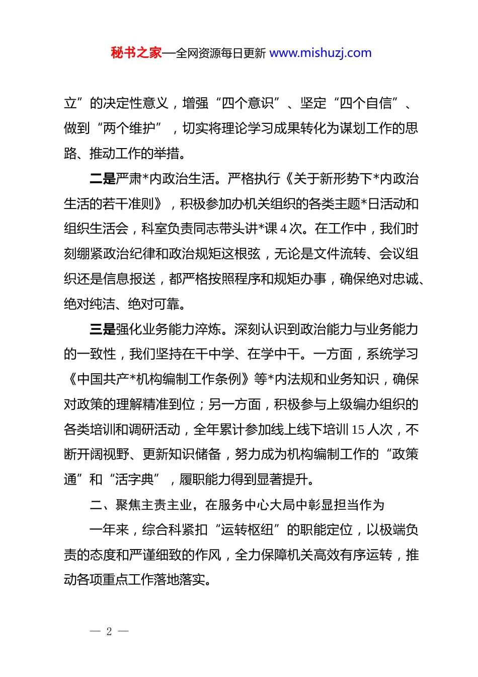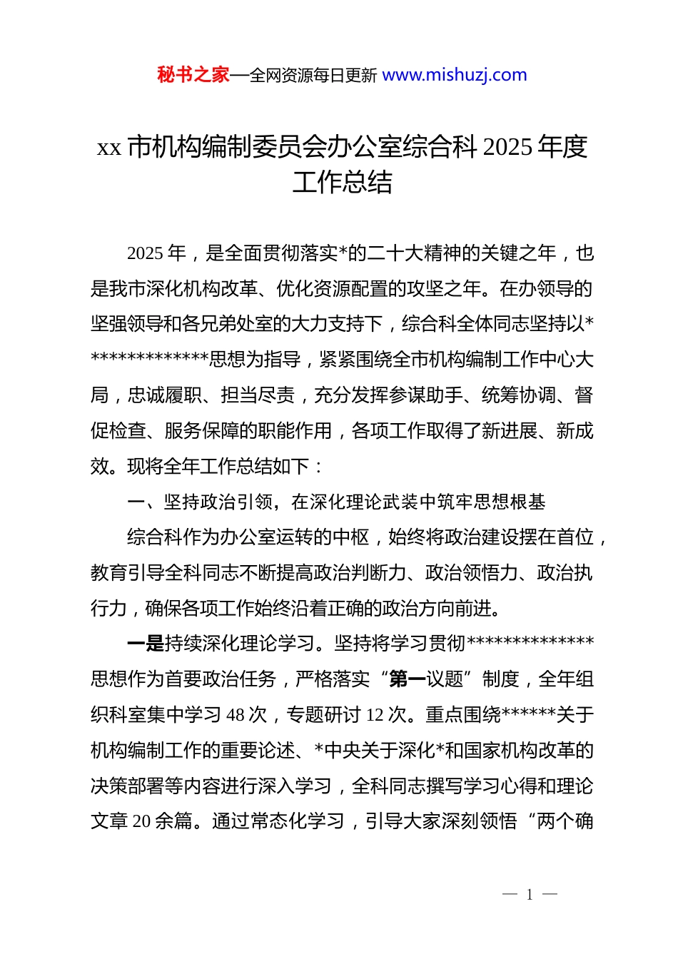 秘书之家—全网资源每日更新 www.mishuzj.comxx 市机构编制委员会办公室综合科 2025 年度工作总结2025 年,是全面贯彻落实*的二十大精神的关键之年,也是我市深化机构改革、优化资源配置的攻坚之年。在办领导的坚强领导和各兄弟处室的大力支持下,综合科全体同志坚持以**************思想为指导,紧紧围绕全市机构编制工作中心大局,忠诚履职、担当尽责,充分发挥参谋助手、统筹协调、督促检查、服务保障的职能作用,各项工作取得了新进展、新成效。现将全年工作总结如下:一、坚持政治引领,在深化理论武装中筑牢思想根基综合科作为办公室运转的中枢,始终将政治建设摆在首位,教育引导全科同志不断提高政治判断力、政治领悟力、政治执行力,确保各项工作始终沿着正确的政治方向前进。一是持续深化理论学习。坚持将学习贯彻**************思想作为首要政治任务,严格落实“第一议题”制度,全年组织科室集中学习 48 次,专题研讨 12 次。重点围绕******关于机构编制工作的重要论述、*中央关于深化*和国家机构改革的决策部署等内容进行深入学习,全科同志撰写学习心得和理论文章 20 余篇。通过常态化学习,引导大家深刻领悟“两个确— 1 —秘书之家—全网资源每日更新 www.mishuzj.com立”的决定性意义,增强“四个意识”、坚定“四个自信”、做到“两个维护”,切实将理论学习成果转化为谋划工作的思路、推动工作的举措。二是严肃*内政治生活。严格执行《关于新形势下*内政治生活的若干准则》,积极参加办机关组织的各类主题*日活动和组织生活会,科室负责同志带头讲*课 4 次。在工作中,我们时刻绷紧政治纪律和政治规矩这根弦,无论是文件流转、会议组织还是信息报送,都严格按照程序和规矩办事,确保绝对忠诚、绝对纯洁、绝对可靠。三是强化业务能力淬炼。深刻认识到政治能力与业务能力的一致性,我们坚持在干中学、在学中干。一方面,系统学习《中国共产*机构编制工作条例》等*内法规和业务知识,确保对政策的理解精准到位;另一方面,积极参与上级编办组织的各类培训和调研活动,全年累计参加线上线下培训 15 人次,不断开阔视野、更新知识储备,努力成为机构编制工作的“政策通”和“活字典”,履职能力得到显著提升。二、聚焦主责主业,在服务中心大局中彰显担当作为一年来,综合科紧扣“运转枢纽”的职能定位,以极端负责的态度和严谨细致的作风,全力保障机关高效有序运转,推动各项重点工作落地落实。— 2 —秘书之家—全网资源每日更新 www.mishuzj.com一是文电办理精准高效,保障机关有序运转。作为文件流转的“第一站”,我们深知文电办理的极端重要性。全年共处理各类收文 2100 余件,办理上级来电、来函 800 余件,起草、核发各类文件 750 余份,均做到了零差错、零延误。我们优化了内部公文流转流程,建立了“即收即办、急件急办、特事特办”的工作机制,平均办文时长缩短了 15%。在文件起草和审核环节,严格把好政治关、政策关、格式关、文字关,全年共审核修改各类文稿超过 180 万字,确保了办机关发出的每一份文件都经得起检验。二是统筹协调坚强有力,凝聚工作强大合力。综合协调是综合科的核心职能。我们牢固树立“一盘棋”思想,积极发挥承上启下、联系左右、协调各方的作用。今年,我们牵头构建了“1+n”大协调工作机制,即围绕一项中心任务,建立一个工作专班,联动 n 个相关部门,实现信息互通、资源共享、力量整合。在推进 xx 领域事业单位重塑性改革工作中,我们主动担当,牵头组织协调会商 25 次,涉及市级职能部门 18 个,通过建立周报告、月调度制度,成功解决了部门间职责交叉、资源划转不畅等 40 余个具体问题,保障了改革方案在 10 月底前顺利印发实施,比原计划提前了近一个月。全年累计组织筹备主任办公会、专题会等各类重要会议 50 余场,会议纪要签发时效— 3 —秘书之家—全网资源每日更新 www.mishuzj.com性同比提升 40%,有效保障了决策部署的迅速传达和贯彻执行。三是督查督办动真碰硬,推动决策落地见效。为确保办领导的决策部署和重点工作安排不折不扣落到实处,我们创新了“督查+调...
