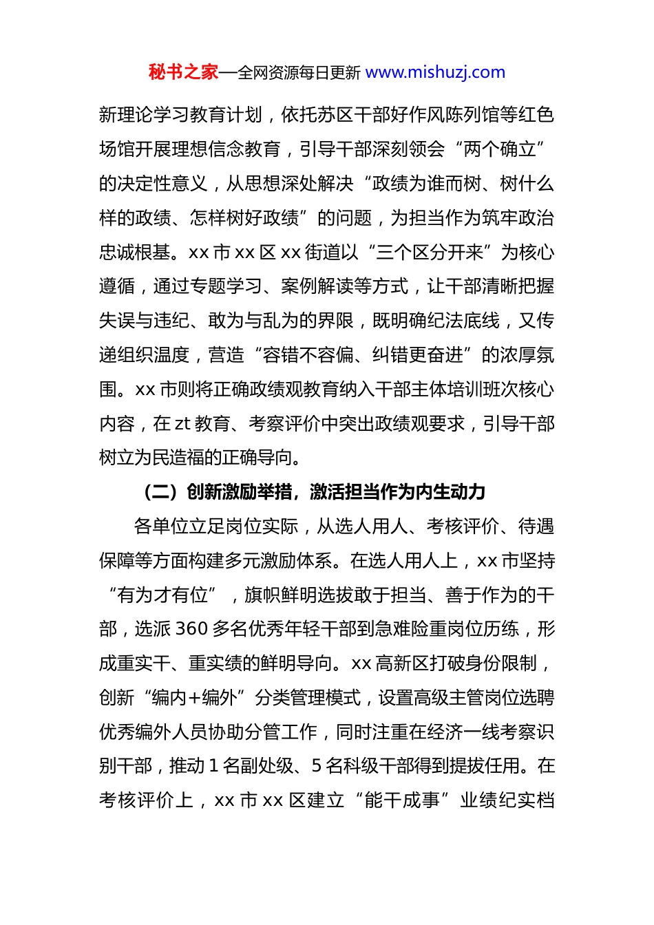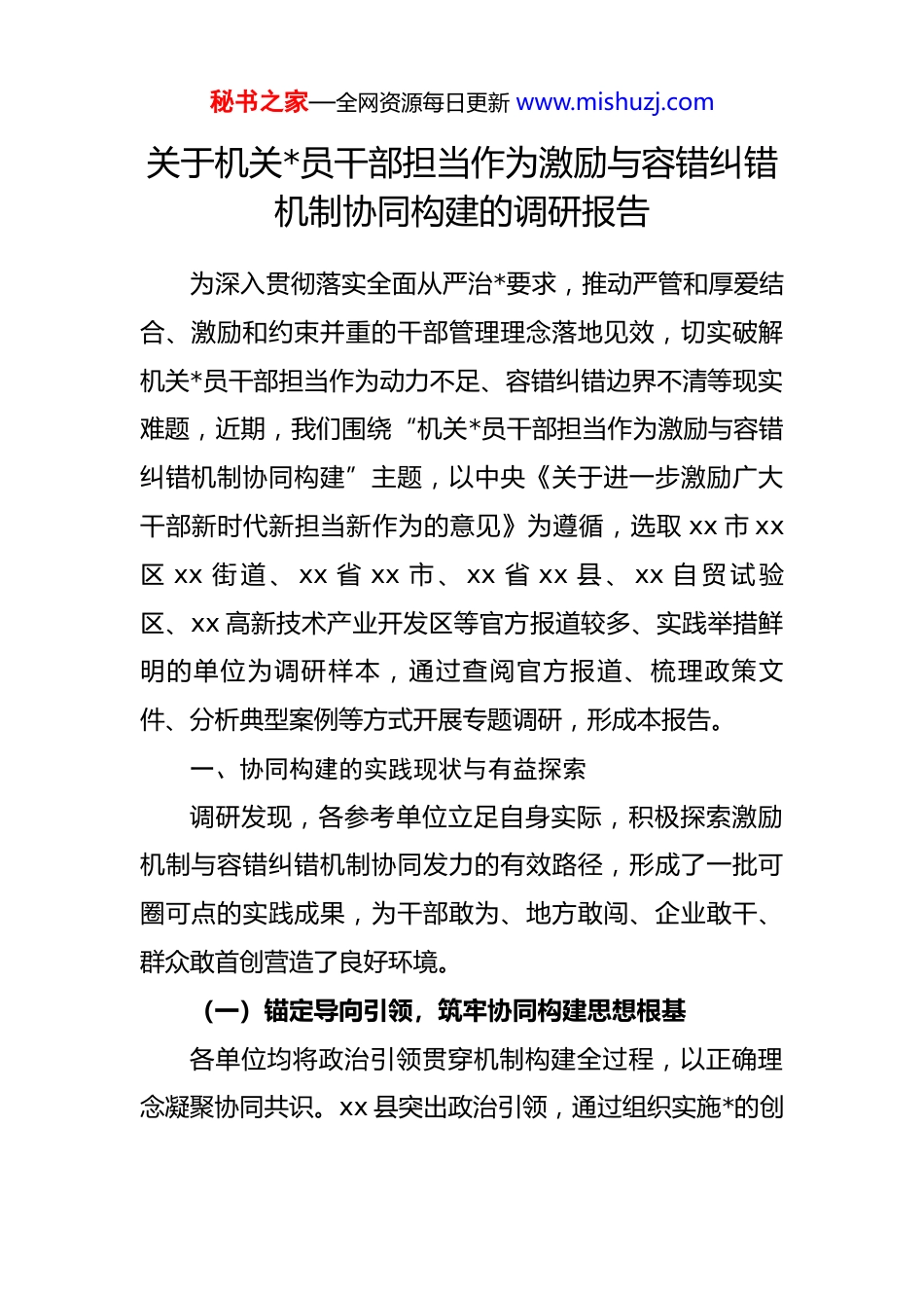 秘书之家—全网资源每日更新 www.mishuzj.com关于机关*员干部担当作为激励与容错纠错机制协同构建的调研报告为深入贯彻落实全面从严治*要求,推动严管和厚爱结合、激励和约束并重的干部管理理念落地见效,切实破解机关*员干部担当作为动力不足、容错纠错边界不清等现实难题,近期,我们围绕“机关*员干部担当作为激励与容错纠错机制协同构建”主题,以中央《关于进一步激励广大干部新时代新担当新作为的意见》为遵循,选取 xx 市 xx区 xx 街 道 、 xx 省 xx 市 、 xx 省 xx 县 、 xx 自 贸 试 验区、xx 高新技术产业开发区等官方报道较多、实践举措鲜明的单位为调研样本,通过查阅官方报道、梳理政策文件、分析典型案例等方式开展专题调研,形成本报告。一、协同构建的实践现状与有益探索调研发现,各参考单位立足自身实际,积极探索激励机制与容错纠错机制协同发力的有效路径,形成了一批可圈可点的实践成果,为干部敢为、地方敢闯、企业敢干、群众敢首创营造了良好环境。(一)锚定导向引领,筑牢协同构建思想根基各单位均将政治引领贯穿机制构建全过程,以正确理念凝聚协同共识。xx 县突出政治引领,通过组织实施*的创秘书之家—全网资源每日更新 www.mishuzj.com新理论学习教育计划,依托苏区干部好作风陈列馆等红色场馆开展理想信念教育,引导干部深刻领会“两个确立”的决定性意义,从思想深处解决“政绩为谁而树、树什么样的政绩、怎样树好政绩”的问题,为担当作为筑牢政治忠诚根基。xx 市 xx 区 xx 街道以“三个区分开来”为核心遵循,通过专题学习、案例解读等方式,让干部清晰把握失误与违纪、敢为与乱为的界限,既明确纪法底线,又传递组织温度,营造“容错不容偏、纠错更奋进”的浓厚氛围。xx 市则将正确政绩观教育纳入干部主体培训班次核心内容,在 zt 教育、考察评价中突出政绩观要求,引导干部树立为民造福的正确导向。(二)创新激励举措,激活担当作为内生动力各单位立足岗位实际,从选人用人、考核评价、待遇保障等方面构建多元激励体系。在选人用人上,xx 市坚持“有为才有位”,旗帜鲜明选拔敢于担当、善于作为的干部,选派 360 多名优秀年轻干部到急难险重岗位历练,形成重实干、重实绩的鲜明导向。xx 高新区打破身份限制,创新“编内+编外”分类管理模式,设置高级主管岗位选聘优秀编外人员协助分管工作,同时注重在经济一线考察识别干部,推动 1 名副处级、5 名科级干部得到提拔任用。在考核评价上,xx 市 xx 区建立“能干成事”业绩纪实档秘书之家—全网资源每日更新 www.mishuzj.com案,细化区级重点项目和部门工作两类量化指标,通过“亮实绩、晒业绩、评成绩”激发干部干事热情。在待遇保障上,xx 市优化公务员职级晋升、工资调标等政策,拓宽驻村干部晋升渠道,对长期在乡镇工作的优秀干部统筹调配岗位,解决实际困难;xx 县出台《干部减负十条措施》,落实职务职级并行等制度,让干部干事有舞台、生活有关怀。(三)细化容错边界,筑牢干事创业保障防线各单位严格落实“三个区分开来”要求,细化容错情形、规范认定流程,为敢闯敢试者撑腰鼓劲。xx 市 xx 区xx 街道联合多部门建立“研判小组”机制,从行为背景、初衷、过程、后果四个维度综合研判干部失误,对招商引资中因政策理解偏差导致流程延误但未造成重大损失的干部启动容错程序,通过“咬耳扯袖”督促整改,既守住纪法底线,又保护干事热情。xx 自贸试验区在《中国(xx)自由贸易试验区条例》中明确,对改革创新出现失误或未达预期目标的单位和个人,符合规定情形的可免责或减责,整改到位后不影响评先评优和晋升,以法治方式为创新松绑。xx 市明确不适宜担任现职干部的 15 种具体情形,建立纪委监委、组织、审计等部门联动机制,对苗头性问题及时提醒,对确需容错的精准界定,防止“一容了秘书之家—全网资源每日更新 www.mishuzj.com之”或“一责到底”。(四)探索协同路径,构建闭环管理工作体系部分单位积极探索两项机制协同发力的有效模式,形成“容错—纠错—激励—提升”的闭环管理。xx 市 xx 区xx 街道创新“回访+帮扶...