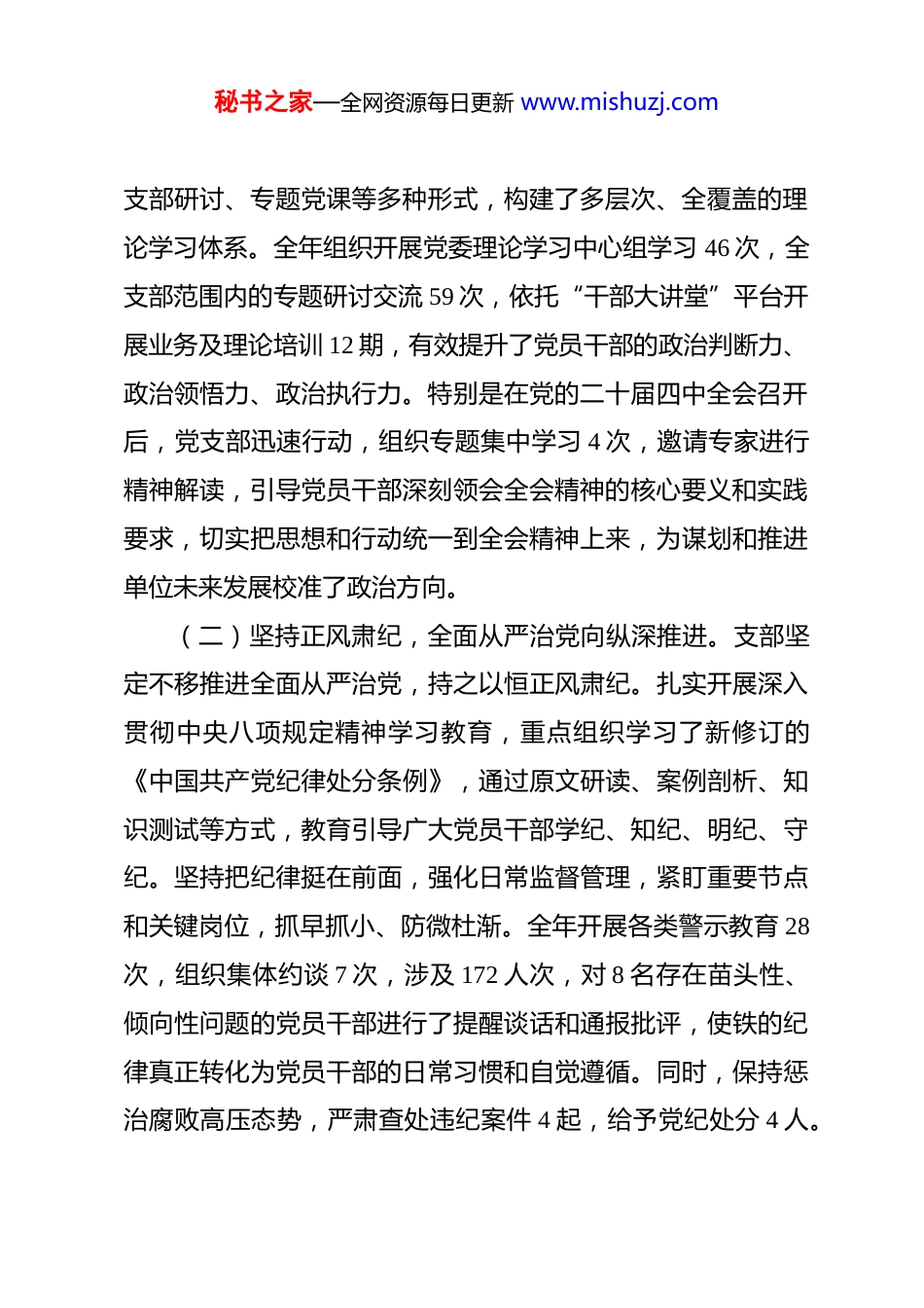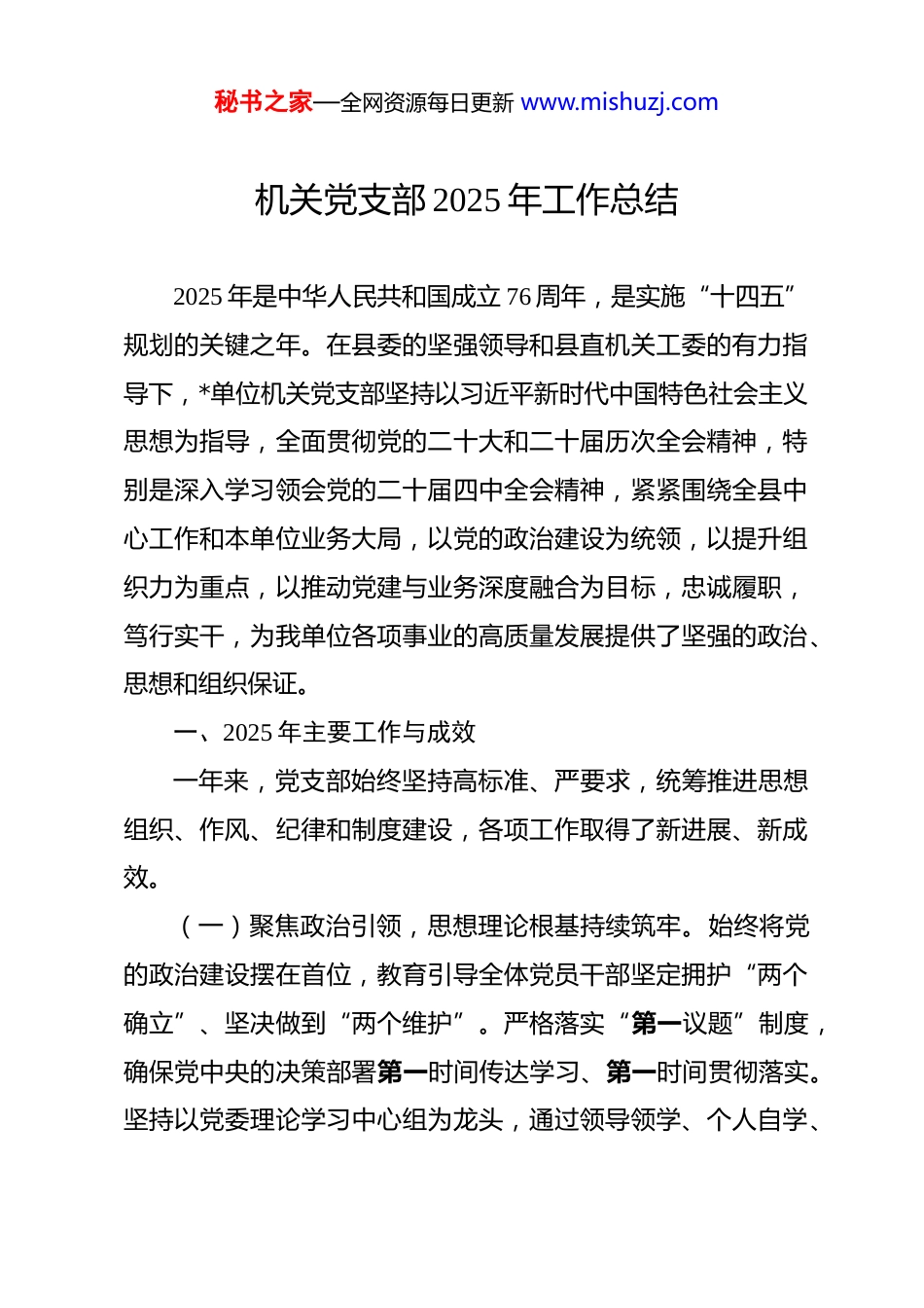 秘书之家—全网资源每日更新 www.mishuzj.com机关党支部 2025 年工作总结 2025 年是中华人民共和国成立 76 周年,是实施“十四五”规划的关键之年。在县委的坚强领导和县直机关工委的有力指导下,*单位机关党支部坚持以习近平新时代中国特色社会主义思想为指导,全面贯彻党的二十大和二十届历次全会精神,特别是深入学习领会党的二十届四中全会精神,紧紧围绕全县中心工作和本单位业务大局,以党的政治建设为统领,以提升组织力为重点,以推动党建与业务深度融合为目标,忠诚履职,笃行实干,为我单位各项事业的高质量发展提供了坚强的政治、思想和组织保证。一、2025 年主要工作与成效一年来,党支部始终坚持高标准、严要求,统筹推进思想组织、作风、纪律和制度建设,各项工作取得了新进展、新成效。(一)聚焦政治引领,思想理论根基持续筑牢。始终将党的政治建设摆在首位,教育引导全体党员干部坚定拥护“两个确立”、坚决做到“两个维护”。严格落实“第一议题”制度,确保党中央的决策部署第一时间传达学习、第一时间贯彻落实。坚持以党委理论学习中心组为龙头,通过领导领学、个人自学、秘书之家—全网资源每日更新 www.mishuzj.com支部研讨、专题党课等多种形式,构建了多层次、全覆盖的理论学习体系。全年组织开展党委理论学习中心组学习 46 次,全支部范围内的专题研讨交流 59 次,依托“干部大讲堂”平台开展业务及理论培训 12 期,有效提升了党员干部的政治判断力、政治领悟力、政治执行力。特别是在党的二十届四中全会召开后,党支部迅速行动,组织专题集中学习 4 次,邀请专家进行精神解读,引导党员干部深刻领会全会精神的核心要义和实践要求,切实把思想和行动统一到全会精神上来,为谋划和推进单位未来发展校准了政治方向。(二)坚持正风肃纪,全面从严治党向纵深推进。支部坚定不移推进全面从严治党,持之以恒正风肃纪。扎实开展深入贯彻中央八项规定精神学习教育,重点组织学习了新修订的《中国共产党纪律处分条例》,通过原文研读、案例剖析、知识测试等方式,教育引导广大党员干部学纪、知纪、明纪、守纪。坚持把纪律挺在前面,强化日常监督管理,紧盯重要节点和关键岗位,抓早抓小、防微杜渐。全年开展各类警示教育 28次,组织集体约谈 7 次,涉及 172 人次,对 8 名存在苗头性、倾向性问题的党员干部进行了提醒谈话和通报批评,使铁的纪律真正转化为党员干部的日常习惯和自觉遵循。同时,保持惩治腐败高压态势,严肃查处违纪案件 4 起,给予党纪处分 4 人。秘书之家—全网资源每日更新 www.mishuzj.com通过一系列举措,有效巩固了风清气正的政治生态,促进了单位党风政风持续向好。(三)夯实组织基础,战斗堡垒作用充分彰显。支部对标新时代党的建设总要求,持续深化党支部标准化、规范化建设。严格落实“三会一课”、组织生活会、民主评议党员、主题党日等基本制度,不断提升组织生活的政治性、时代性、原则性、战斗性。着力加强党员队伍建设,严把党员“入口关”,全年新发展党员 6 名,党员队伍的年龄、学历和专业结构得到持续优化。高度重视党员教育培训工作,靶向开展专题培训,累计完成党员教育培训 120 余人次,重点加强了政策理论、业务技能和群众工作能力等方面的培训。创新党员作用发挥载体,深化“党员先锋岗”“无职党员设岗定责”等活动,引导党员在急难险重任务中亮身份、当先锋、作表率,在单位各项工作中充分发挥了先锋模范作用,党支部的战斗堡垒作用愈发坚实。(四)推动深度融合,党建赋能业务发展成效显著。支部始终坚持围绕中心抓党建、抓好党建促业务,着力破解党建与业务“两张皮”问题,将组织优势转化为发展优势和治理效能。立足单位职能,推行“党建+重点项目”模式,针对年度重点工作和历史遗留难题,成立了由支部委员牵头、党员骨干为核心的“党员攻坚队”,成功破解了 2 个长期制约单位发展的瓶秘书之家—全网资源每日更新 www.mishuzj.com颈问题。积极探索“党建+服务优化”新路径,设立“党员服务示范窗口”,由党员带头承诺践诺,简化办事流程,提升服务效率,群众满意度显著提升。...