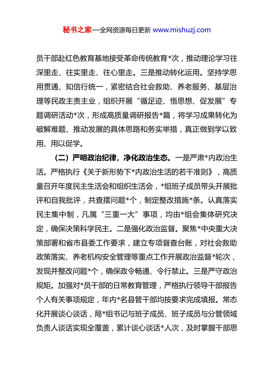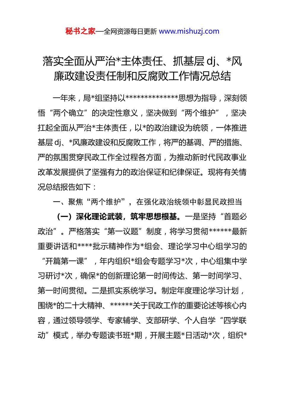 秘书之家—全网资源每日更新 www.mishuzj.com落实全面从严治*主体责任、抓基层 dj、*风廉政建设责任制和反腐败工作情况总结一年来,局*组坚持以**************思想为指导,深刻领悟“两个确立”的决定性意义,坚决做到“两个维护”,坚决扛起全面从严治*主体责任,以*的政治建设为统领,一体推进基层 dj、*风廉政建设和反腐败工作,将严的基调、严的措施、严的氛围贯穿民政工作全过程各方面,为推动新时代民政事业改革发展提供了坚强有力的政治保证和纪律保证。现将有关情况总结报告如下:一、聚焦“两个维护”,在强化政治统领中彰显民政担当(一)深化理论武装,筑牢思想根基。一是坚持“首题必政治”。严格落实“第一议题”制度,将学习贯彻******最新重要讲话和****批示精神作为*组会、理论学习中心组学习的“开篇第一课”,年内组织*组会专题学习*次,中心组集中学习研讨*次,确保*的创新理论第一时间传达、第一时间学习、第一时间贯彻。二是抓实系统学习。制定年度理论学习计划,围绕*的二十大精神、******关于民政工作的重要论述等核心内容,通过领导领学、专家辅学、支部研学、个人自学“四学联动”模式,举办专题读书班*期,开展主题*日活动*次,组织*秘书之家—全网资源每日更新 www.mishuzj.com员干部赴红色教育基地接受革命传统教育*次,推动理论学习往深里走、往实里走、往心里走。三是推动转化运用。坚持学思用贯通、知信行统一,紧密结合社会救助、养老服务、基层治理等民政主责主业,组织开展“循足迹、悟思想、促发展”专题调研活动*次,形成高质量调研报告*篇,将学习成果转化为破解难题、推动发展的具体思路和务实举措,真正做到学以致用、用以促学。(二)严明政治纪律,净化政治生态。一是严肃*内政治生活。严格执行《关于新形势下*内政治生活的若干准则》,高质量召开年度民主生活会和组织生活会,*组班子成员带头开展批评和自我批评,共查摆问题*个,制定整改措施*条。认真落实民主集中制,凡属“三重一大”事项,均由*组会集体研究决定,确保决策科学民主。二是强化政治监督。聚焦*中央重大决策部署和省市县委工作要求,建立专项督查台账,对社会救助政策落实、养老机构安全管理等重点工作开展政治监督*轮次,发现并整改问题*个,确保政令畅通、令行禁止。三是严守政治规矩。加强对*员干部的日常教育管理,严格执行领导干部报告个人有关事项规定,年内*名县管干部均按要求完成填报。常态化开展谈心谈话,局*组书记与班子成员、班子成员与分管领域负责人谈话实现全覆盖,累计谈心谈话*人次,及时掌握干部思秘书之家—全网资源每日更新 www.mishuzj.com想动态,抓早抓小、防微杜渐。(三)狠抓决策部署,服务中心大局。一是主动融入发展大局。坚决贯彻县委、县政府中心工作部署,将民政工作置于全县经济社会发展大局中谋划和推进。围绕乡村振兴战略,投入资金*万元,实施农村“三留守”人员关爱服务项目*个;围绕共同富裕示范区建设,优化低收入人口动态监测和常态化救助帮扶机制,全年累计发放各类救助资金*亿元,惠及困难群众*万人次。二是坚决兜牢民生底线。聚焦群众急难愁盼,持续织密扎牢民生保障安全网。年内提标扩围,将城乡低保标准分别提高*%,特困人员基本生活标准提高*%。建成乡镇(街道)综合养老服务中心*个,新增家庭养老床位*张,完成*户特殊困难老年人家庭适老化改造,让民政服务的温度直抵民心。三是高效统筹发展和安全。树牢底线思维,压紧压实安全生产责任,对全系统*家养老机构、儿童福利院等服务机构开展拉网式安全隐患排查*次,整改隐患*处。建立健全信访维稳、矛盾纠纷排查化解机制,成功化解历史积案*件,全年未发生重大安全责任事故和群体性上访事件,为全县社会大局稳定贡献了民政力量。二、聚力“强基固本”,在夯实战斗堡垒中激发组织活力(一)压实 dj 责任,构建齐抓共管格局。一是强化顶层设秘书之家—全网资源每日更新 www.mishuzj.com计。年初召开 dj 工作专题会议,研究制定《2025 年度民政局*组抓基层 dj 工作要点》和责任清单,将 dj 工作与业务工作同谋划、同部署、同推进。*组书记认真履行第一责任人...