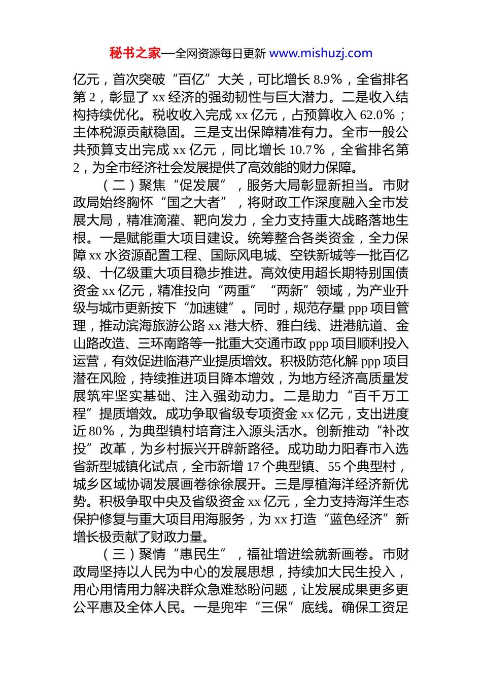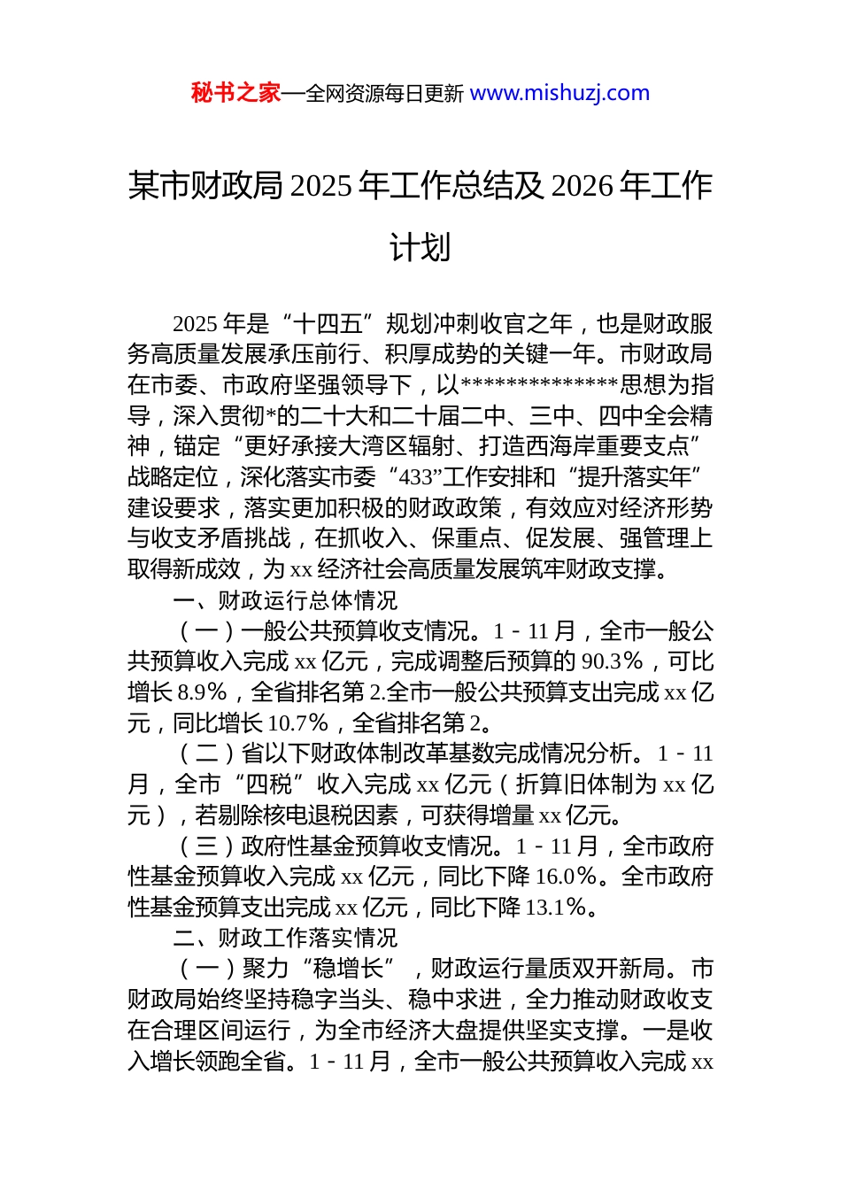 秘书之家—全网资源每日更新 www.mishuzj.com某市财政局 2025 年工作总结及 2026 年工作计划2025 年是“十四五”规划冲刺收官之年,也是财政服务高质量发展承压前行、积厚成势的关键一年。市财政局在市委、市政府坚强领导下,以**************思想为指导,深入贯彻*的二十大和二十届二中、三中、四中全会精神,锚定“更好承接大湾区辐射、打造西海岸重要支点”战略定位,深化落实市委“433”工作安排和“提升落实年”建设要求,落实更加积极的财政政策,有效应对经济形势与收支矛盾挑战,在抓收入、保重点、促发展、强管理上取得新成效,为 xx 经济社会高质量发展筑牢财政支撑。一、财政运行总体情况(一)一般公共预算收支情况。1-11 月,全市一般公共预算收入完成 xx 亿元,完成调整后预算的 90.3%,可比增长 8.9%,全省排名第 2.全市一般公共预算支出完成 xx 亿元,同比增长 10.7%,全省排名第 2。(二)省以下财政体制改革基数完成情况分析。1-11月,全市“四税”收入完成 xx 亿元(折算旧体制为 xx 亿元),若剔除核电退税因素,可获得增量 xx 亿元。(三)政府性基金预算收支情况。1-11 月,全市政府性基金预算收入完成 xx 亿元,同比下降 16.0%。全市政府性基金预算支出完成 xx 亿元,同比下降 13.1%。二、财政工作落实情况(一)聚力“稳增长”,财政运行量质双开新局。市财政局始终坚持稳字当头、稳中求进,全力推动财政收支在合理区间运行,为全市经济大盘提供坚实支撑。一是收入增长领跑全省。1-11 月,全市一般公共预算收入完成 xx秘书之家—全网资源每日更新 www.mishuzj.com亿元,首次突破“百亿”大关,可比增长 8.9%,全省排名第 2,彰显了 xx 经济的强劲韧性与巨大潜力。二是收入结构持续优化。税收收入完成 xx 亿元,占预算收入 62.0%;主体税源贡献稳固。三是支出保障精准有力。全市一般公共预算支出完成 xx 亿元,同比增长 10.7%,全省排名第2,为全市经济社会发展提供了高效能的财力保障。(二)聚焦“促发展”,服务大局彰显新担当。市财政局始终胸怀“国之大者”,将财政工作深度融入全市发展大局,精准滴灌、靶向发力,全力支持重大战略落地生根。一是赋能重大项目建设。统筹整合各类资金,全力保障 xx 水资源配置工程、国际风电城、空铁新城等一批百亿级、十亿级重大项目稳步推进。高效使用超长期特别国债资金 xx 亿元,精准投向“两重”“两新”领域,为产业升级与城市更新按下“加速键”。同时,规范存量 ppp 项目管理,推动滨海旅游公路 xx 港大桥、雅白线、进港航道、金山路改造、三环南路等一批重大交通市政 ppp 项目顺利投入运营,有效促进临港产业提质增效。积极防范化解 ppp 项目潜在风险,持续推进项目降本增效,为地方经济高质量发展筑牢坚实基础、注入强劲动力。二是助力“百千万工程”提质增效。成功争取省级专项资金 xx 亿元,支出进度近 80%,为典型镇村培育注入源头活水。创新推动“补改投”改革,为乡村振兴开辟新路径。成功助力阳春市入选省新型城镇化试点,全市新增 17 个典型镇、55 个典型村,城乡区域协调发展画卷徐徐展开。三是厚植海洋经济新优势。积极争取中央及省级资金 xx 亿元,全力支持海洋生态保护修复与重大项目用海服务,为 xx 打造“蓝色经济”新增长极贡献了财政力量。(三)聚情“惠民生”,福祉增进绘就新画卷。市财政局坚持以人民为中心的发展思想,持续加大民生投入,用心用情用力解决群众急难愁盼问题,让发展成果更多更公平惠及全体人民。一是兜牢“三保”底线。确保工资足秘书之家—全网资源每日更新 www.mishuzj.com额发放、基本民生应保尽保、政府高效运转,切实维护了社会大局和谐稳定。二是民生保障温暖人心。城乡低保标准稳步提高,特困人员供养政策全面落实,全市城镇、农村低保平均补差水平每人每月分别提高至 xx 元和 xx 元;特困人员基本生活标准提高到不低于当地城乡最低生活保障标准的 1.6 倍。就业创业服务体系日益健全,1-11 月,及时下达补助资金 xx 亿元,发放各类补贴超 xx 万元,为稳就业保民生...